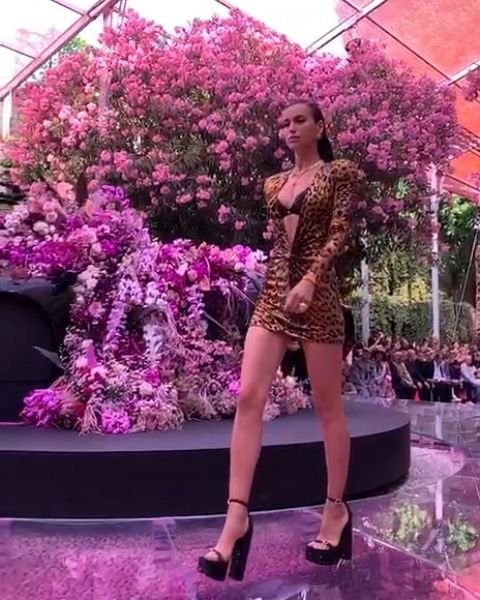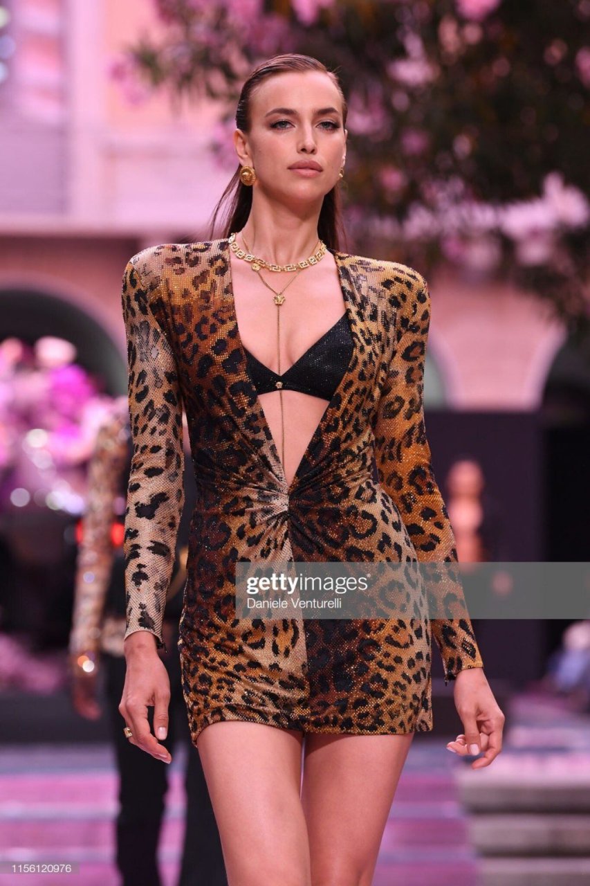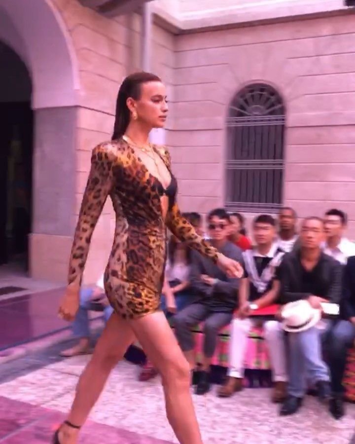 Irina apareció en el desfile con un mini vestido de leopardo con un escote profundo, mostrando su cintura delgada y piernas sexys!