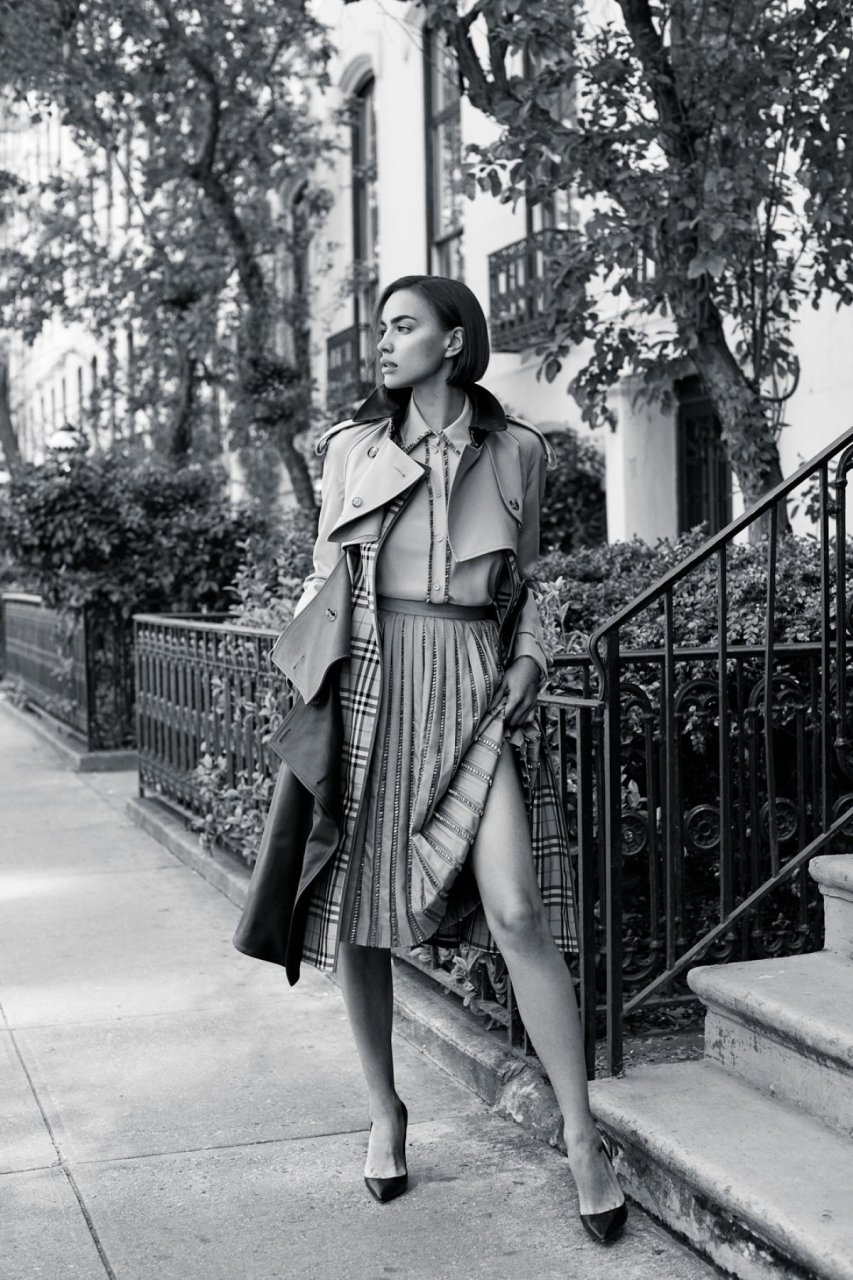 Las imágenes acompañantes incluyen looks glamorosos estilizados por Charles Varenne. Irina lleva un vestuario con etiquetas como Burberry, Bulgari y Carolina Herrera.