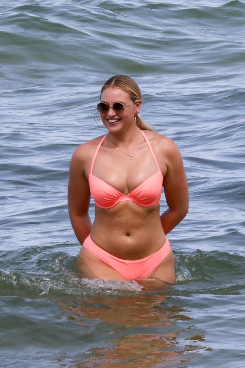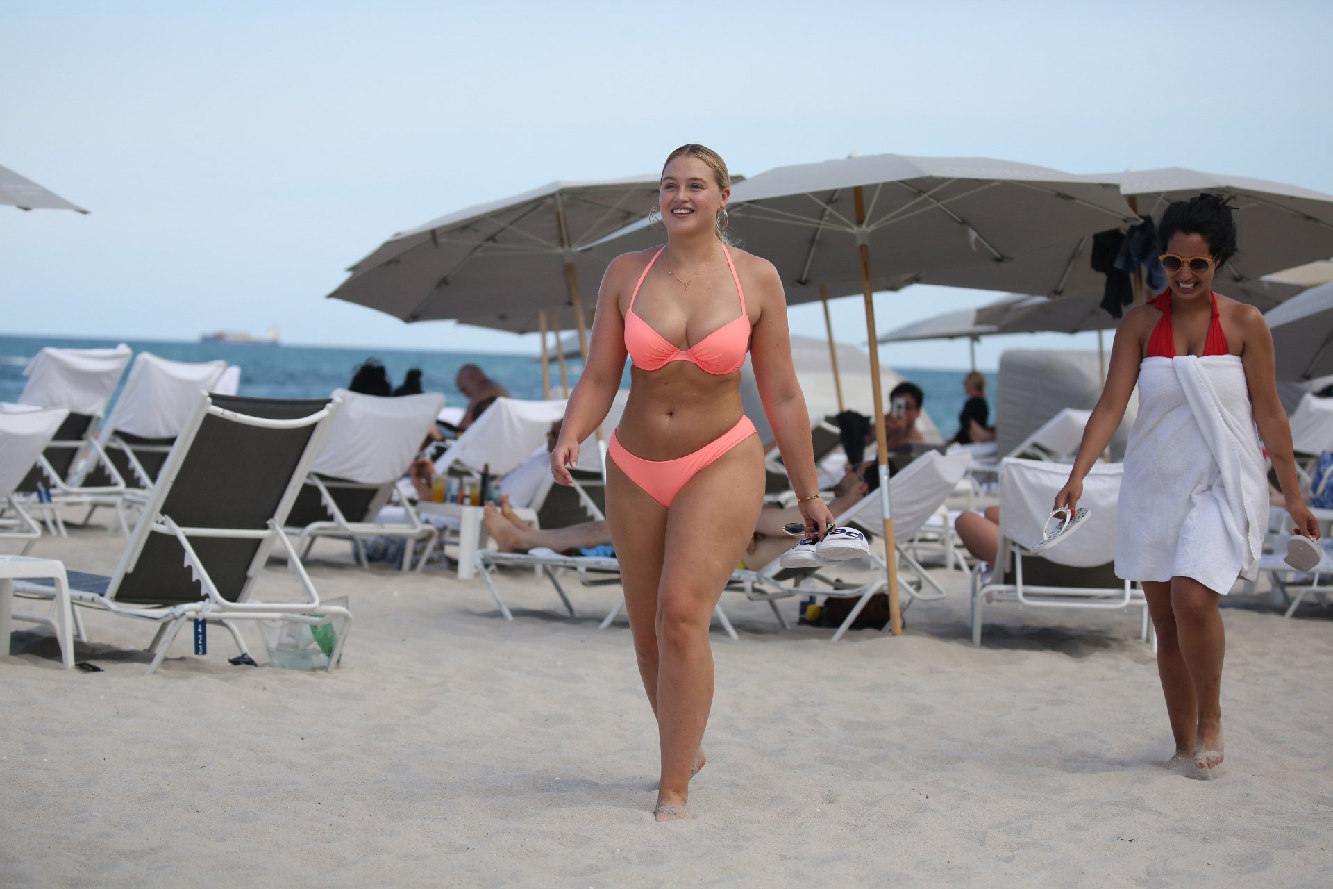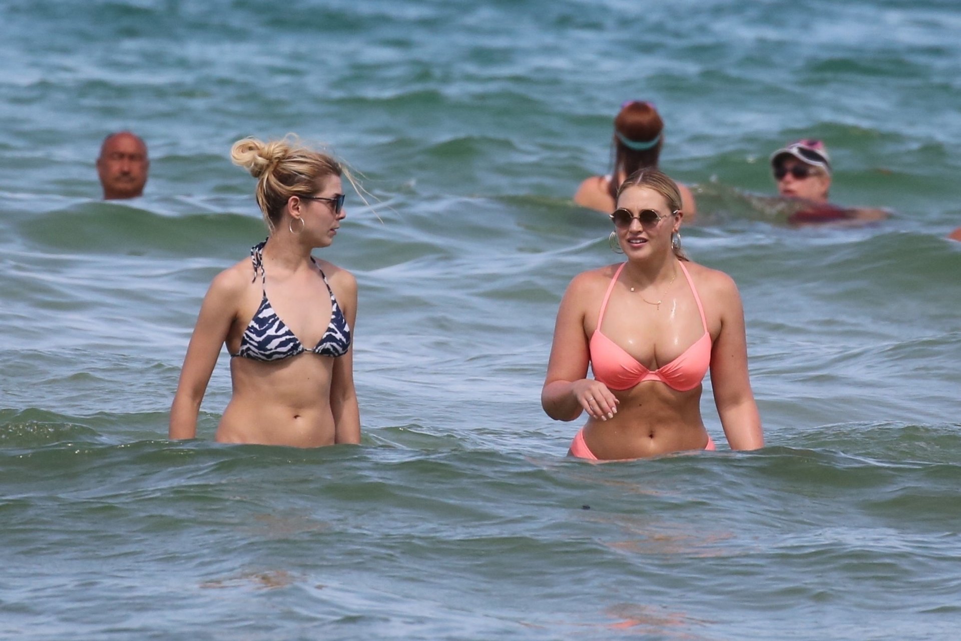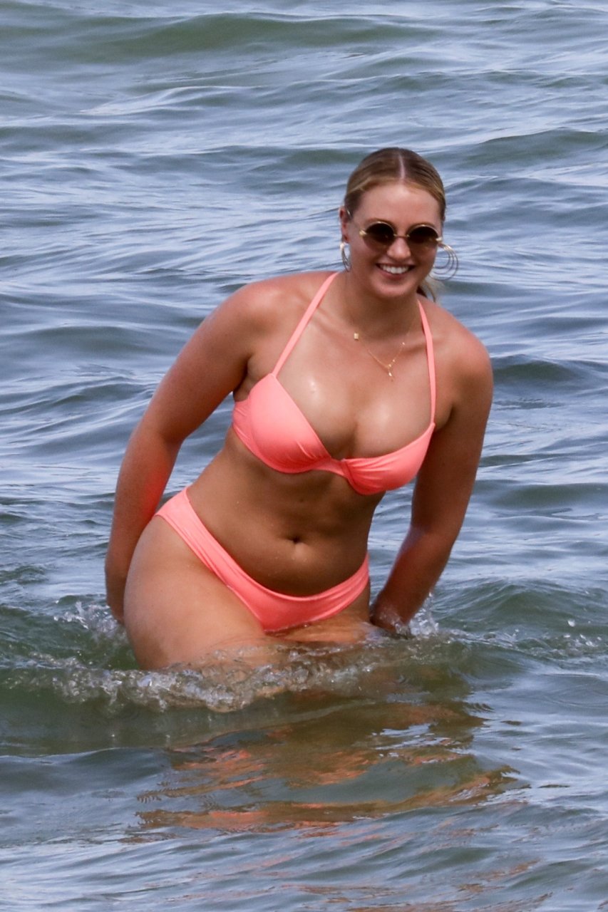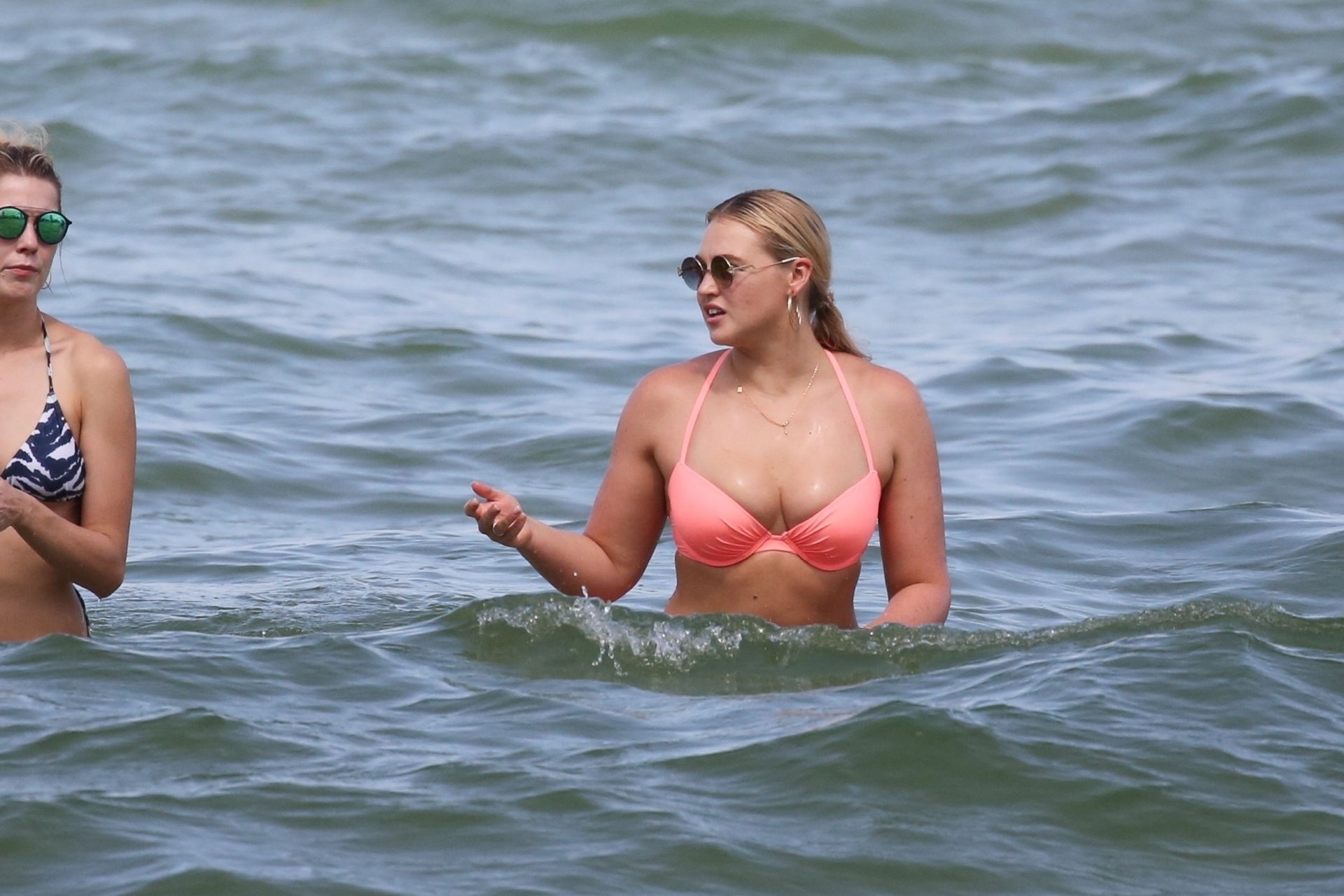 La modelo Iskra Lawrence (27) muestra su figura curvilínea con un diminuto bikini rosa mientras disfruta de un día soleado con amigos en la playa de Miami, 13/07/2018.
