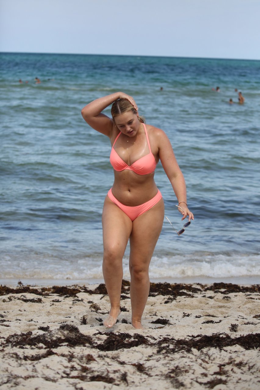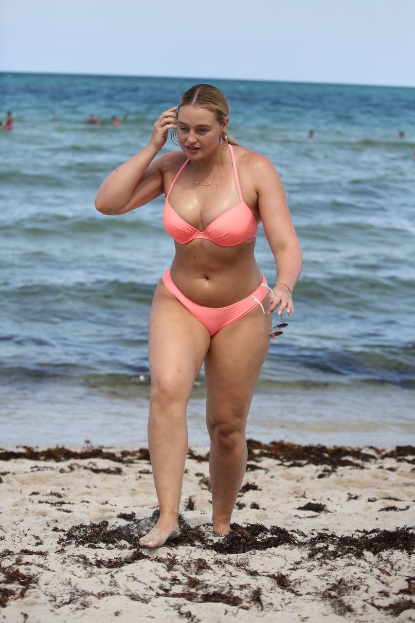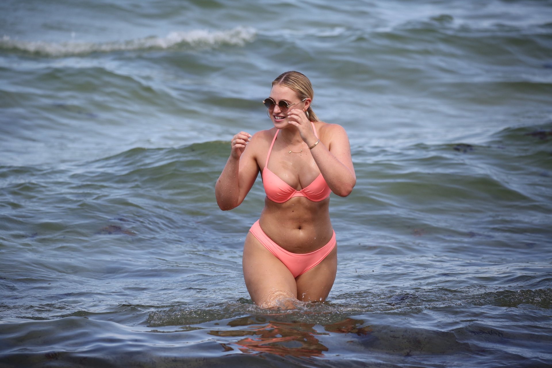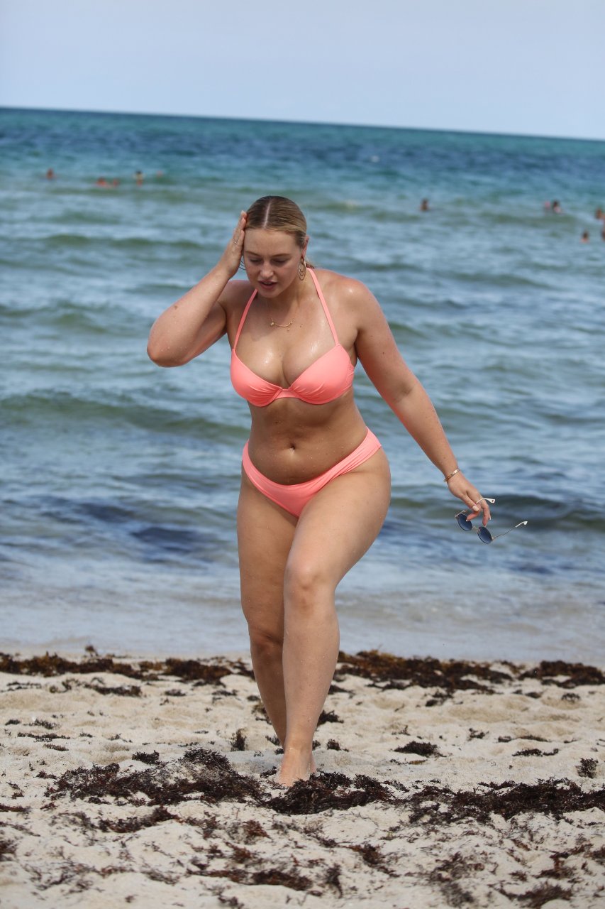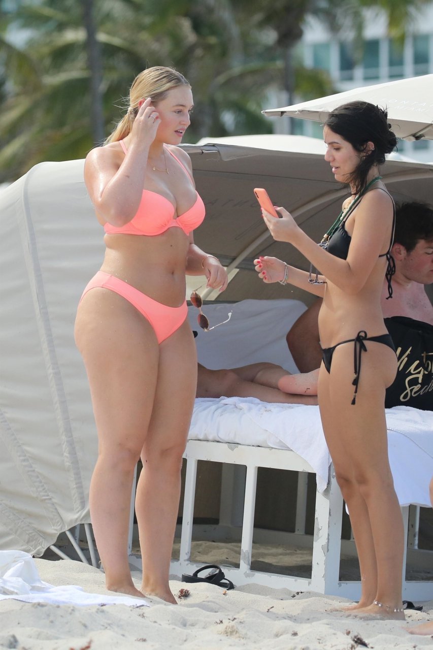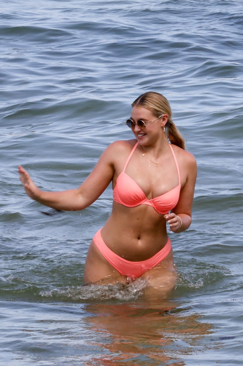 La modelo Iskra Lawrence (27) muestra su figura curvilínea con un diminuto bikini rosa mientras disfruta de un día soleado con amigos en la playa de Miami, 13/07/2018.