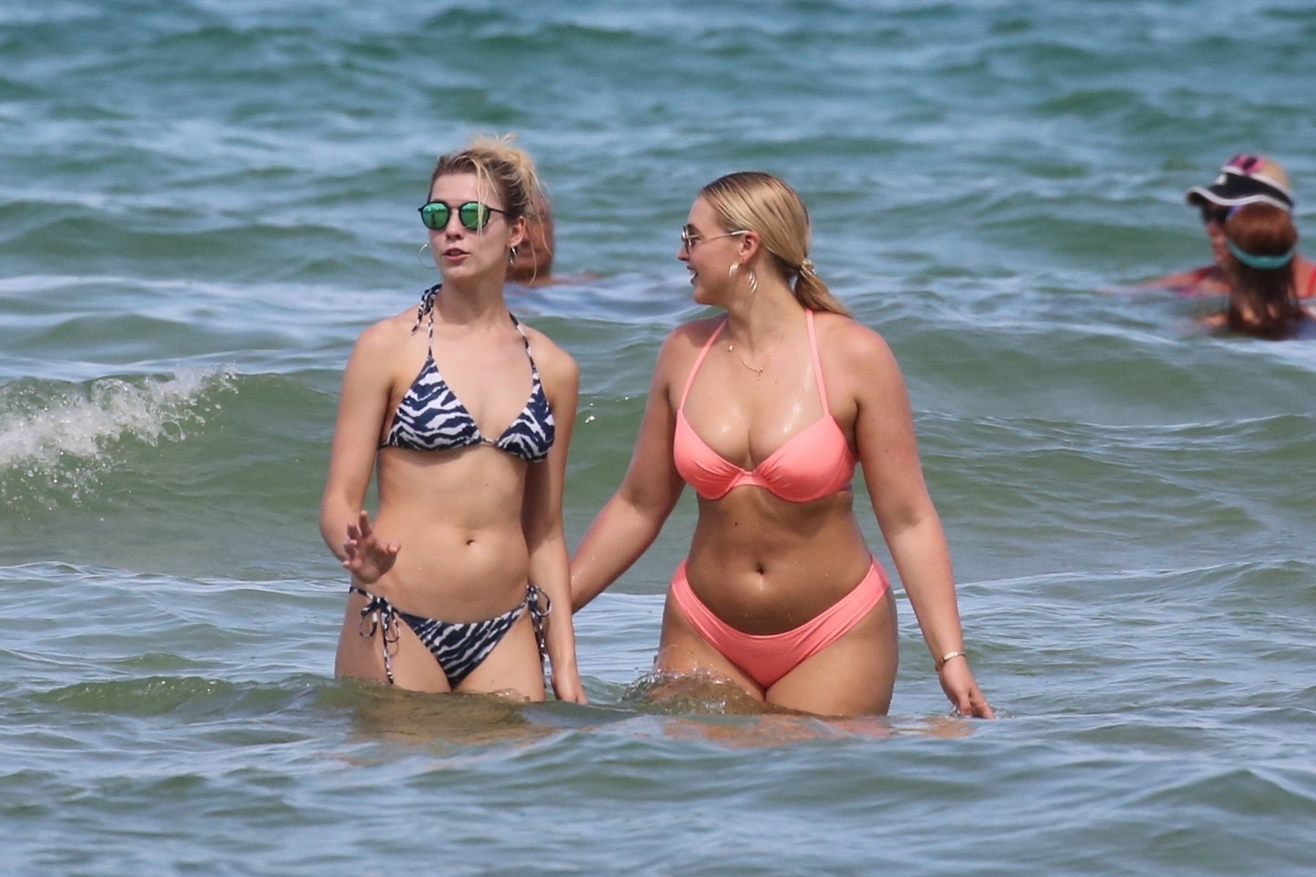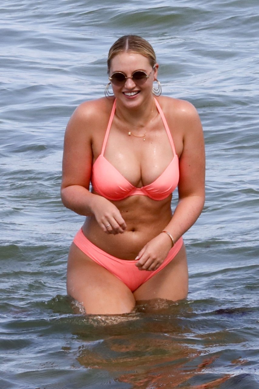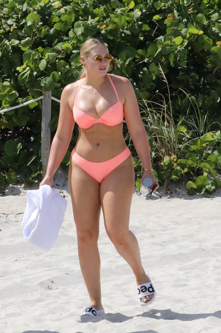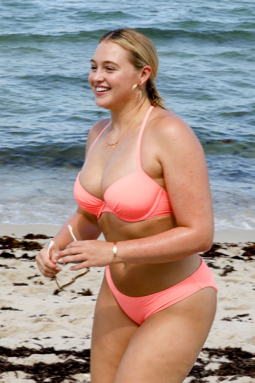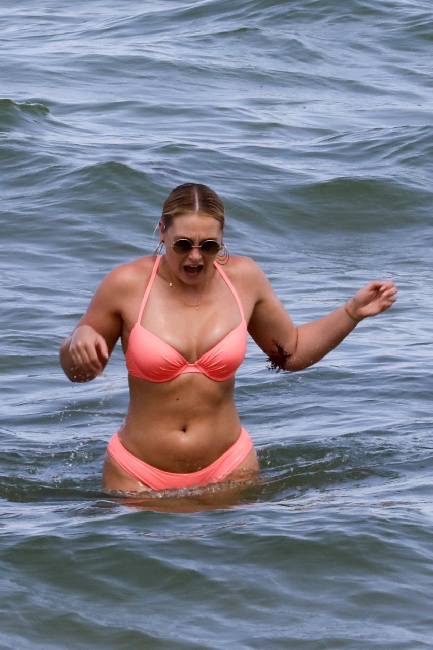 La modelo Iskra Lawrence (27) muestra su figura curvilínea con un diminuto bikini rosa mientras disfruta de un día soleado con amigos en la playa de Miami, 13/07/2018.