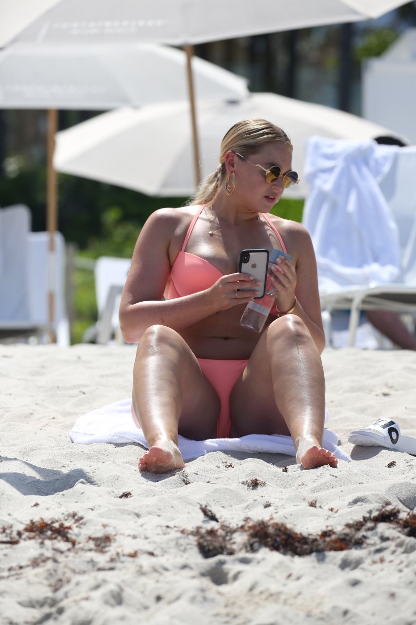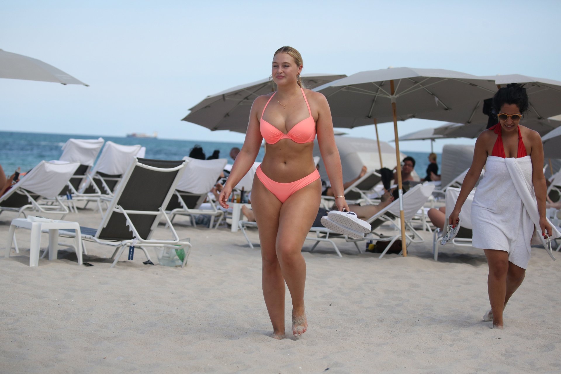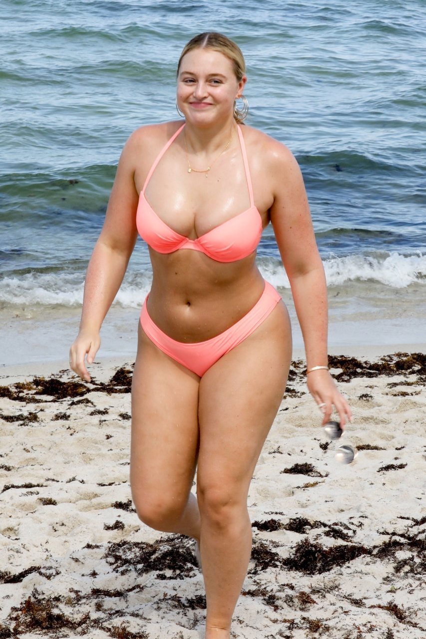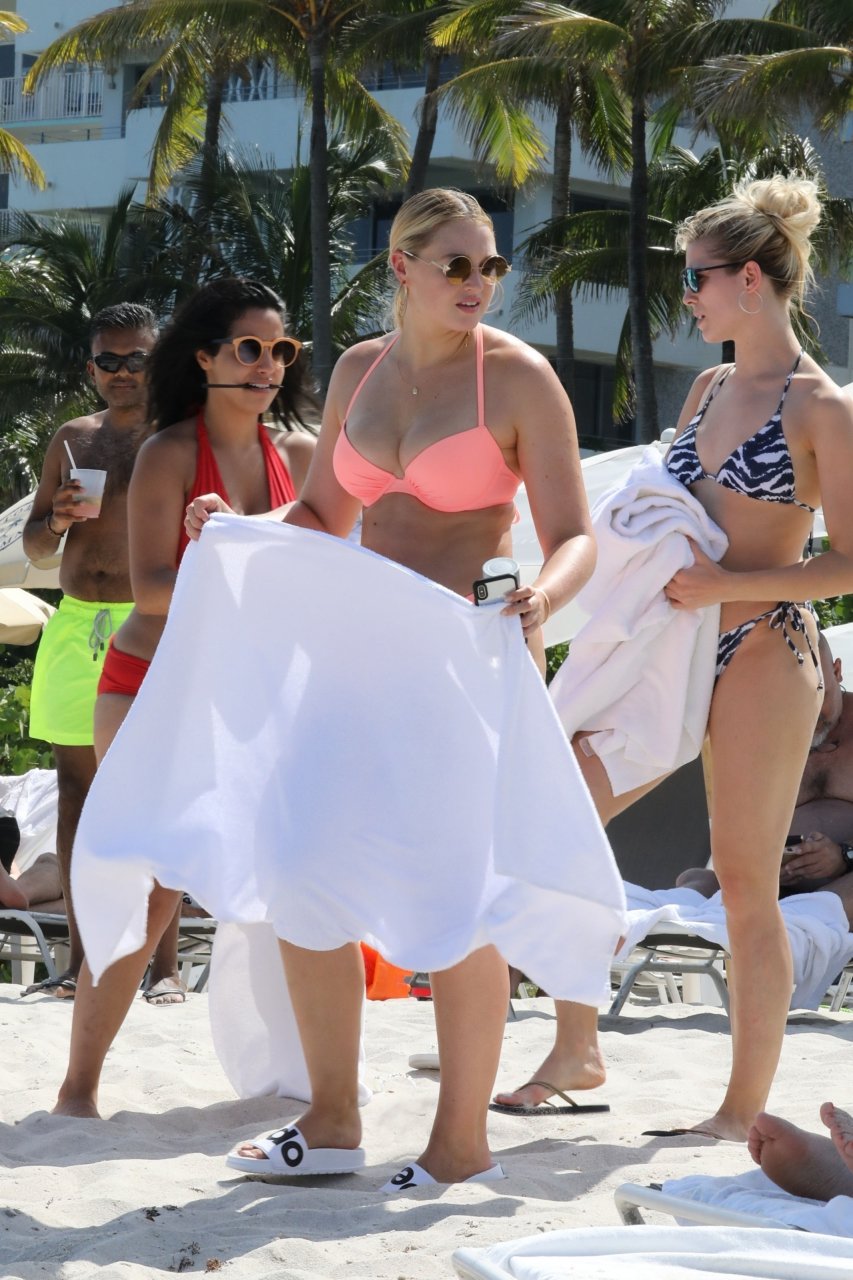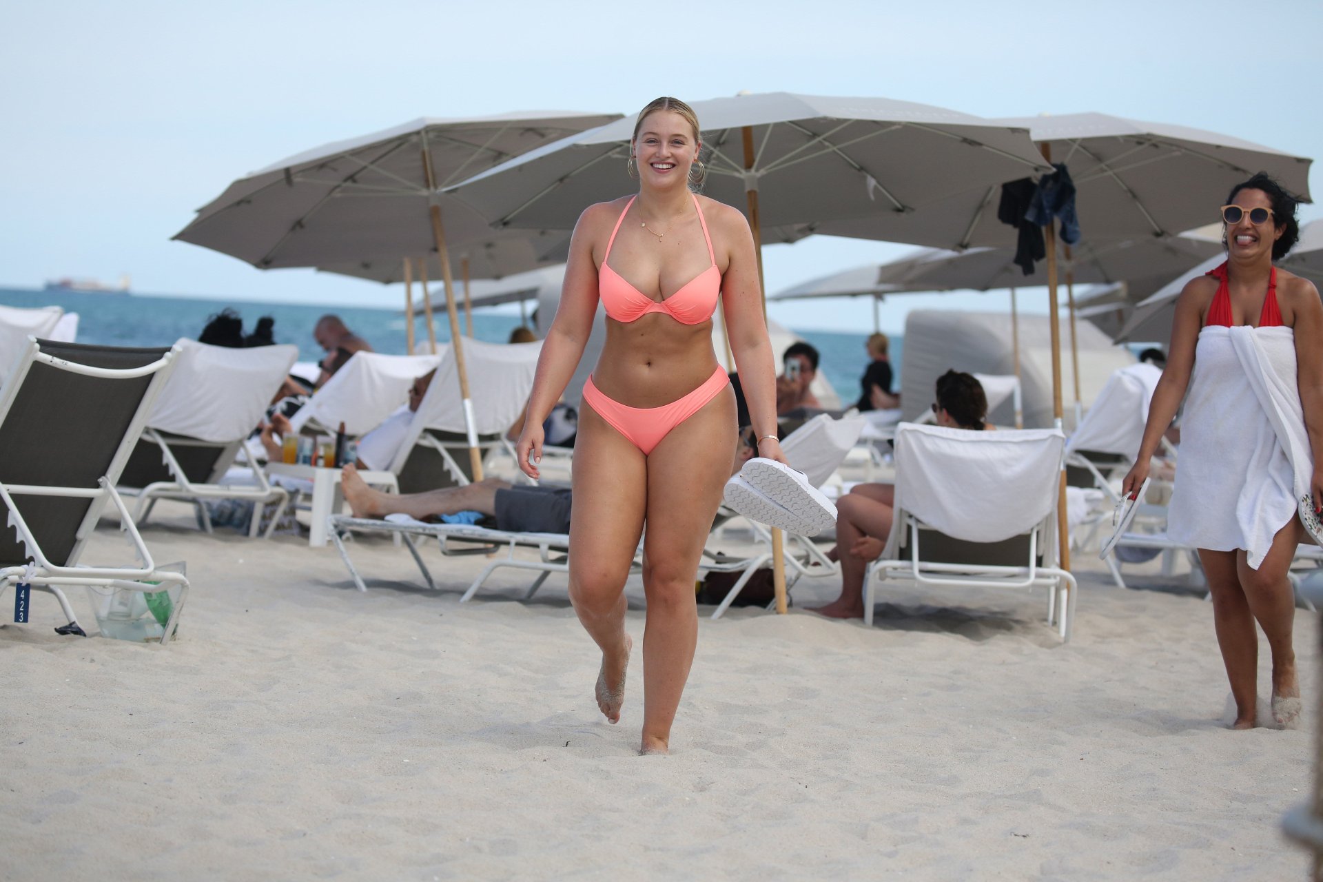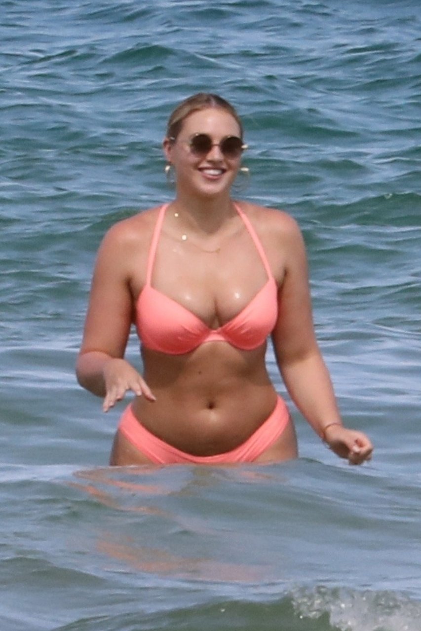 La modelo Iskra Lawrence (27) muestra su figura curvilínea con un diminuto bikini rosa mientras disfruta de un día soleado con amigos en la playa de Miami, 13/07/2018.