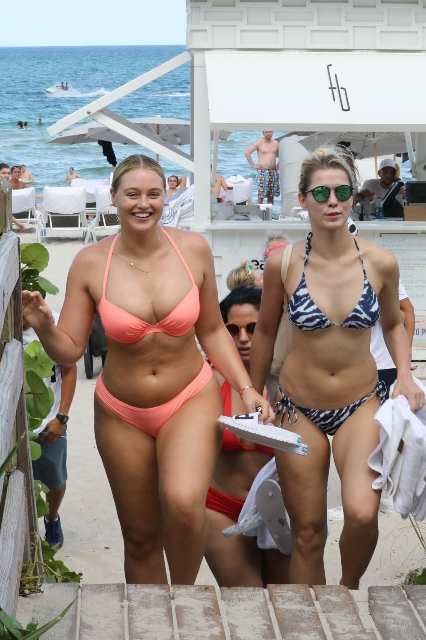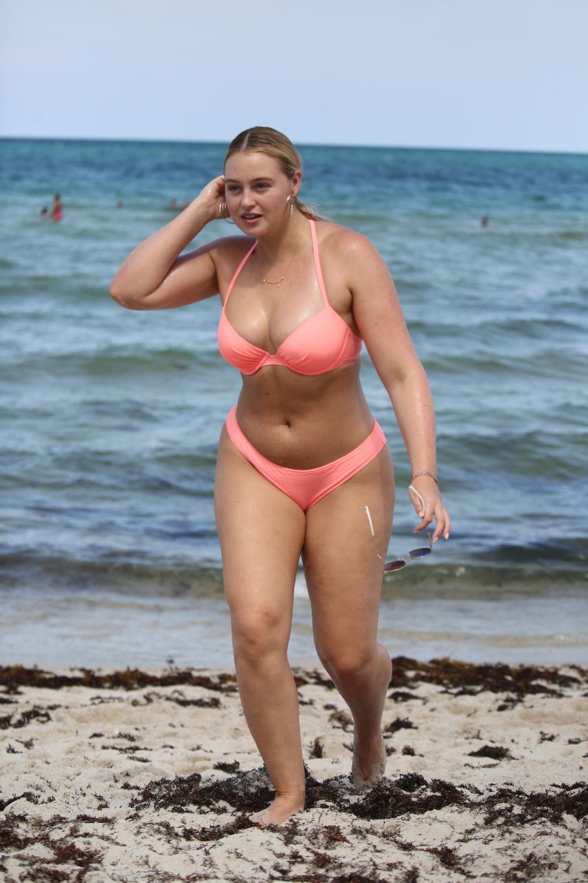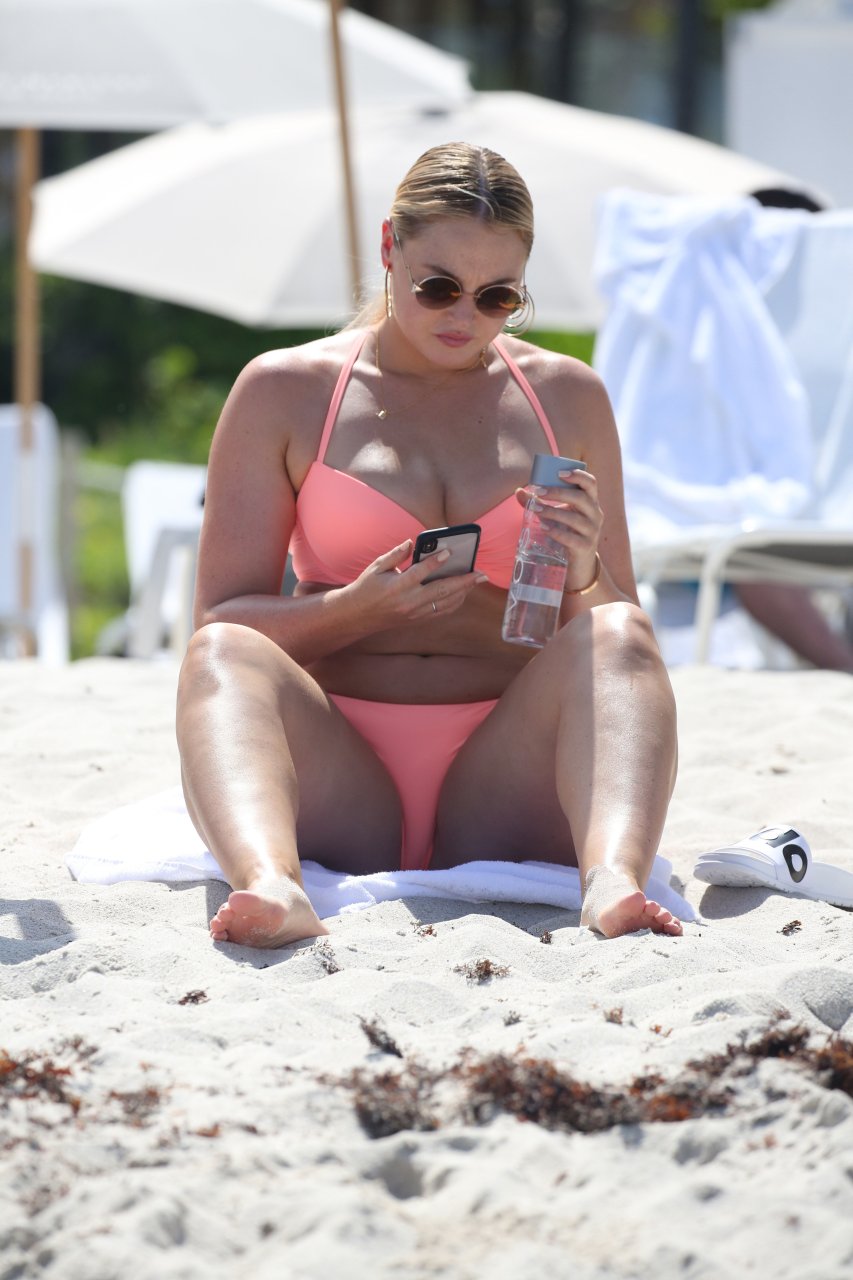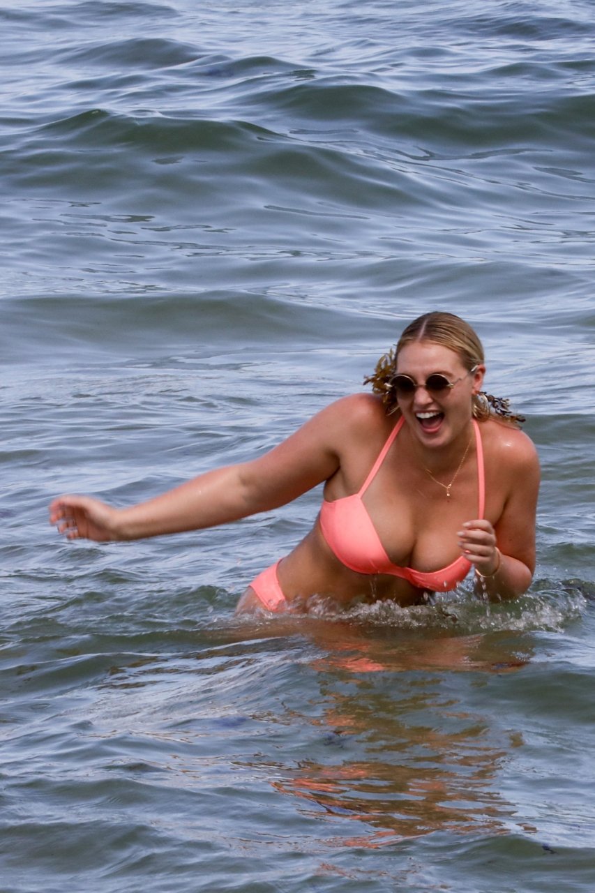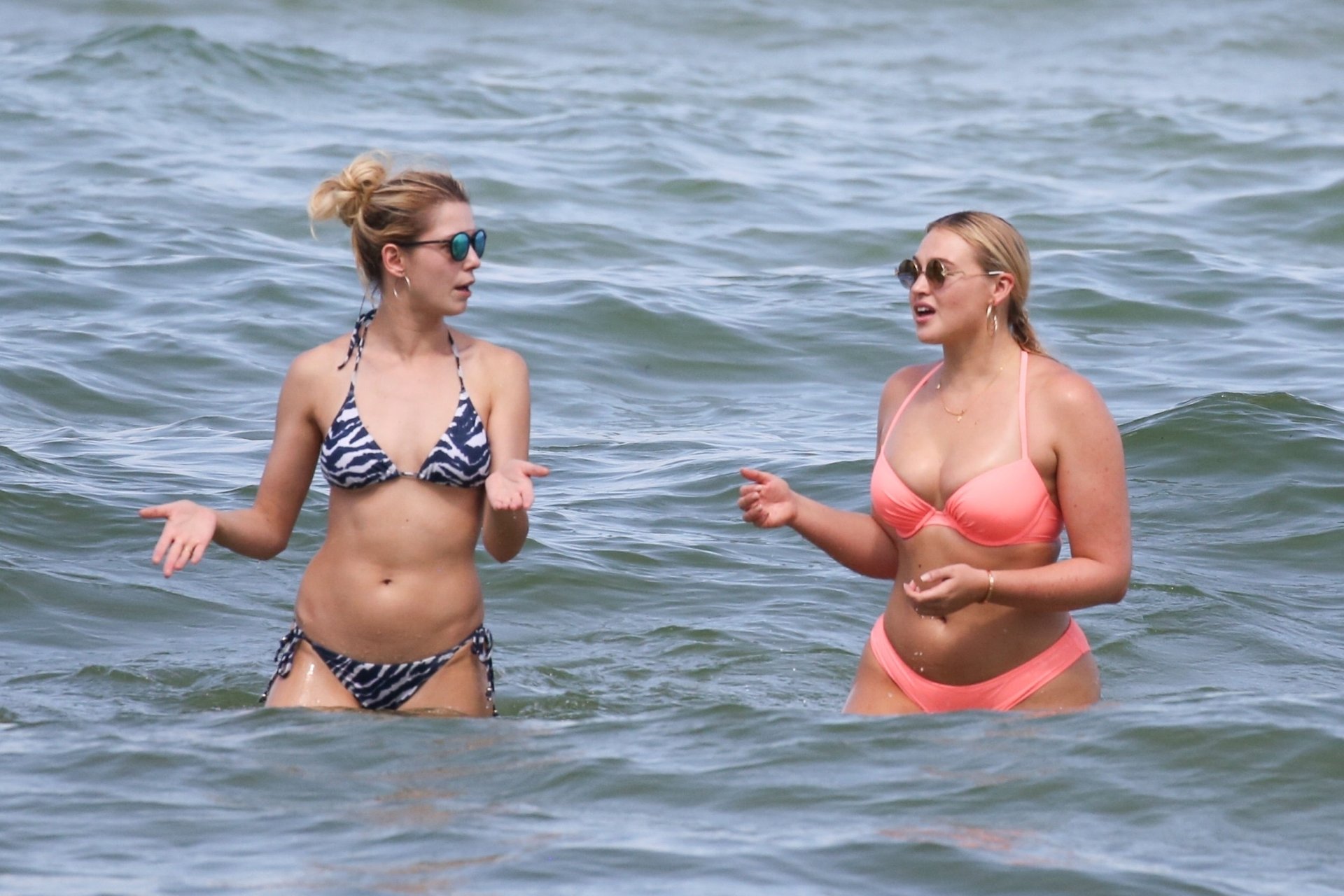 La modelo Iskra Lawrence (27) muestra su figura curvilínea con un diminuto bikini rosa mientras disfruta de un día soleado con amigos en la playa de Miami, 13/07/2018.