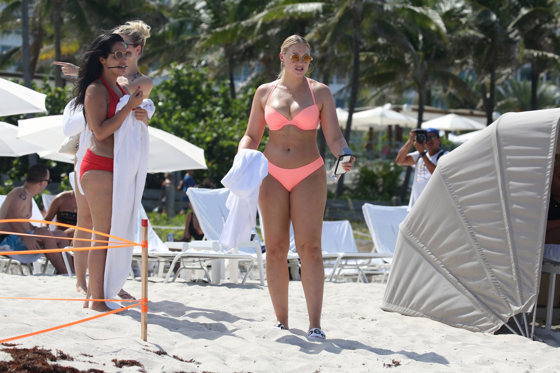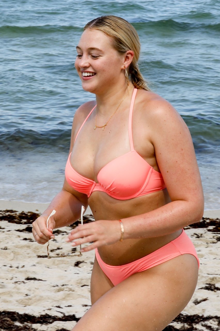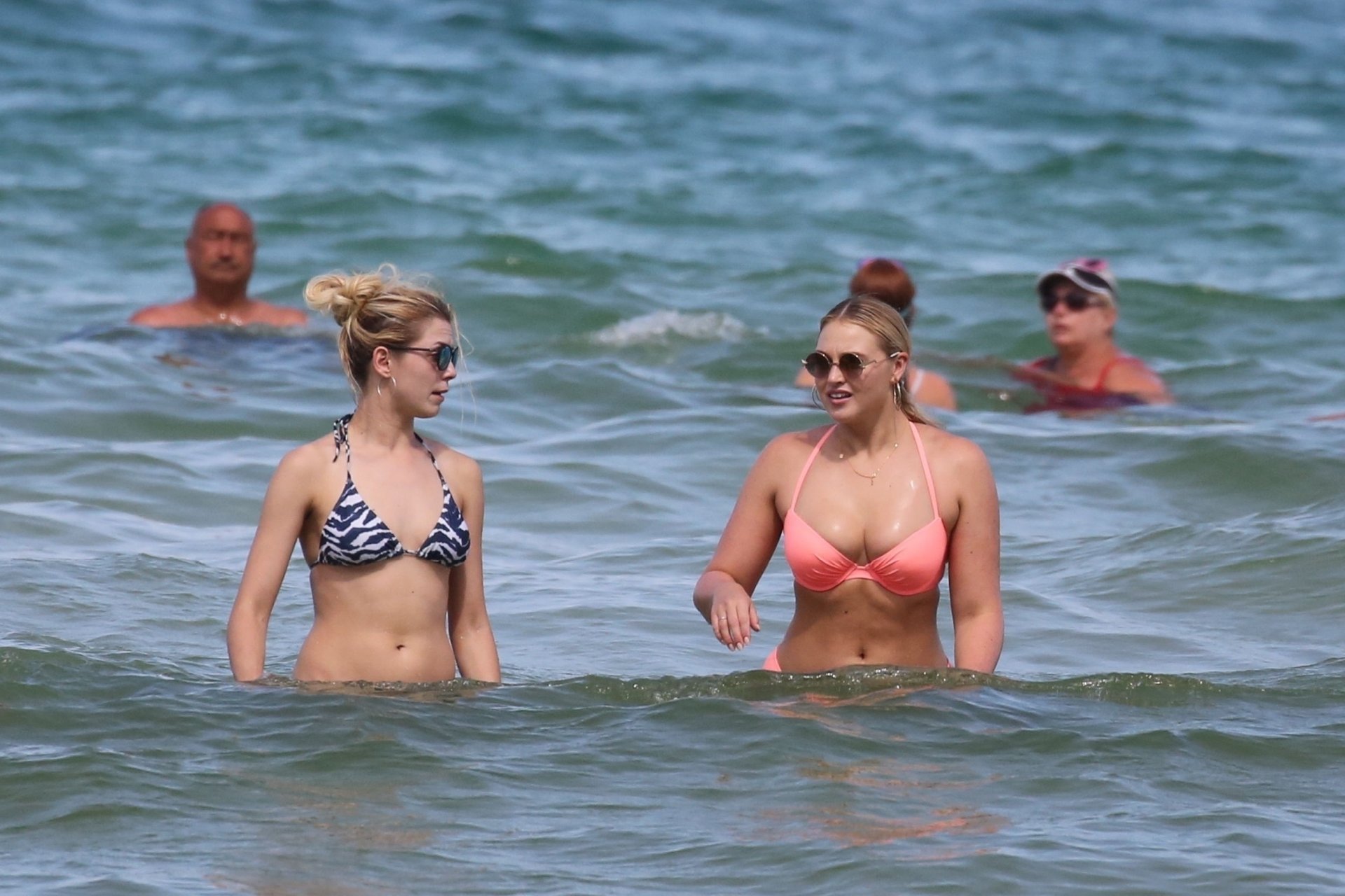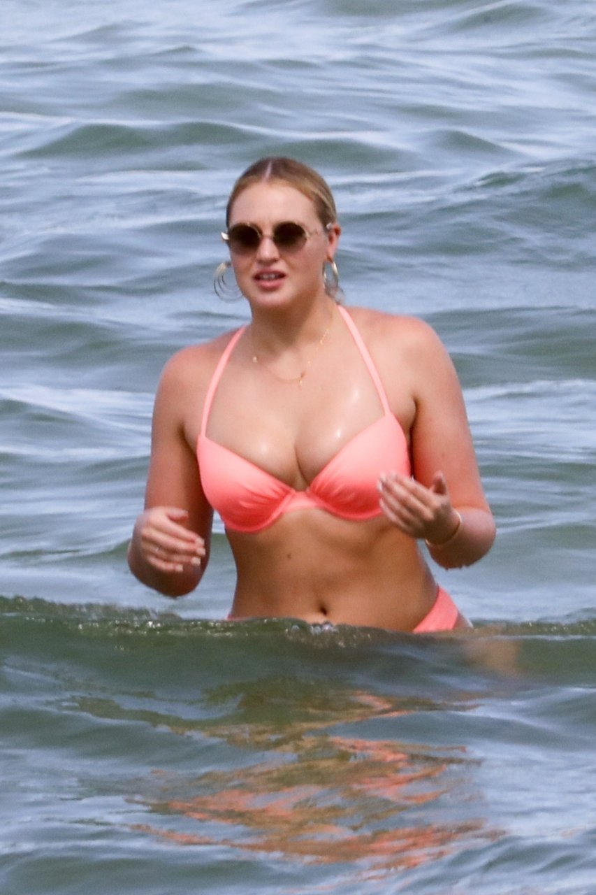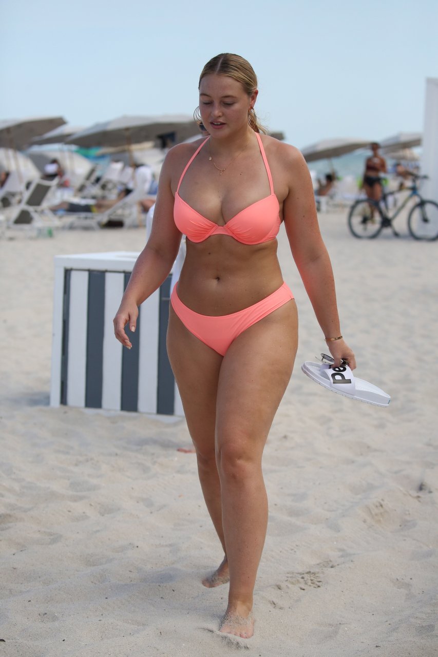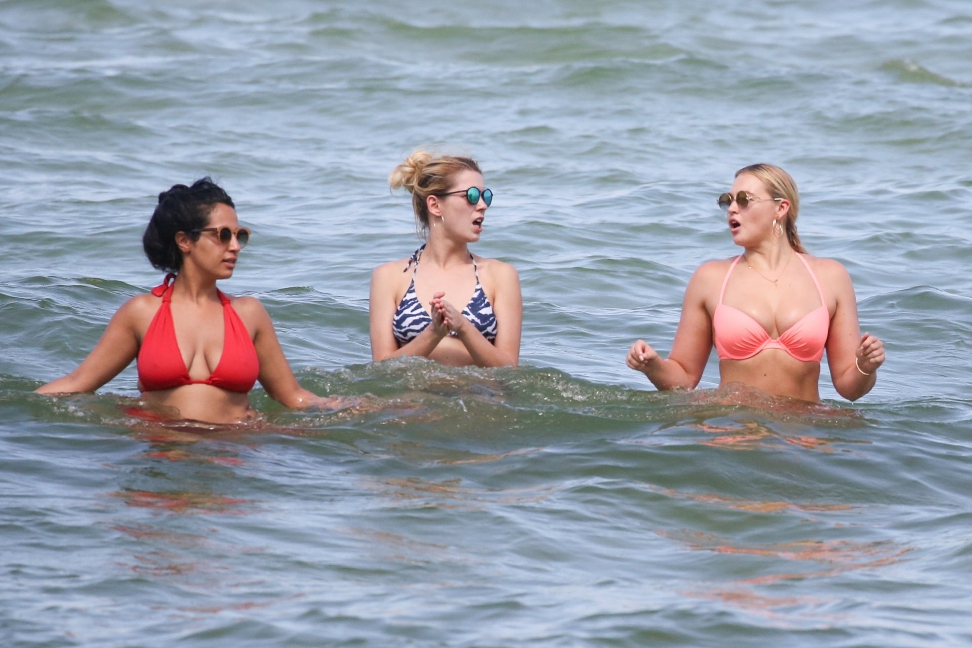 La modelo Iskra Lawrence (27) muestra su figura curvilínea con un diminuto bikini rosa mientras disfruta de un día soleado con amigos en la playa de Miami, 13/07/2018.