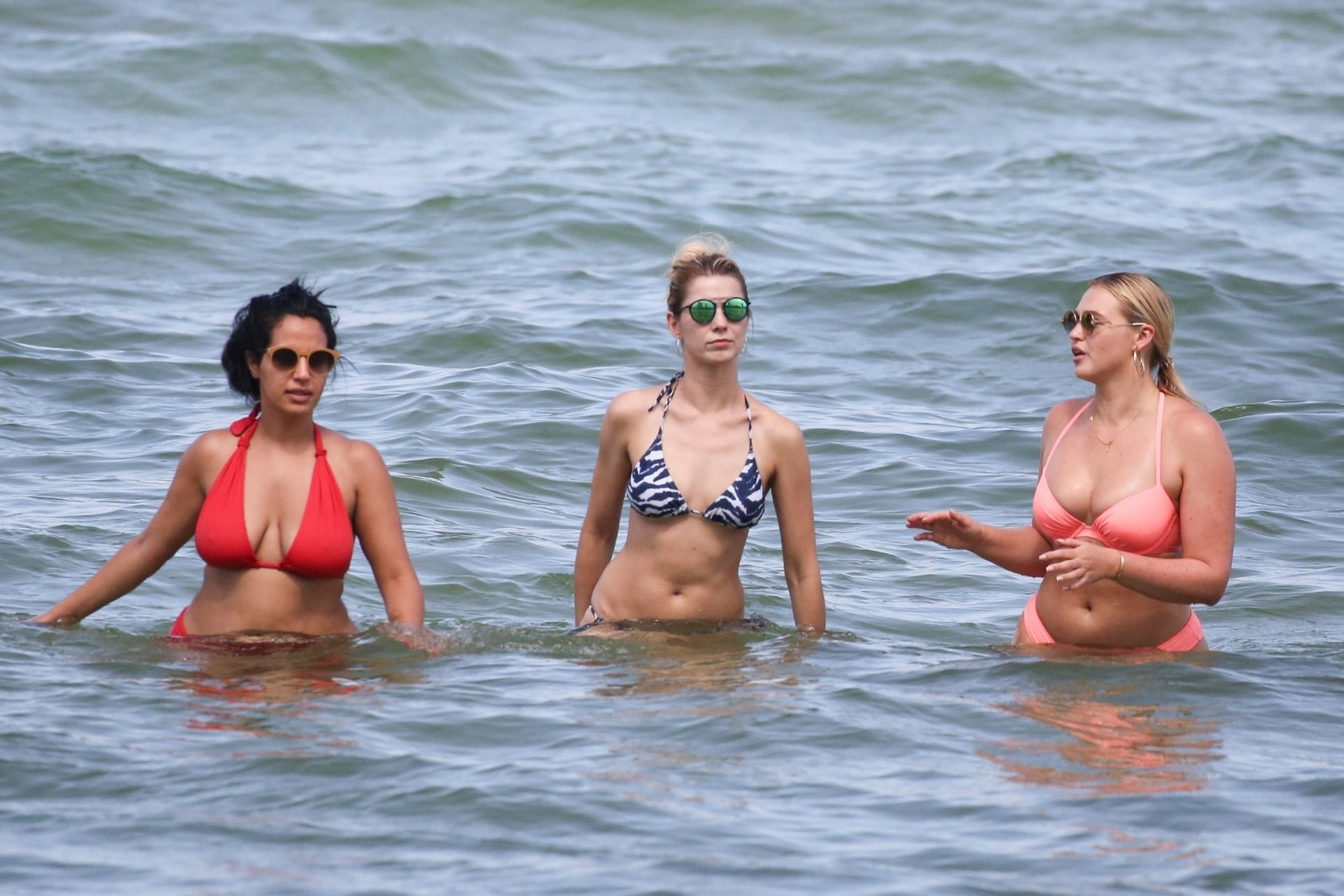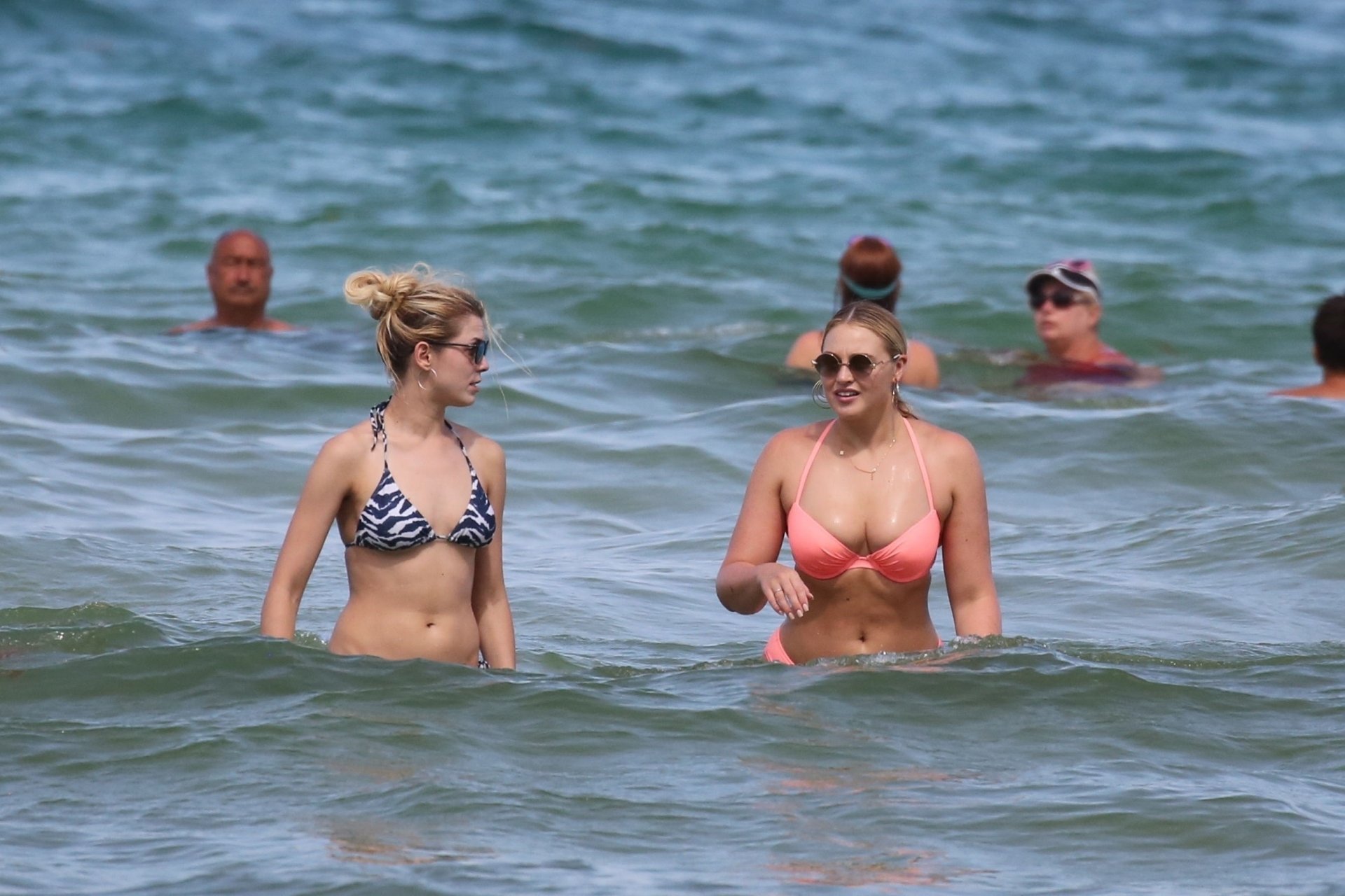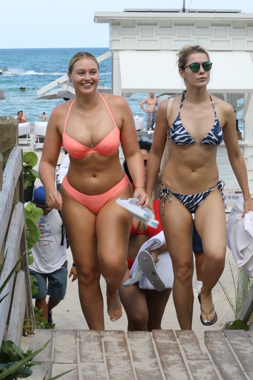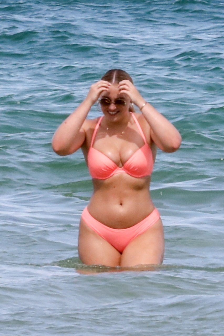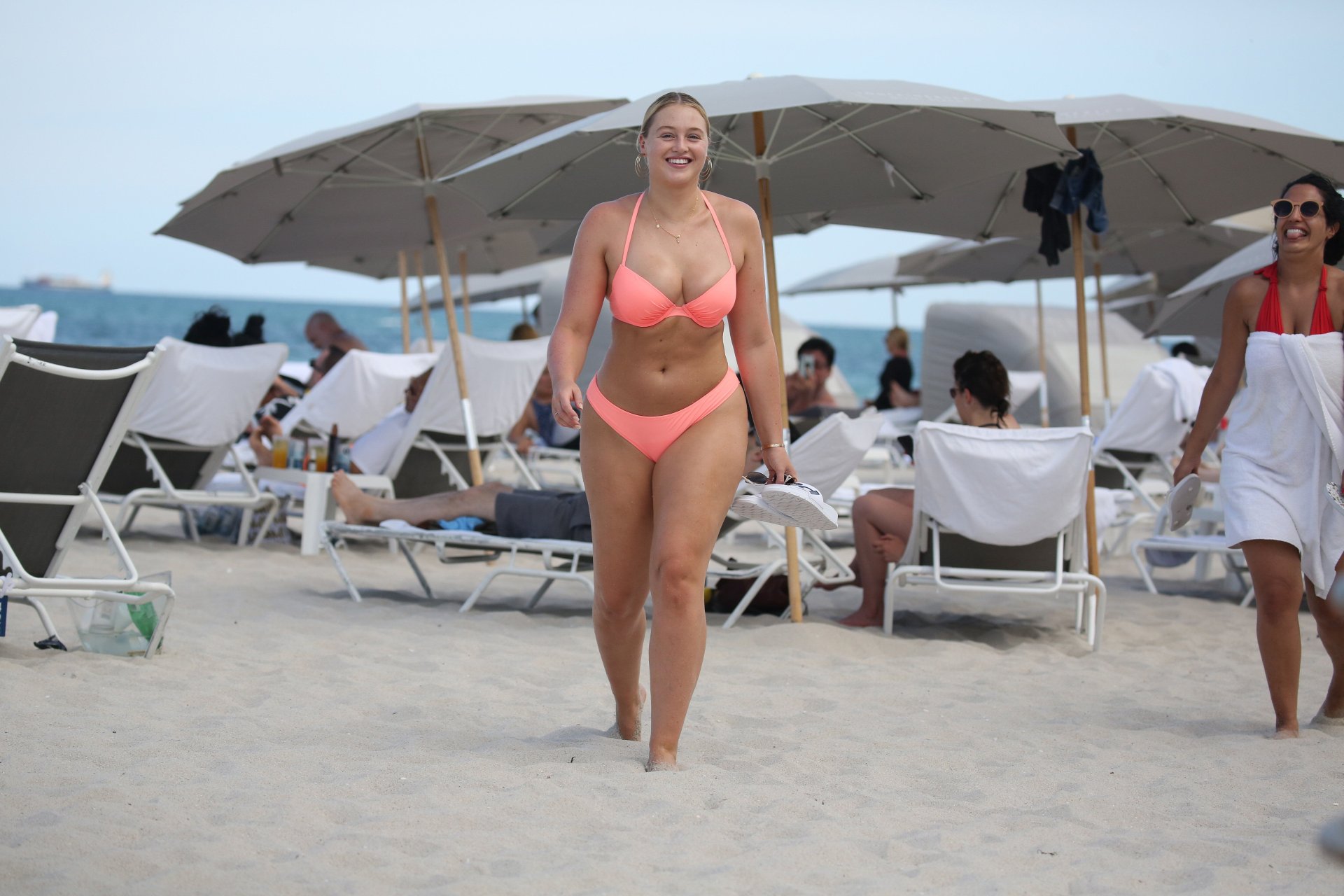 La modelo Iskra Lawrence (27) muestra su figura curvilínea con un diminuto bikini rosa mientras disfruta de un día soleado con amigos en la playa de Miami, 13/07/2018.
