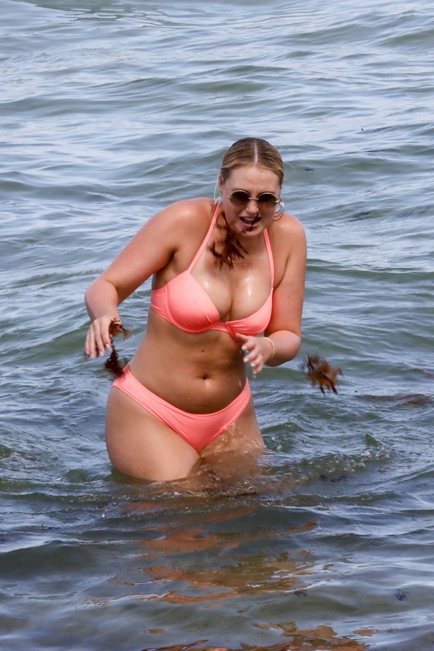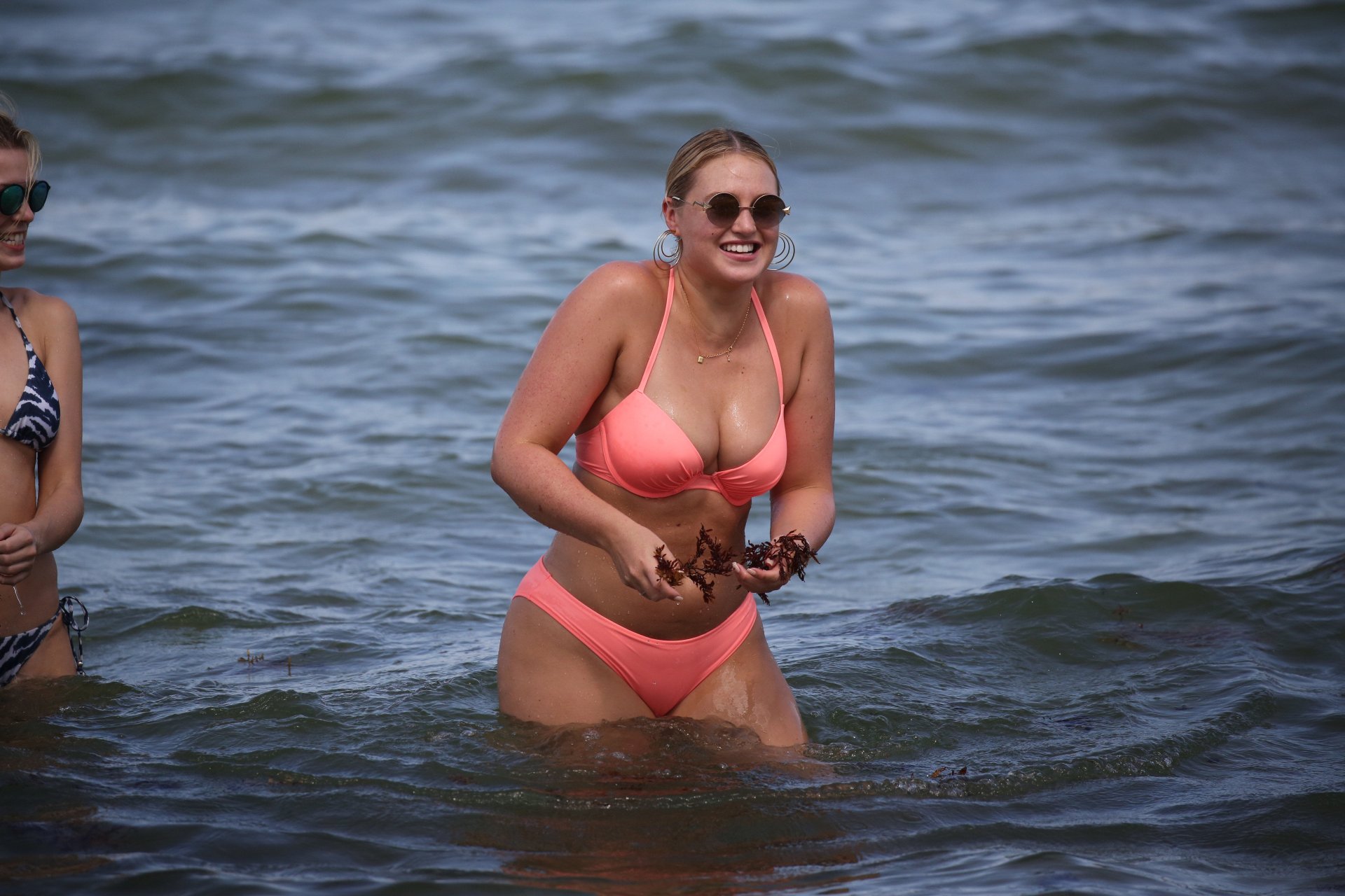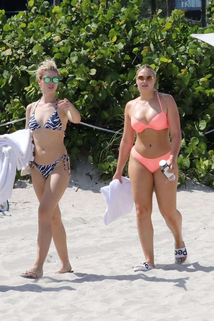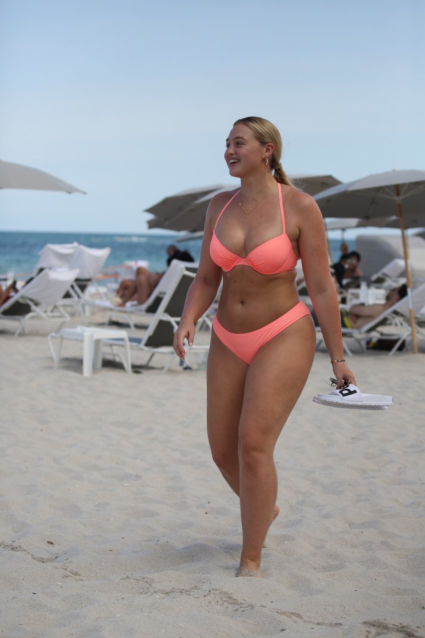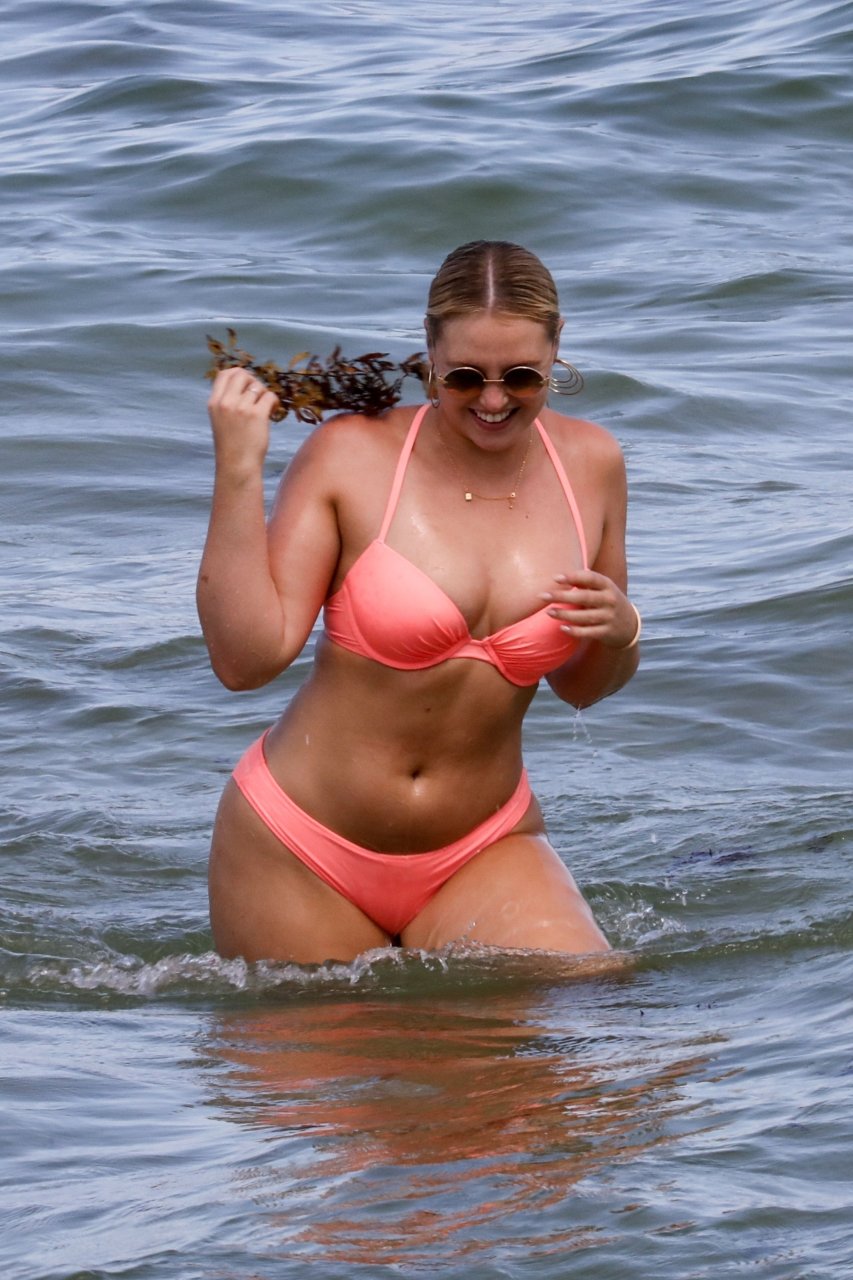 La modelo Iskra Lawrence (27) muestra su figura curvilínea con un diminuto bikini rosa mientras disfruta de un día soleado con amigos en la playa de Miami, 13/07/2018.