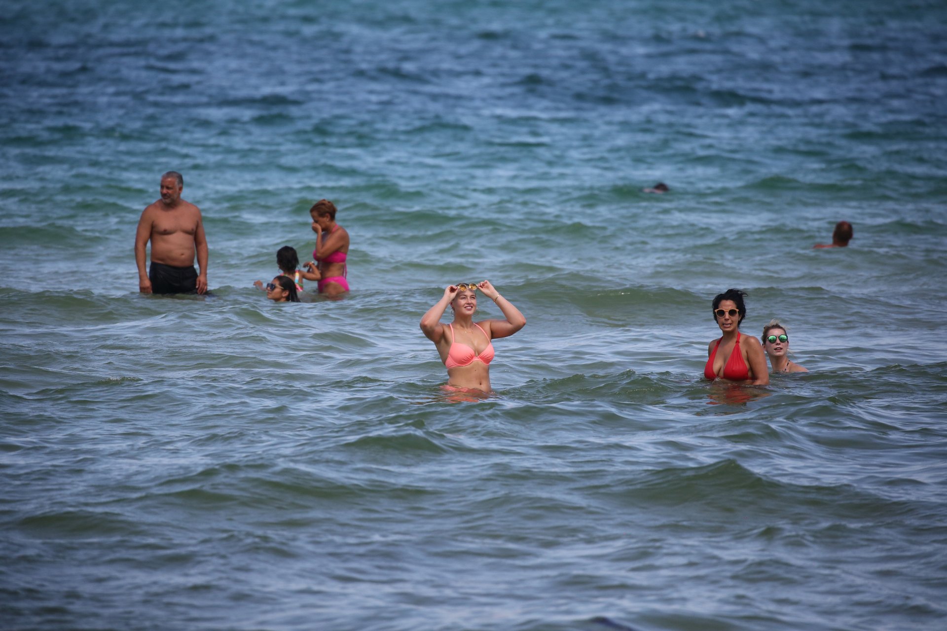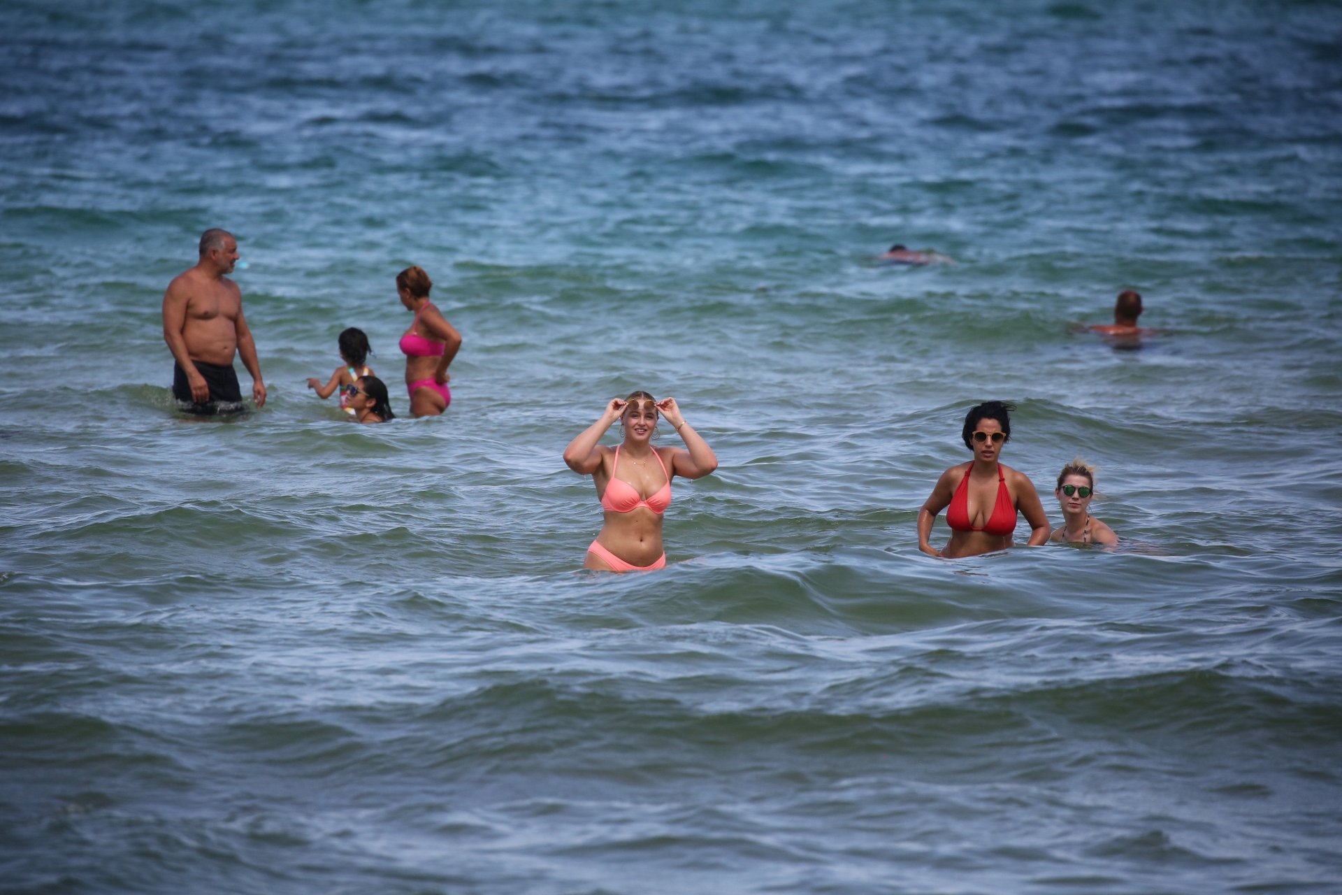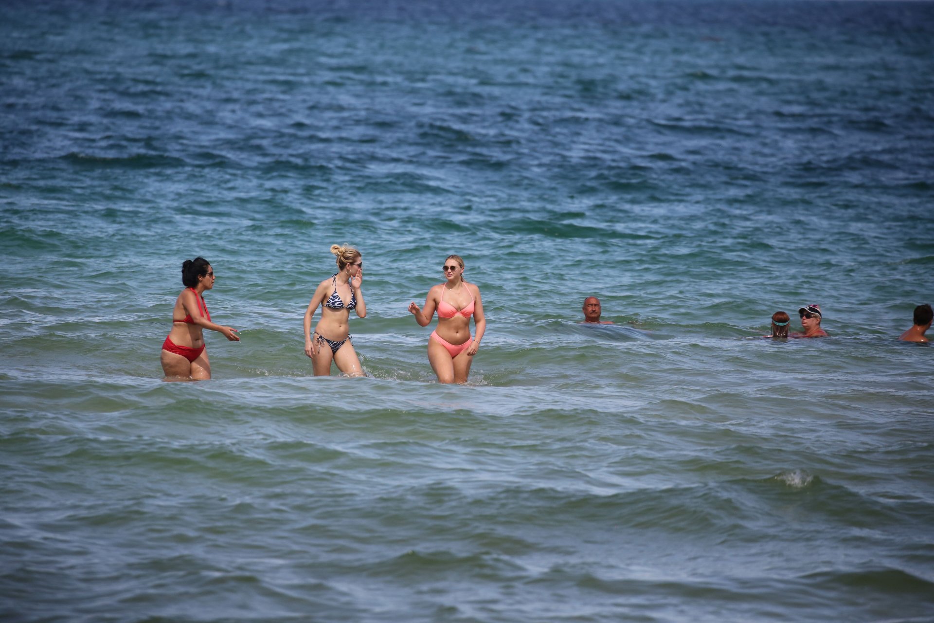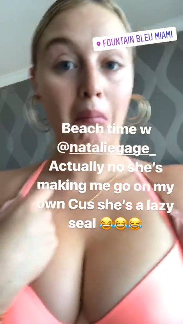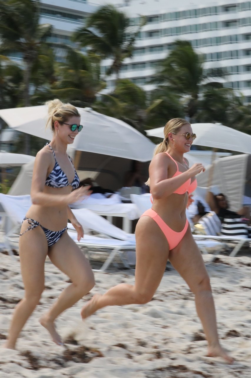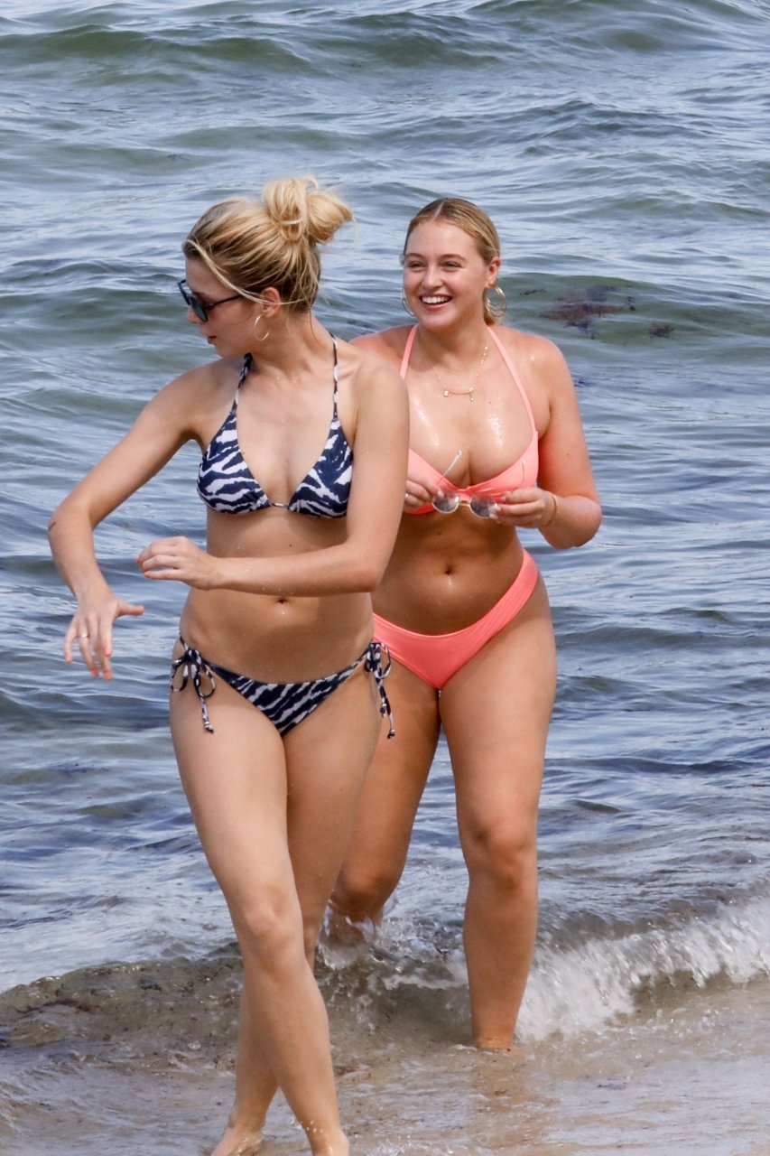 La modelo Iskra Lawrence (27) muestra su figura curvilínea con un diminuto bikini rosa mientras disfruta de un día soleado con amigos en la playa de Miami, 13/07/2018.
