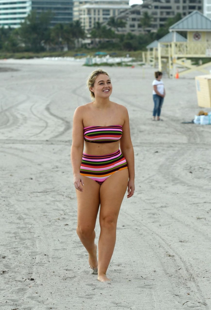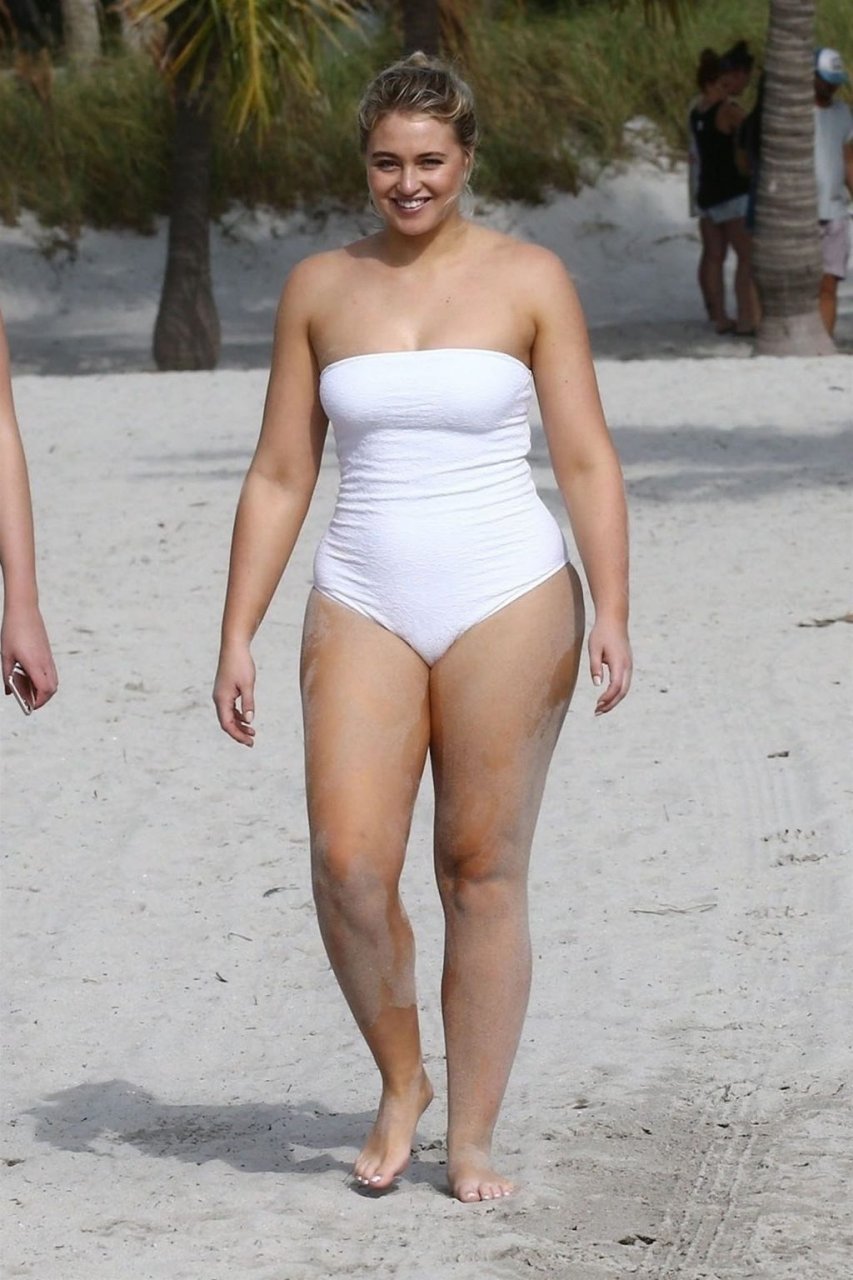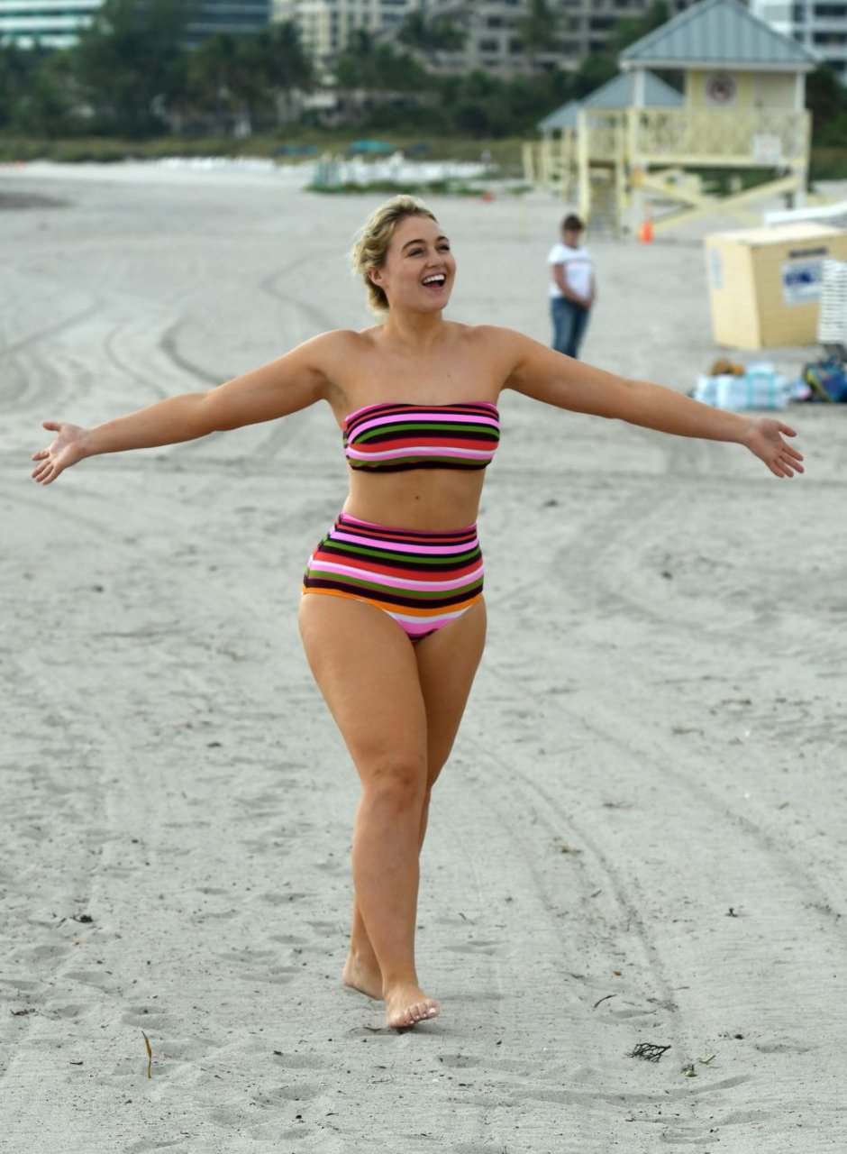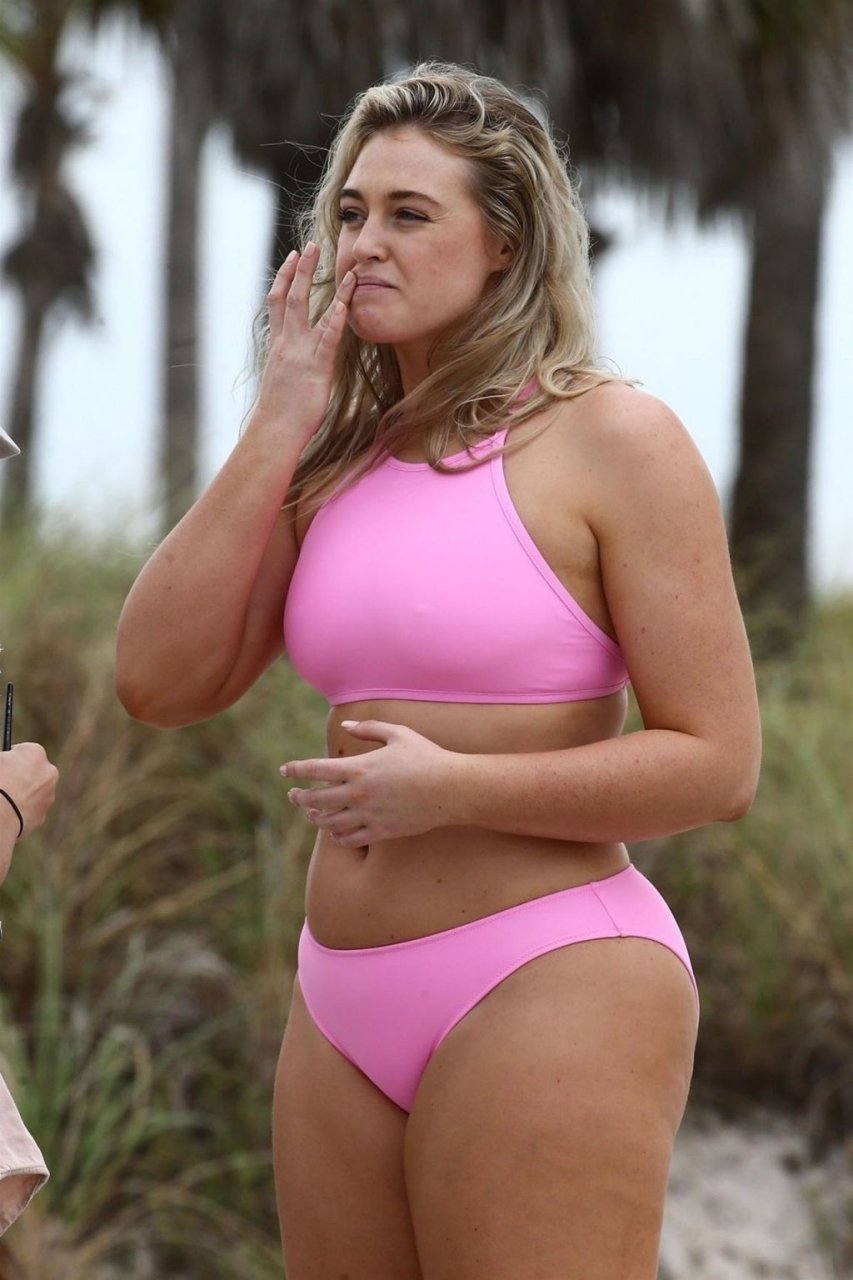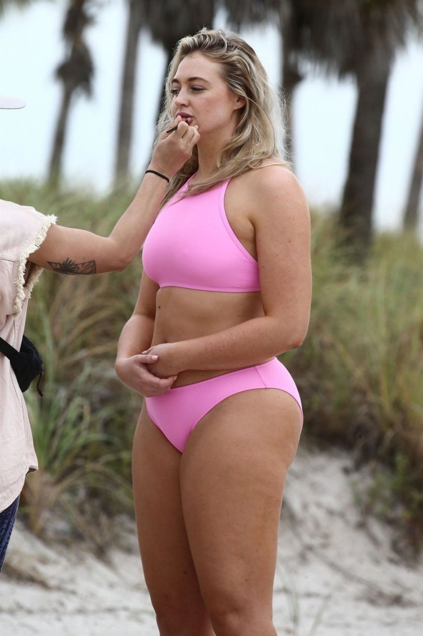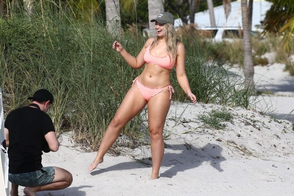 La modelo británica Iskra Lawrence fue vista haciendo una sesión de fotos para Aerie en la playa de Miami, 27/11/2018. Iskra estaba sonriente mientras disfrutaba otro día de sesión para la línea de trajes de baño.