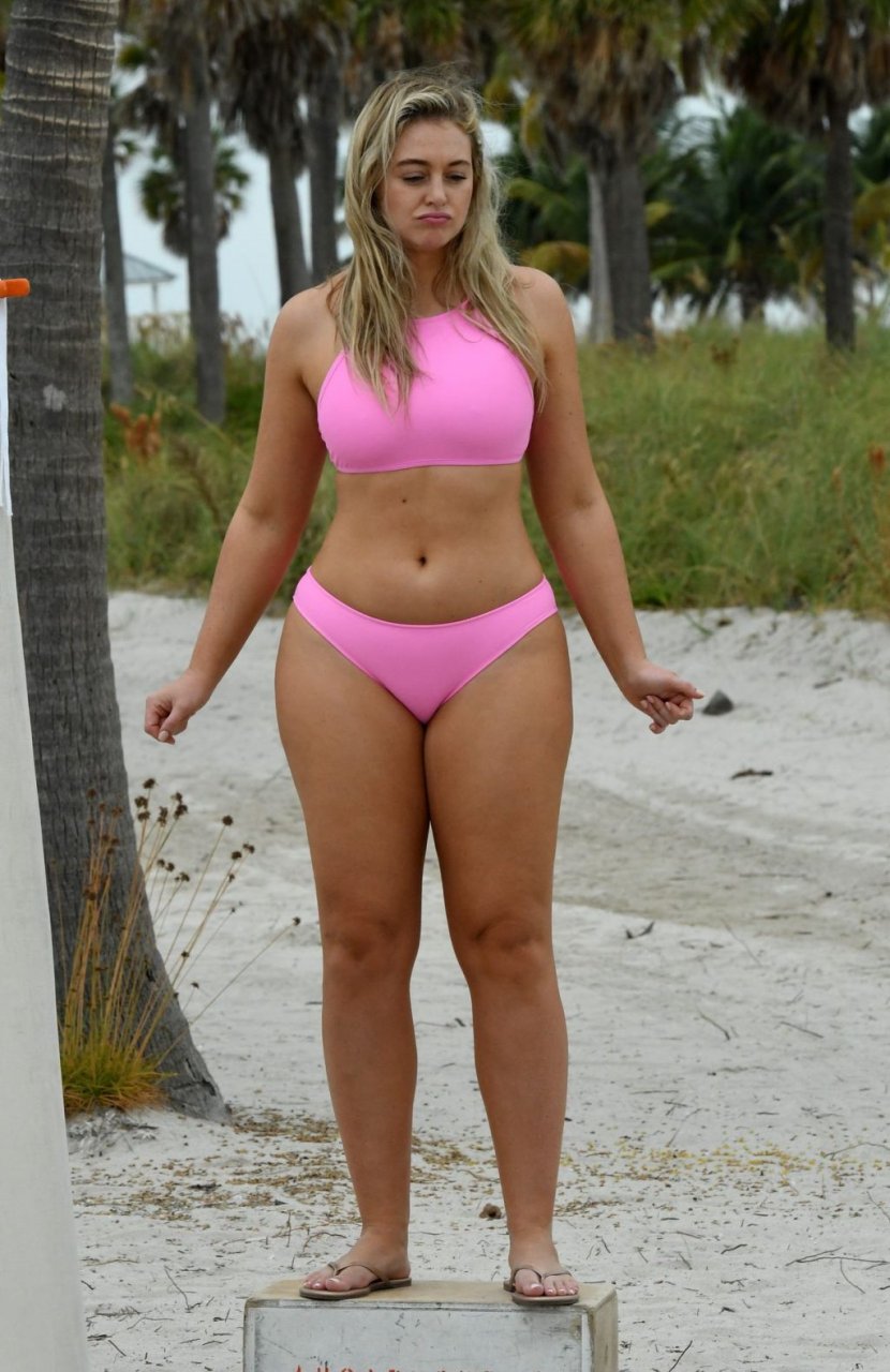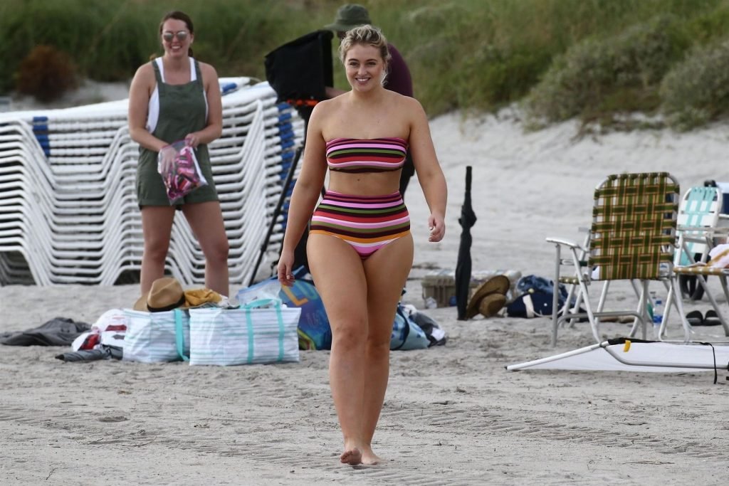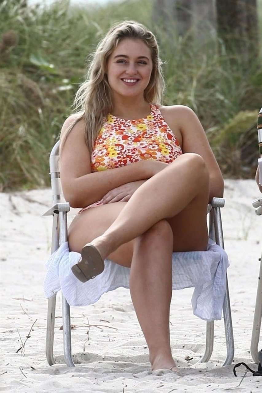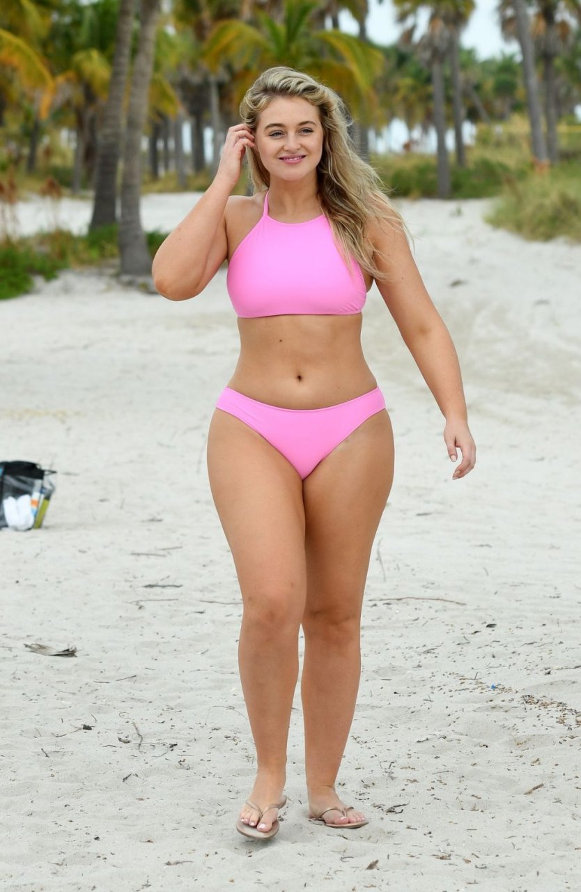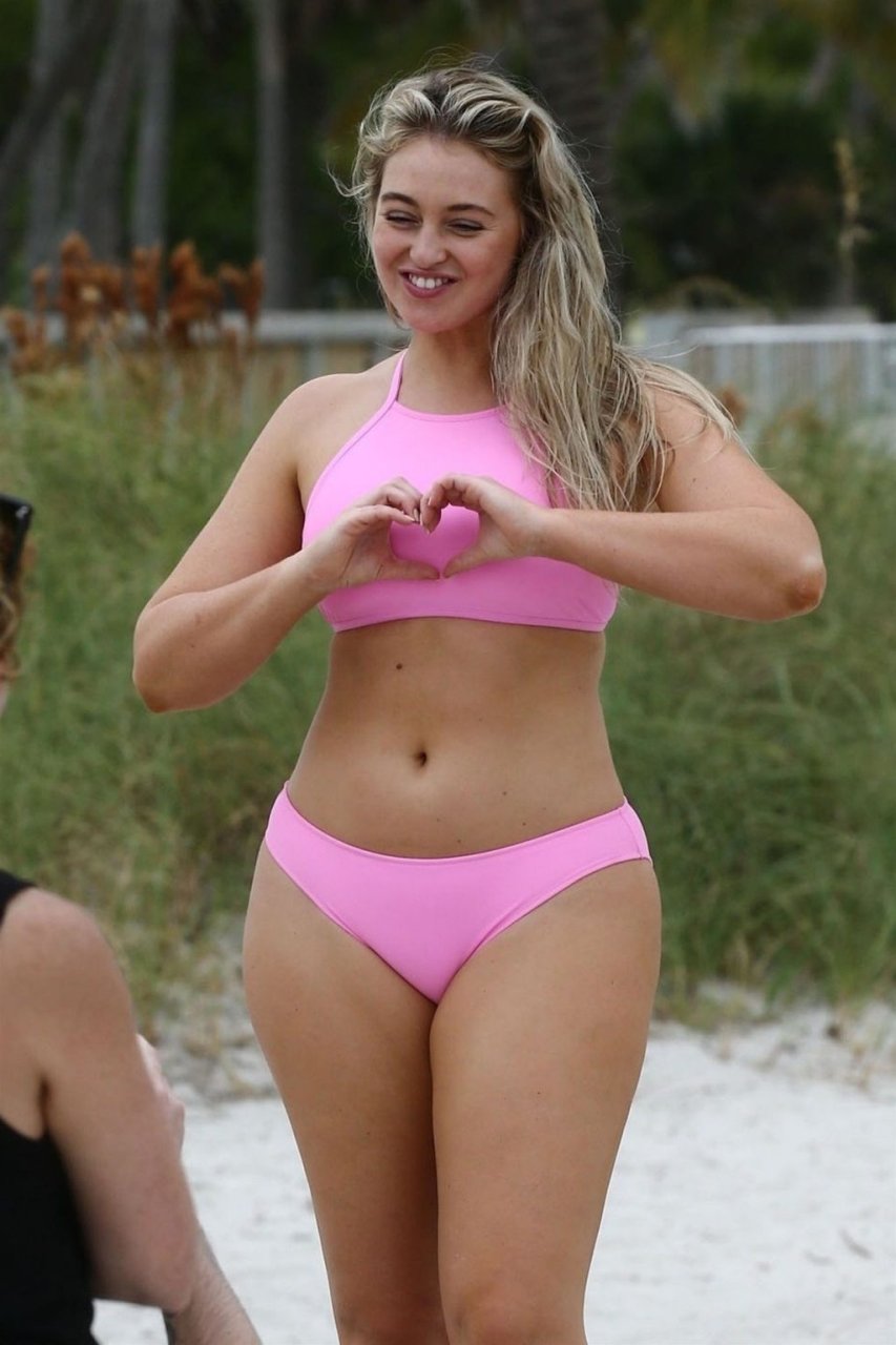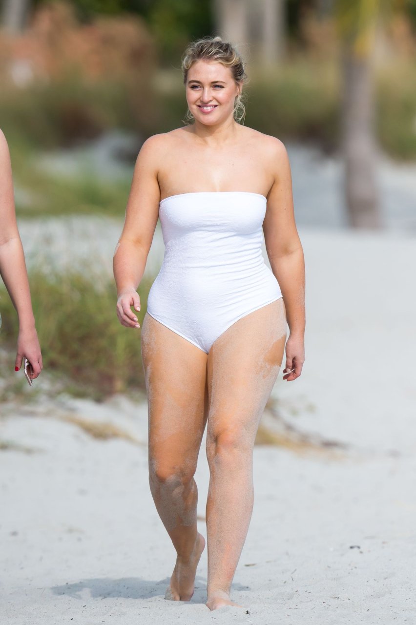 La modelo británica Iskra Lawrence fue vista haciendo una sesión de fotos para Aerie en la playa de Miami, 27/11/2018. Iskra estaba sonriente mientras disfrutaba otro día de sesión para la línea de trajes de baño.