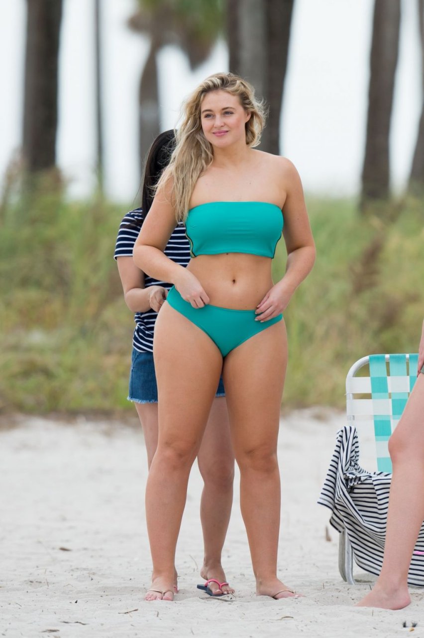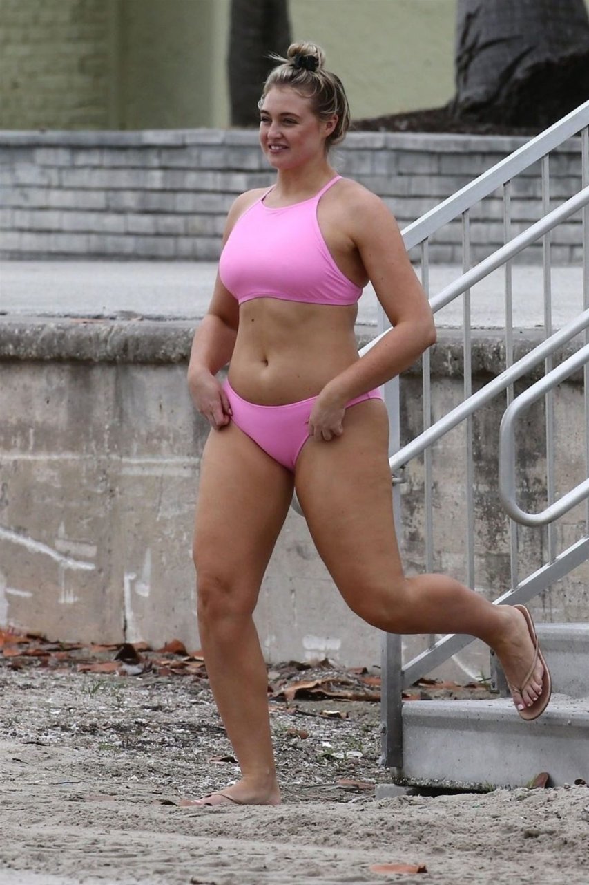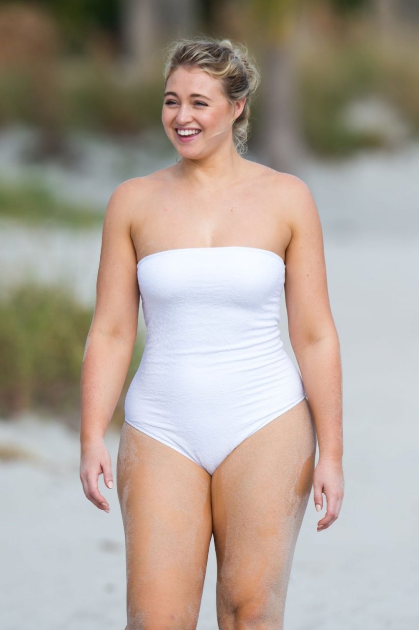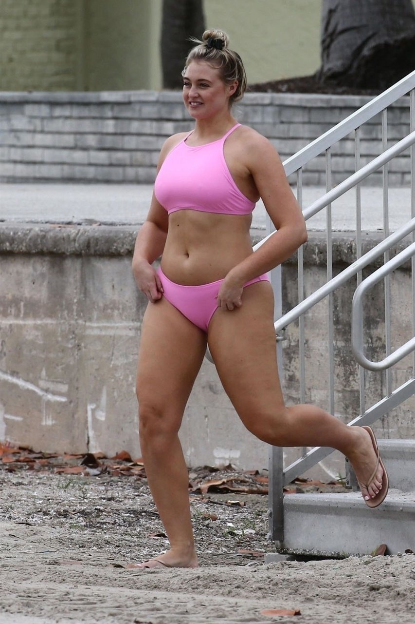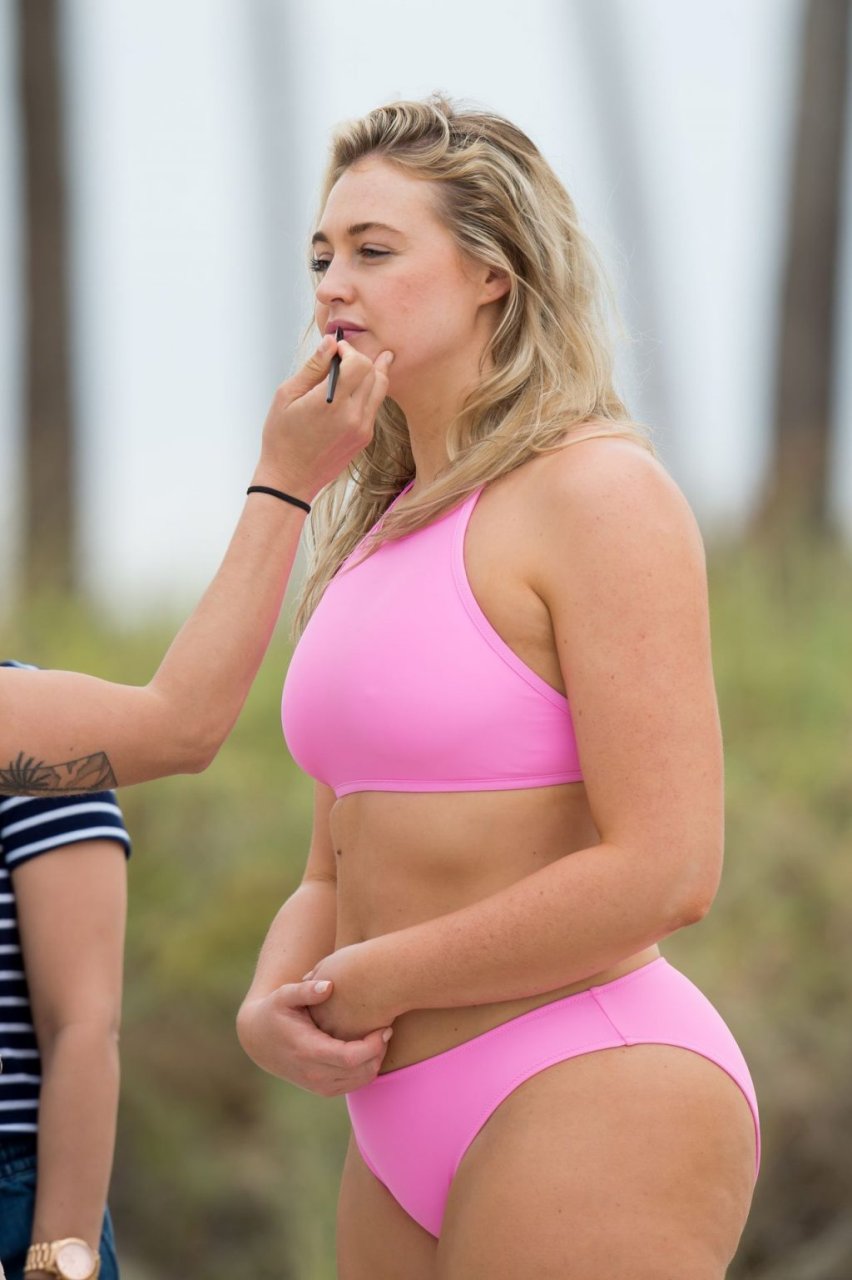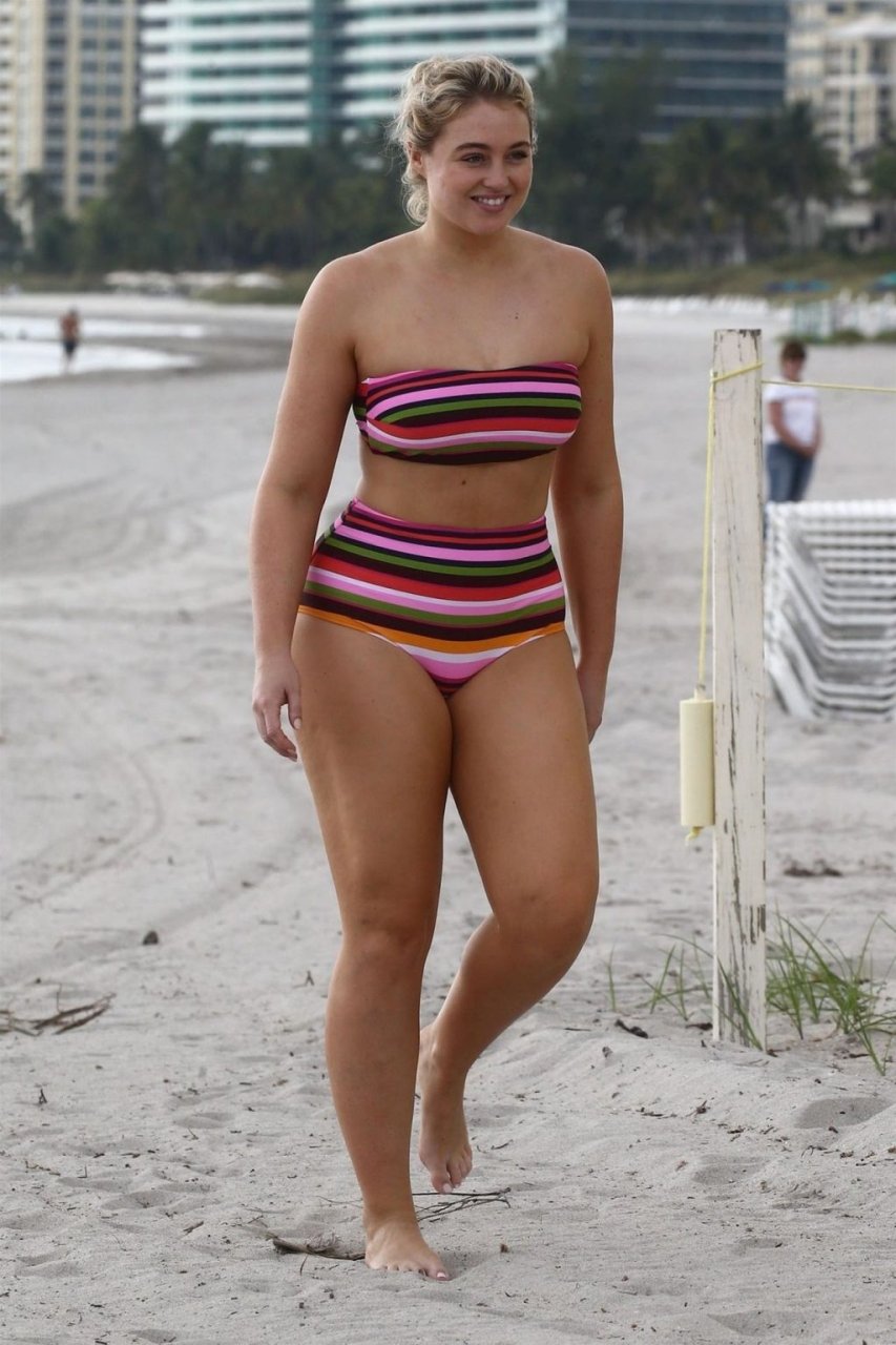 La modelo británica Iskra Lawrence fue vista haciendo una sesión de fotos para Aerie en la playa de Miami, 27/11/2018. Iskra estaba sonriente mientras disfrutaba otro día de sesión para la línea de trajes de baño.