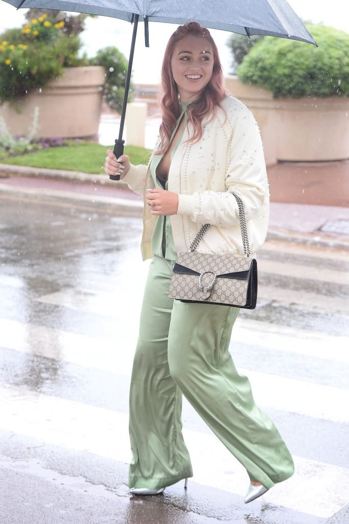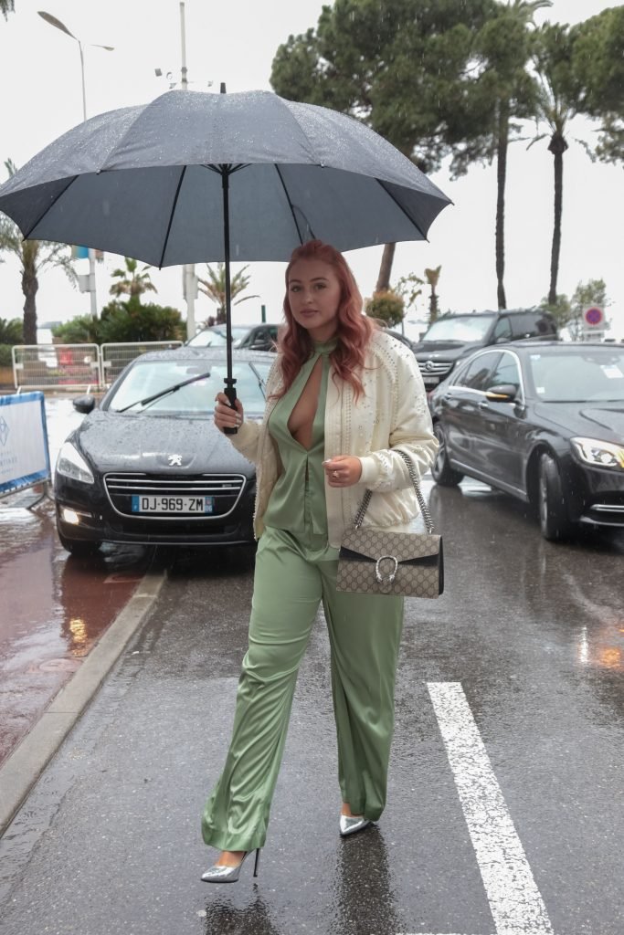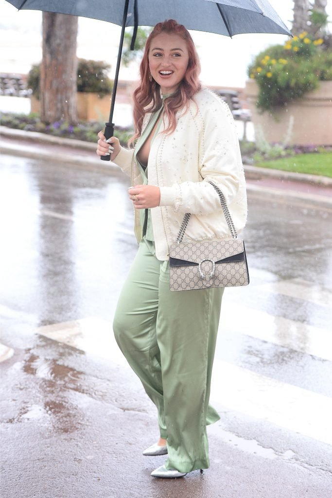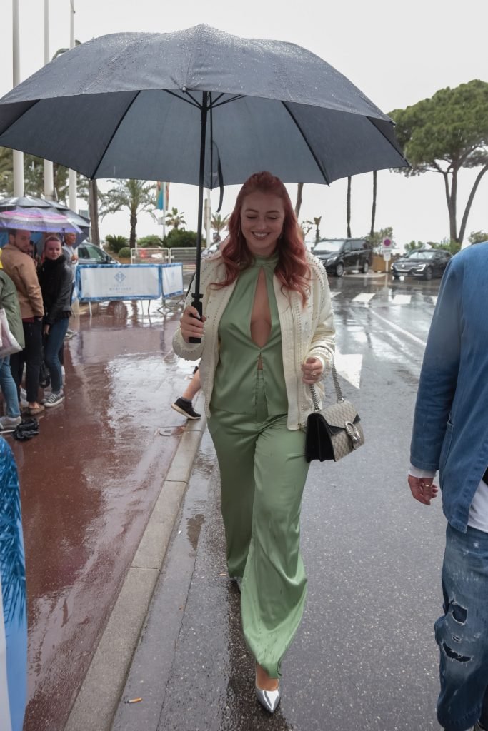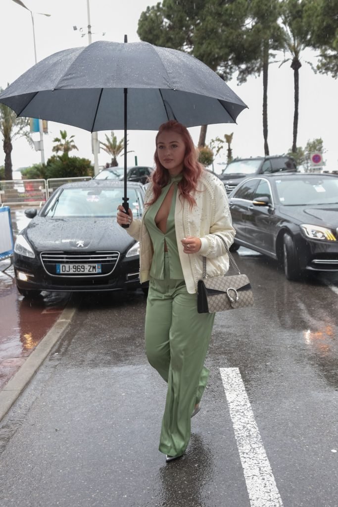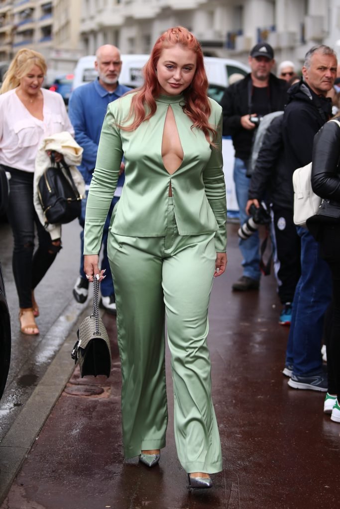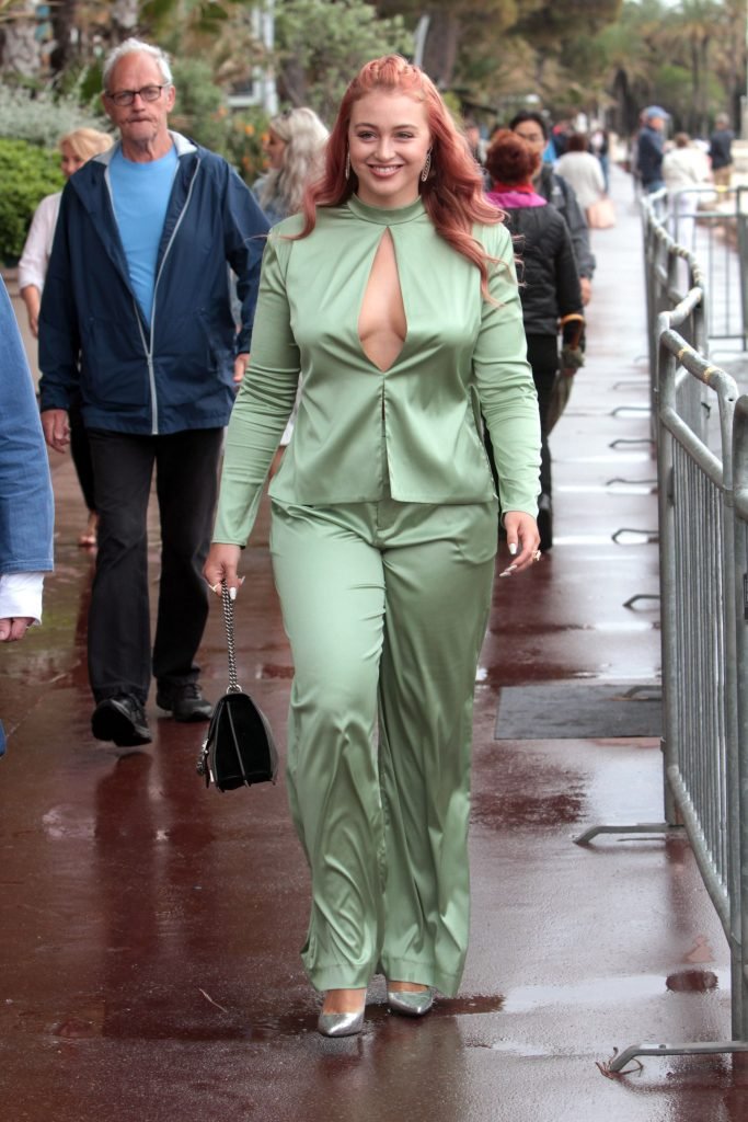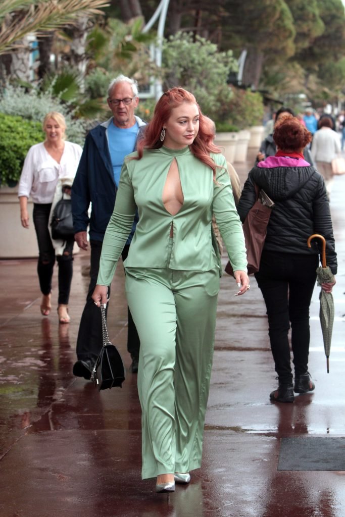 Iskra Lawrence se ve con un traje verde en un día lluvioso en la Croisette en Cannes, Francia, 14/05/2018. La actriz de 27 años mostró ligeramente sus pechos gracias al corte en la chaqueta verde.