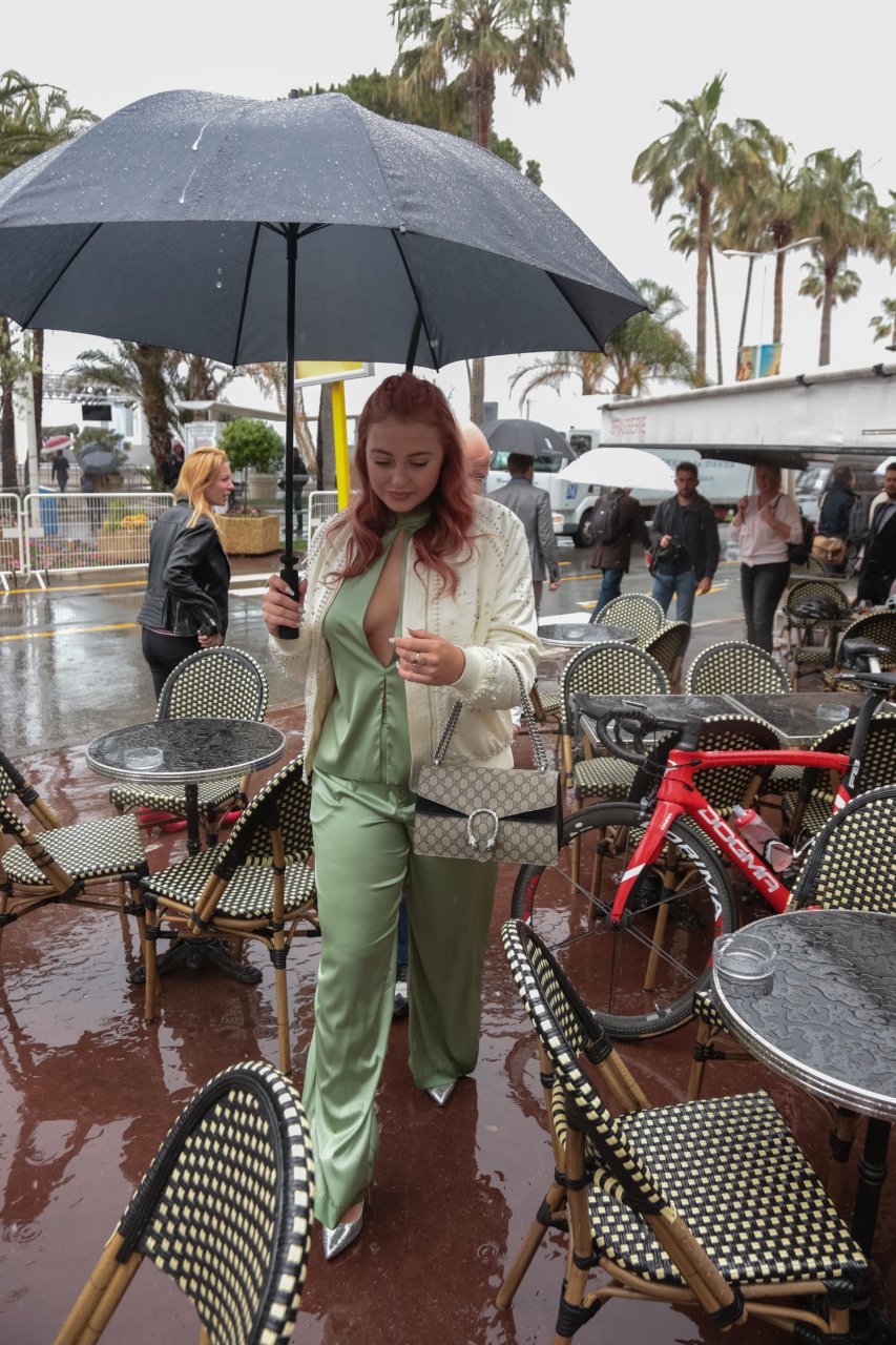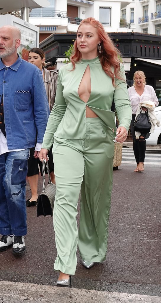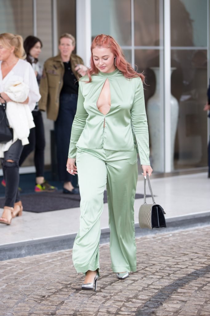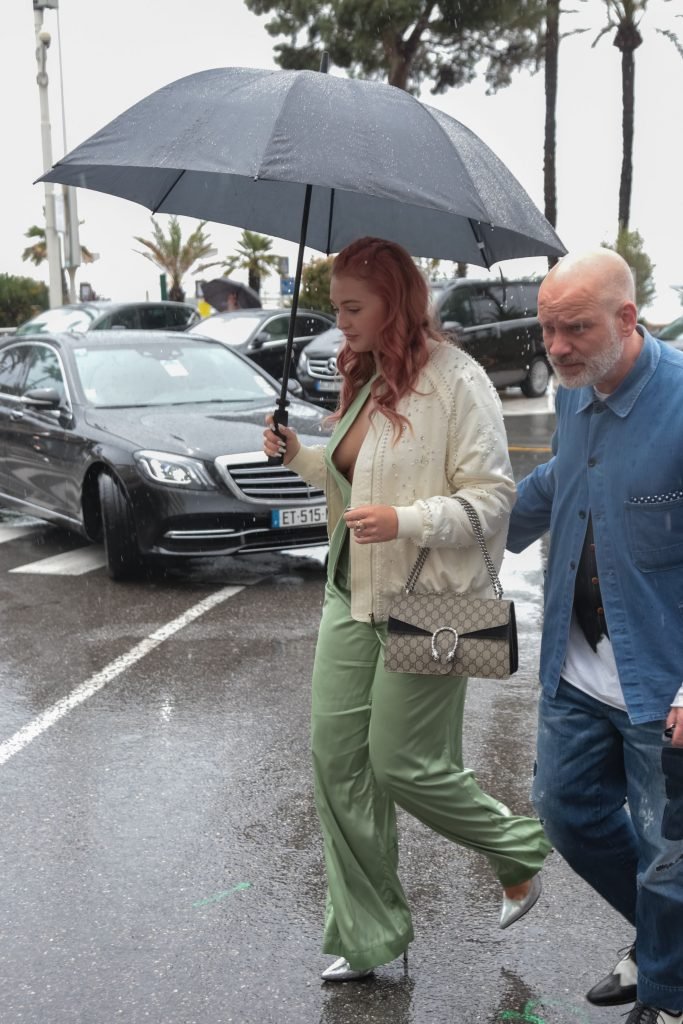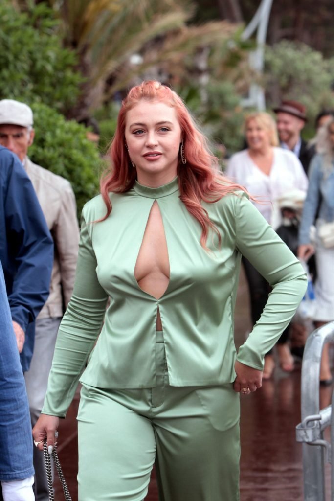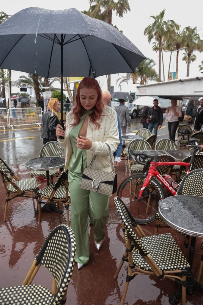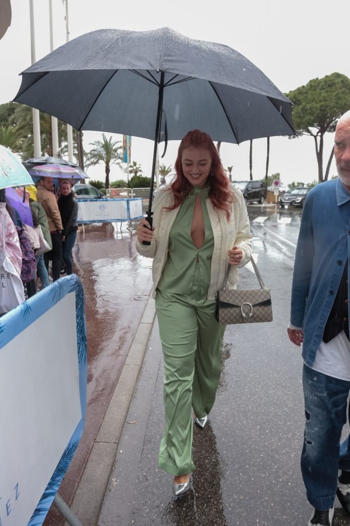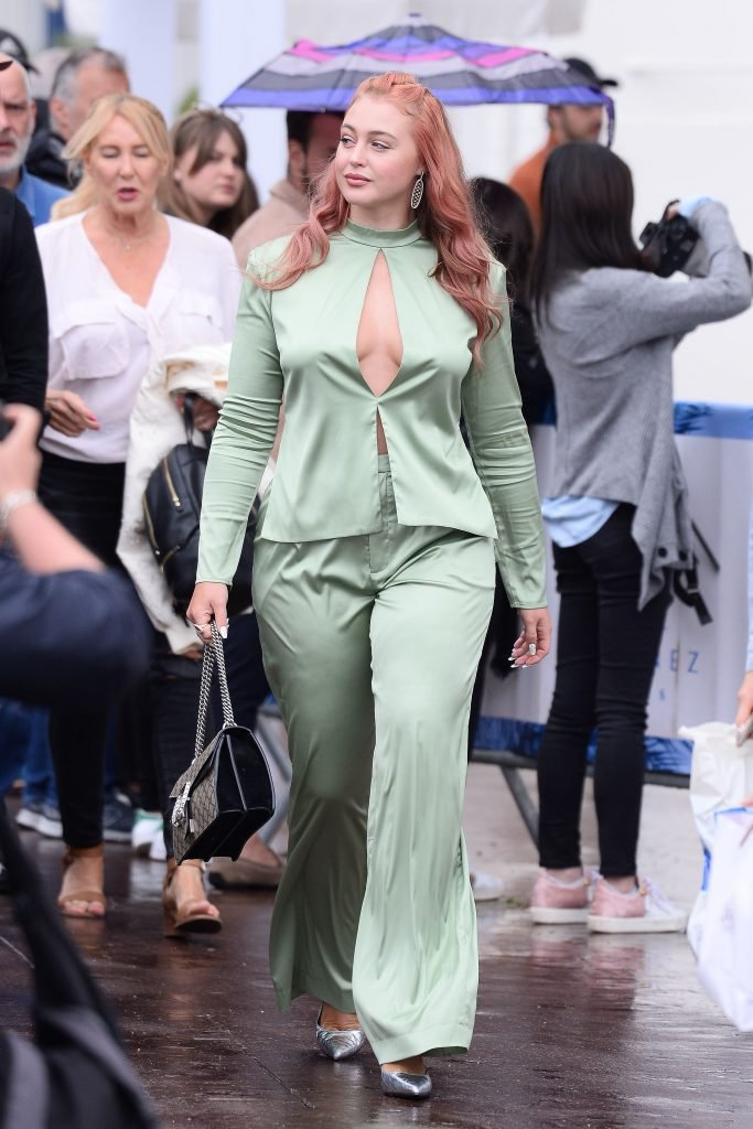 Iskra Lawrence se ve con un traje verde en un día lluvioso en la Croisette en Cannes, Francia, 14/05/2018. La actriz de 27 años mostró ligeramente sus pechos gracias al corte en la chaqueta verde.