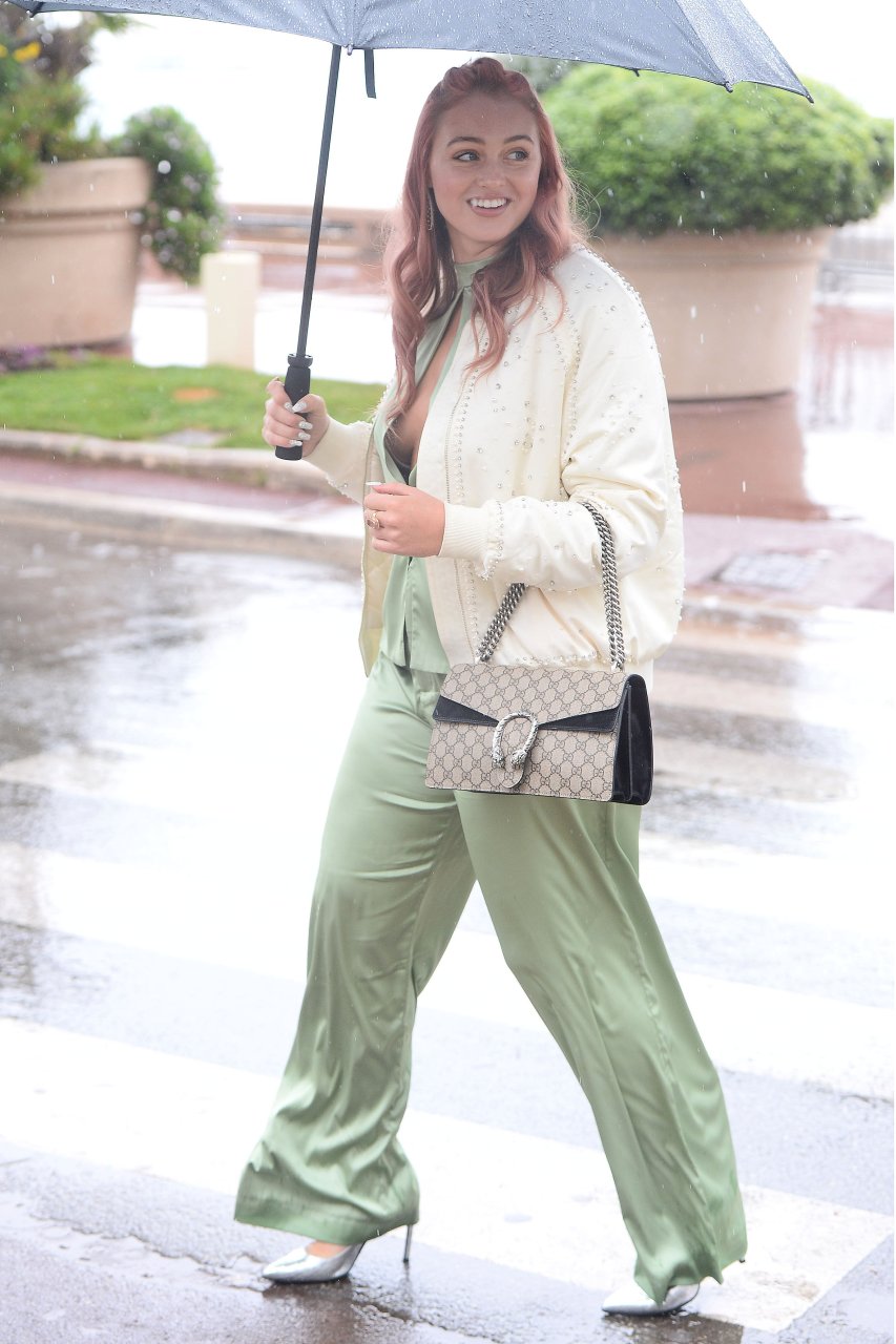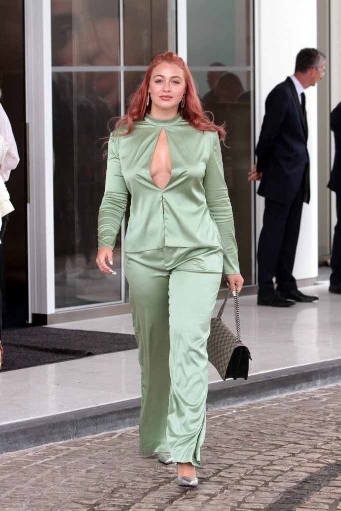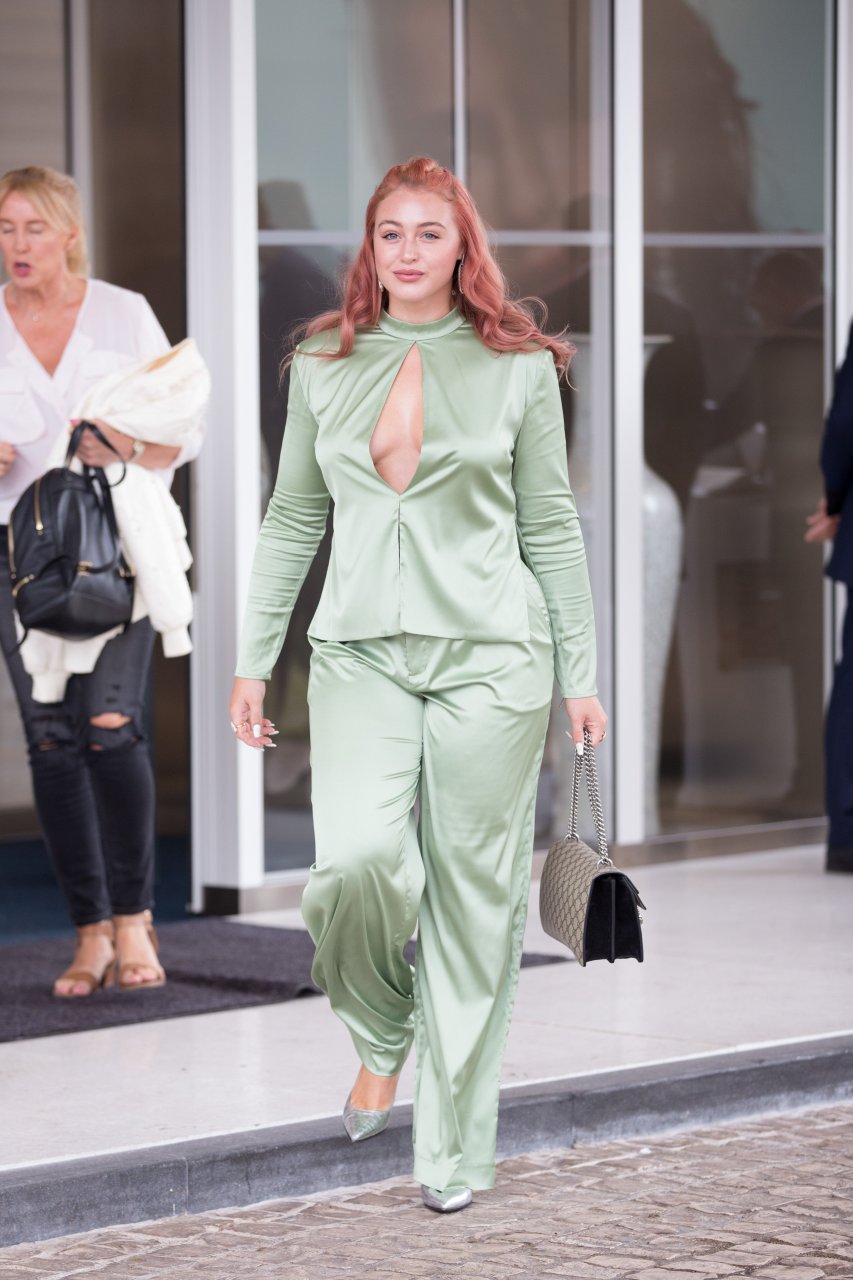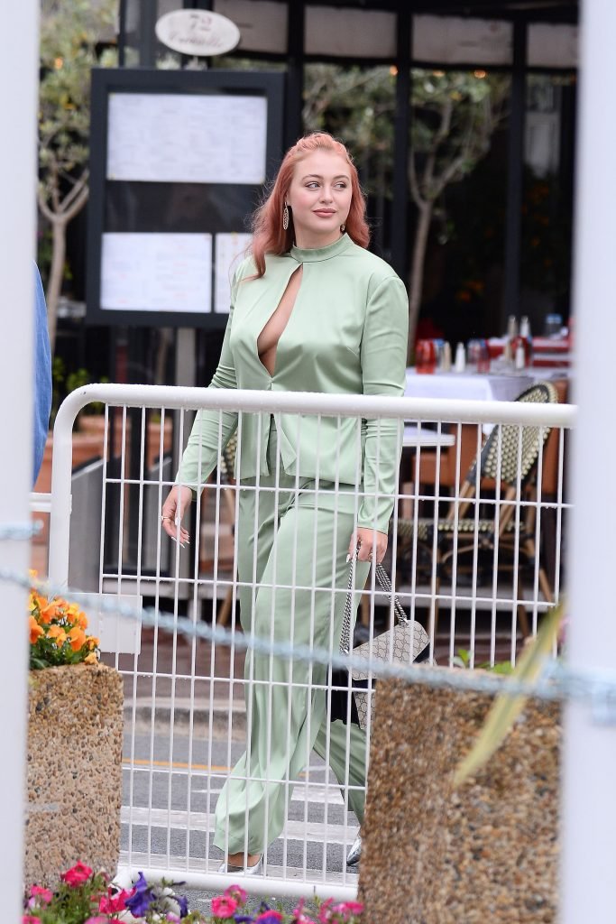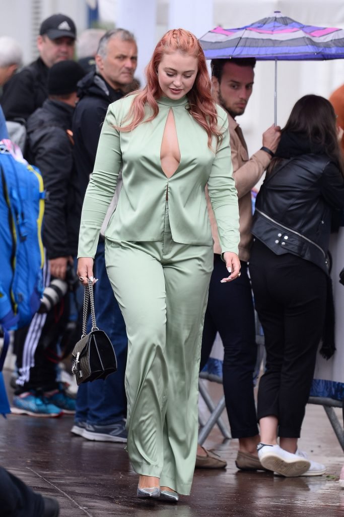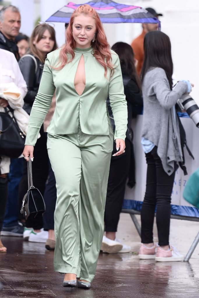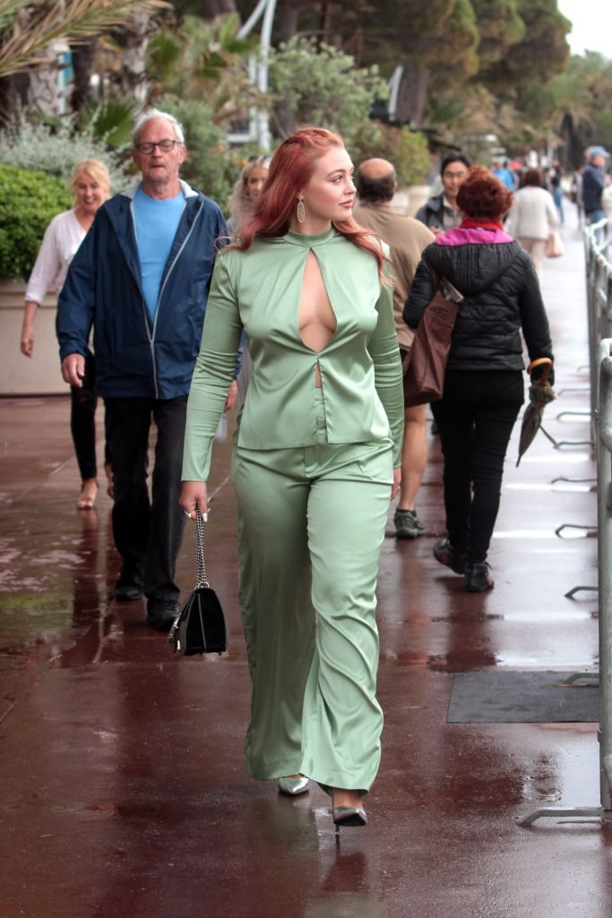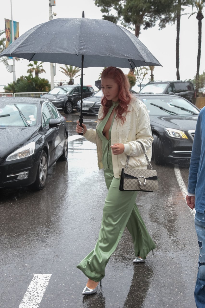 Iskra Lawrence se ve con un traje verde en un día lluvioso en la Croisette en Cannes, Francia, 14/05/2018. La actriz de 27 años mostró ligeramente sus pechos gracias al corte en la chaqueta verde.