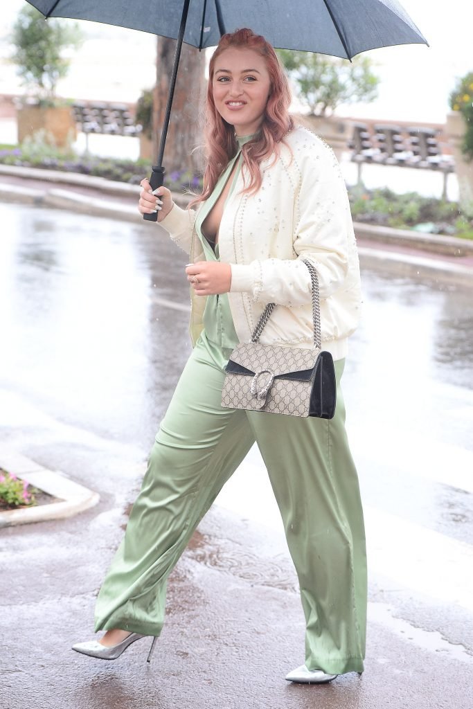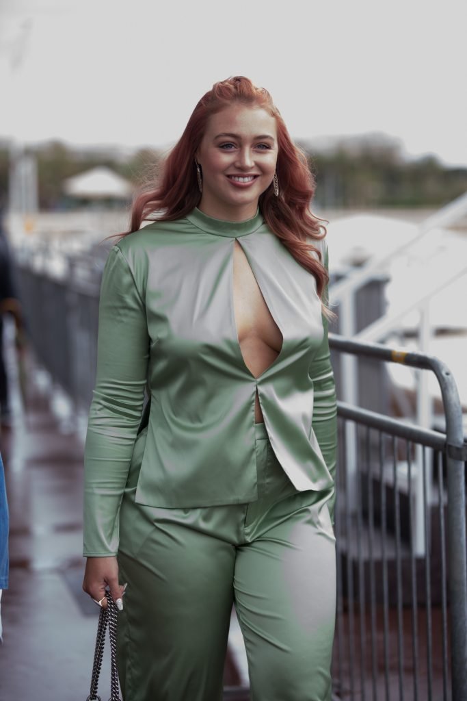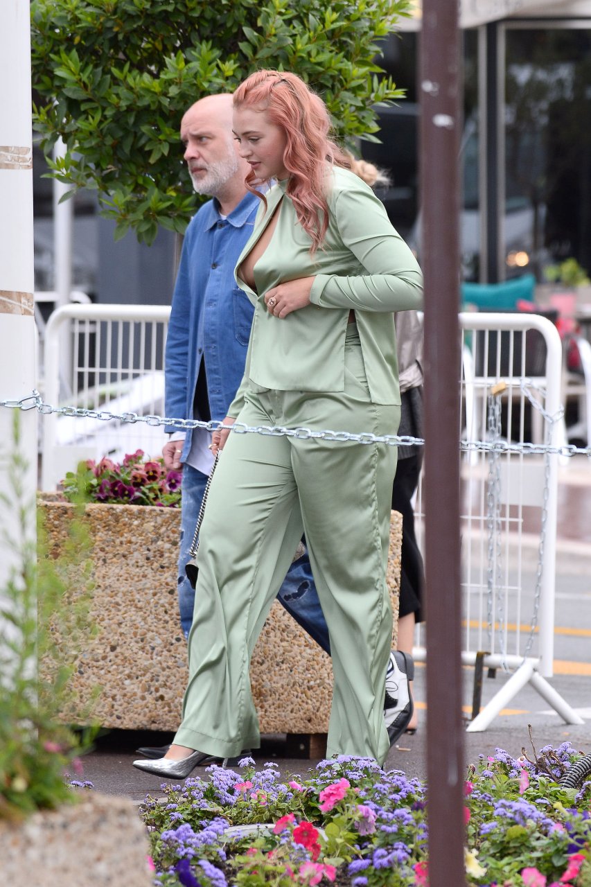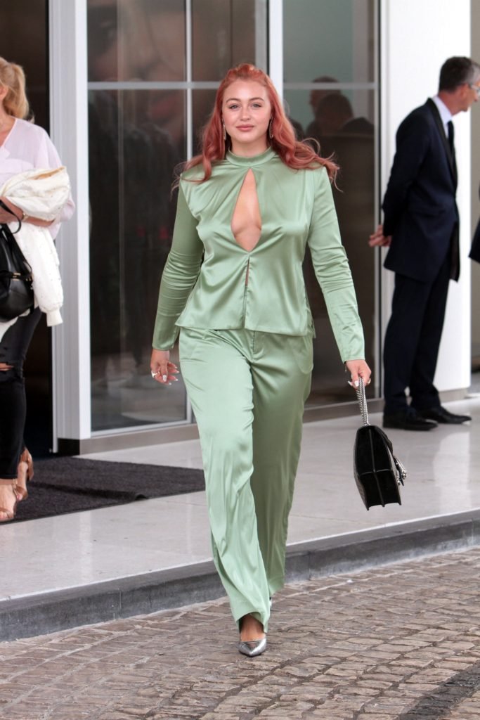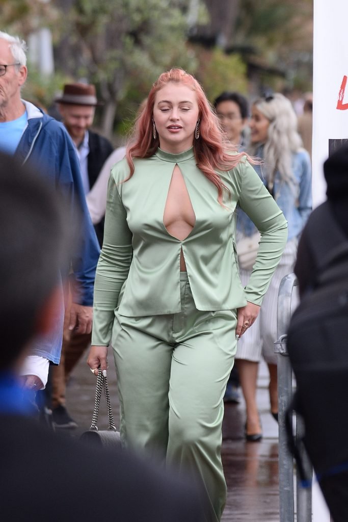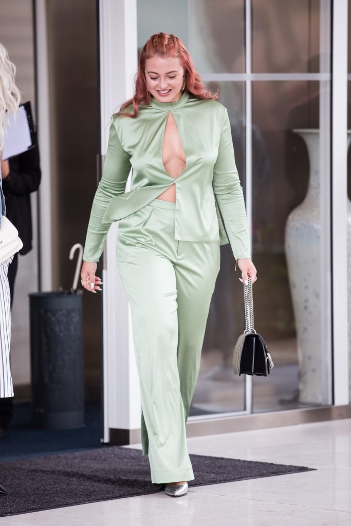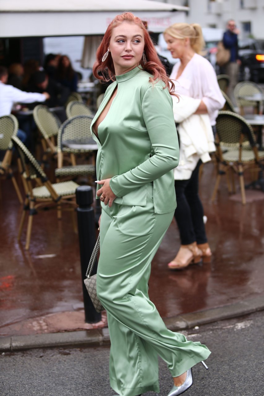 Iskra Lawrence se ve con un traje verde en un día lluvioso en la Croisette en Cannes, Francia, 14/05/2018. La actriz de 27 años mostró ligeramente sus pechos gracias al corte en la chaqueta verde.