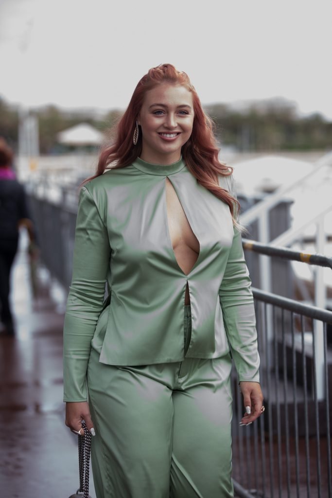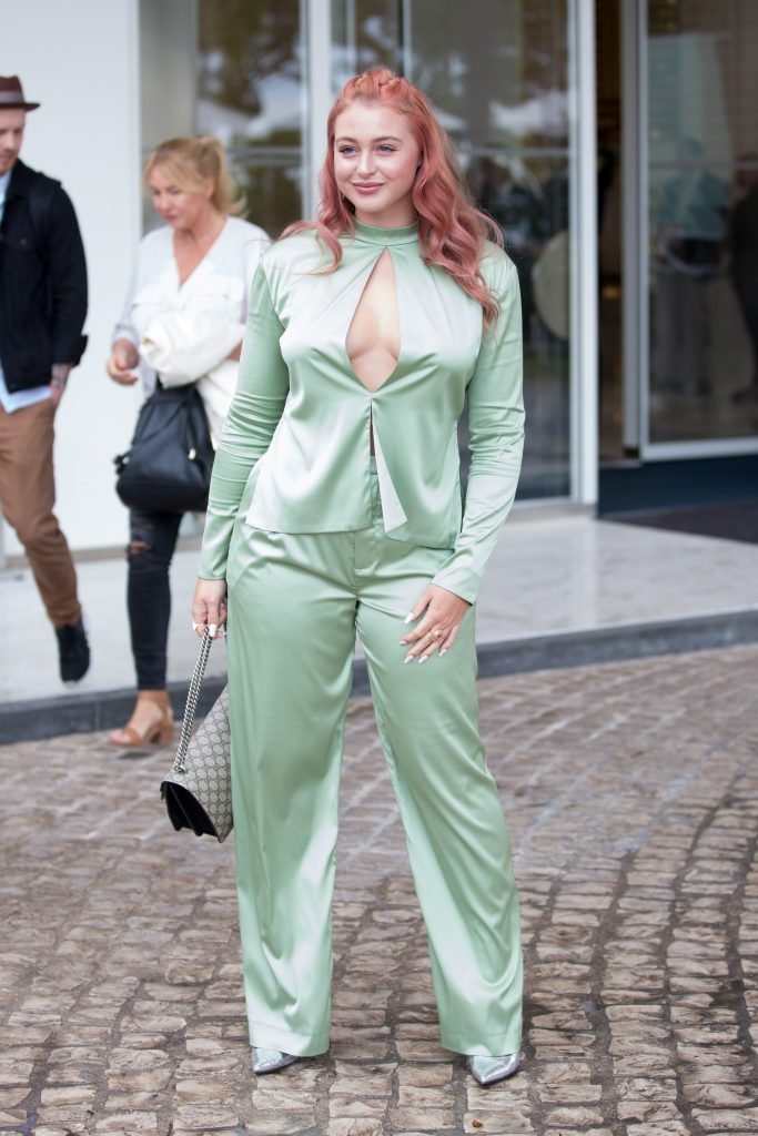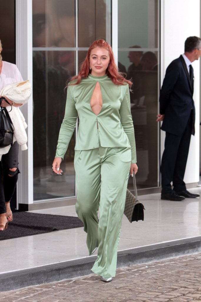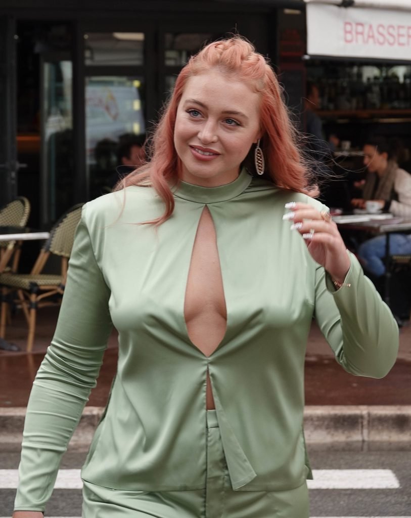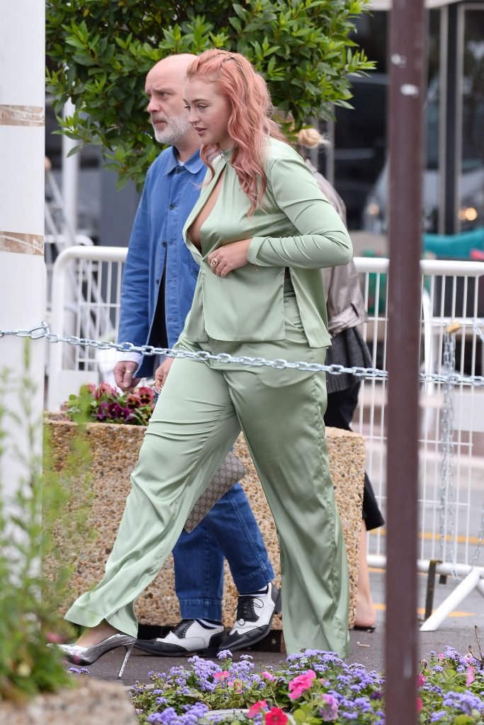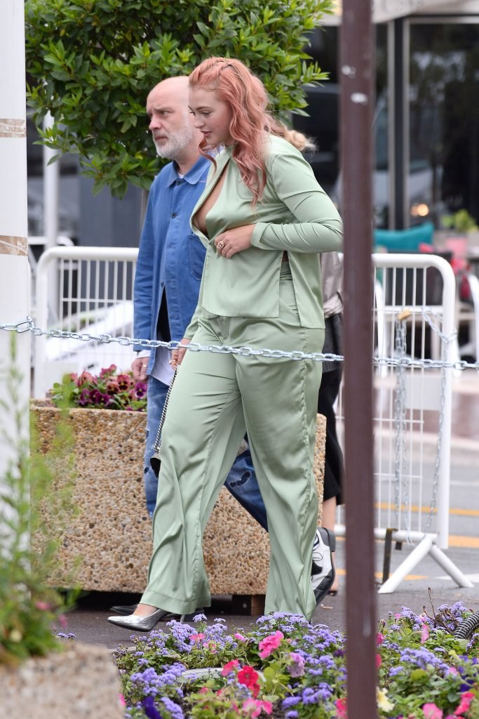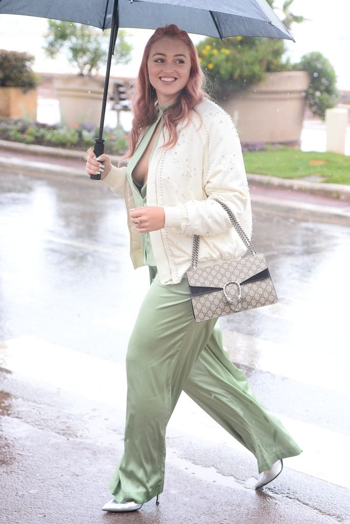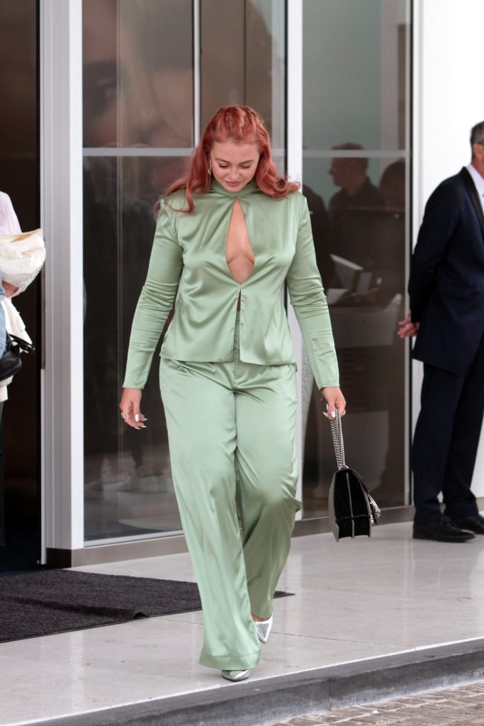 Iskra Lawrence se ve con un traje verde en un día lluvioso en la Croisette en Cannes, Francia, 14/05/2018. La actriz de 27 años mostró ligeramente sus pechos gracias al corte en la chaqueta verde.