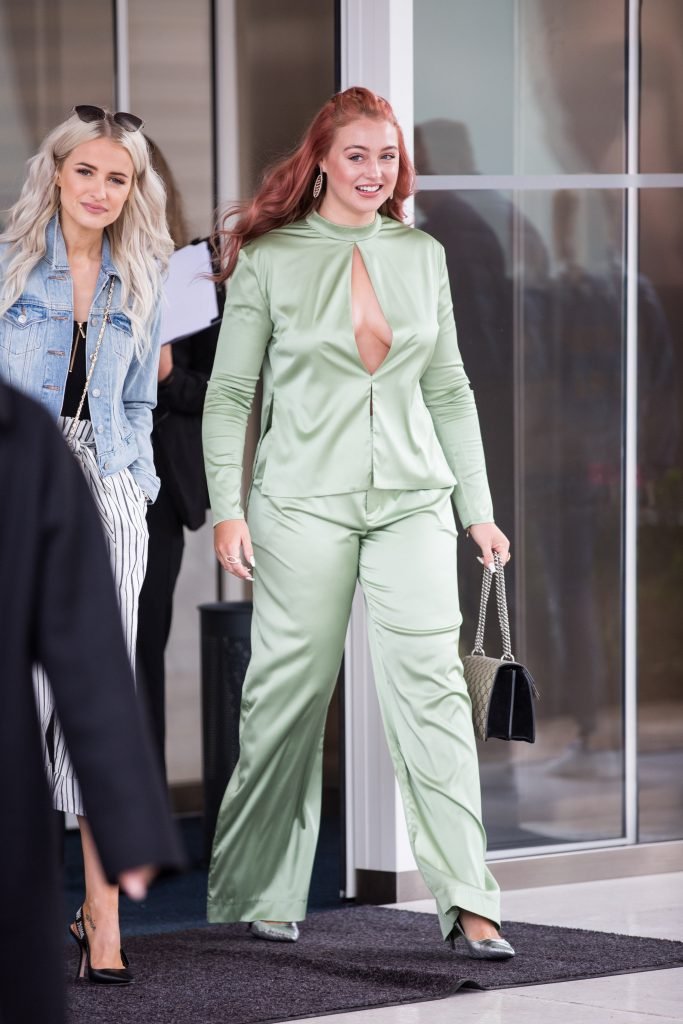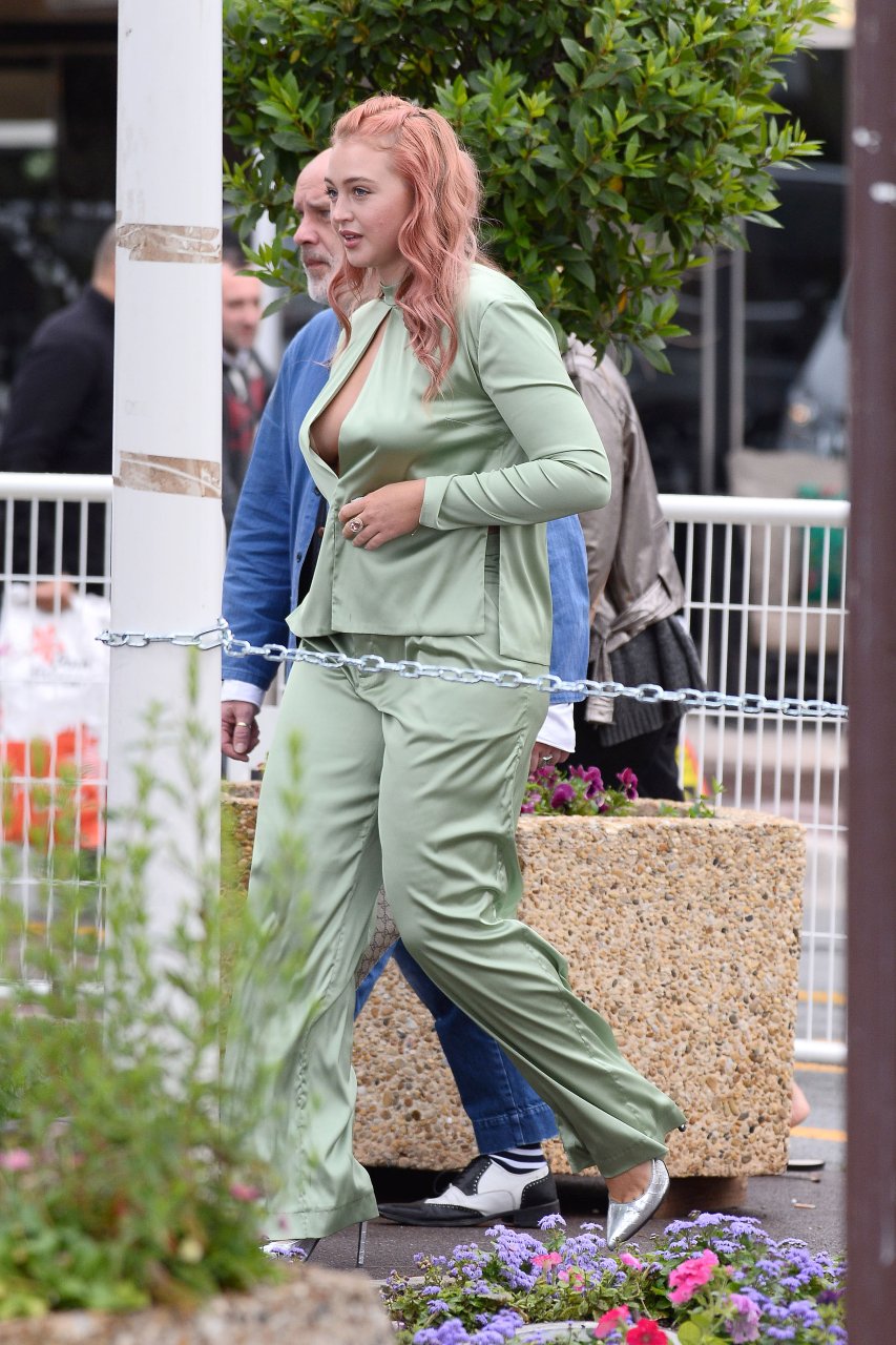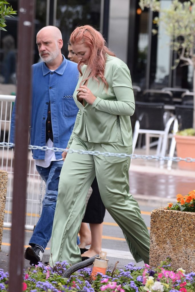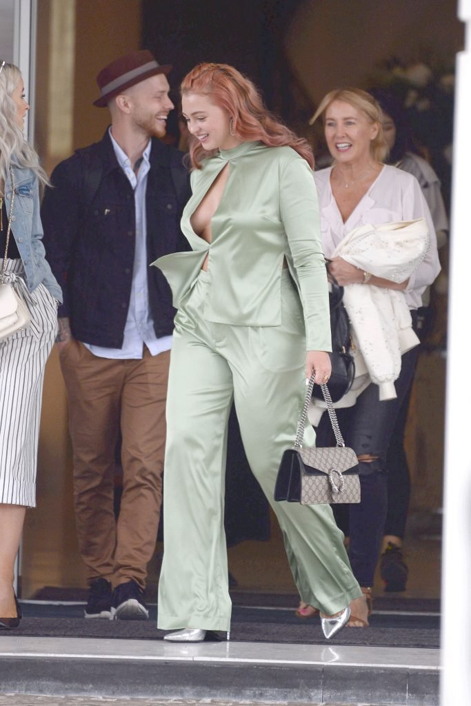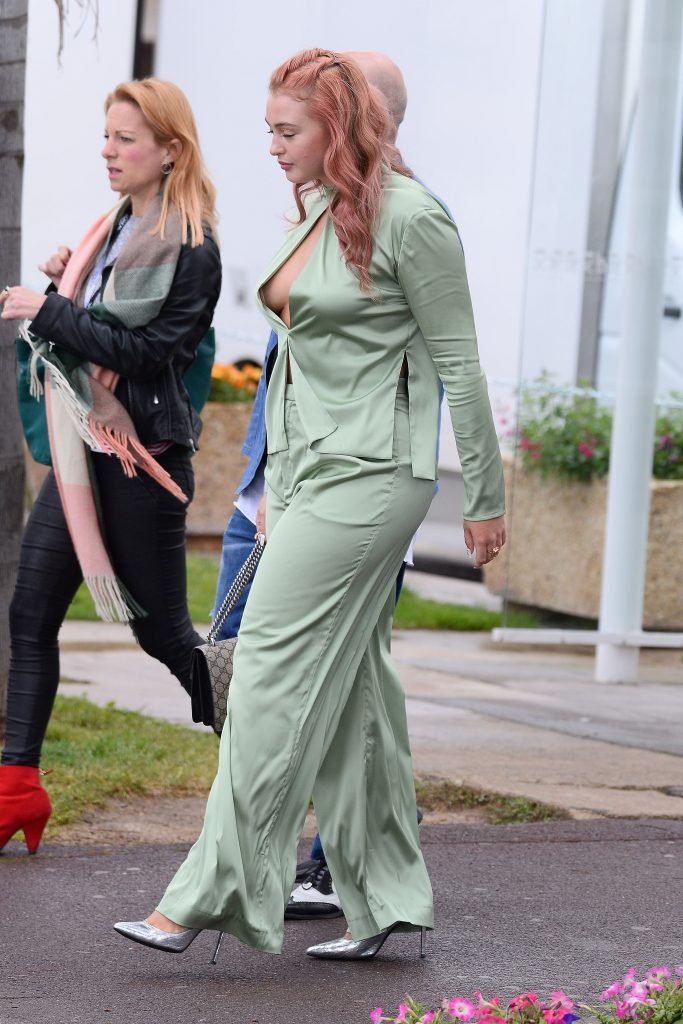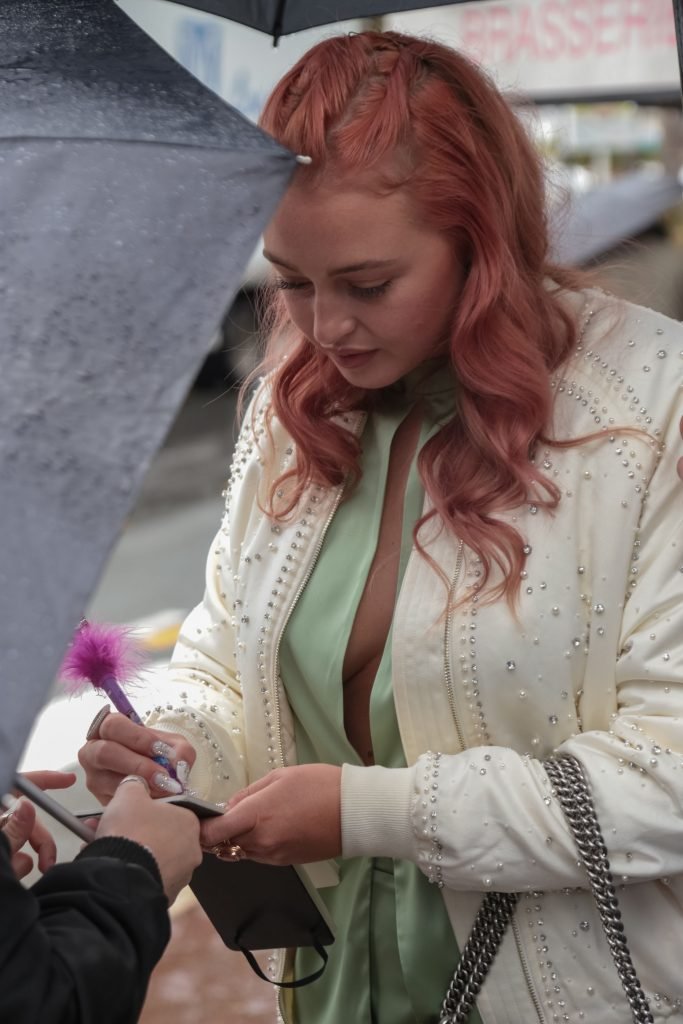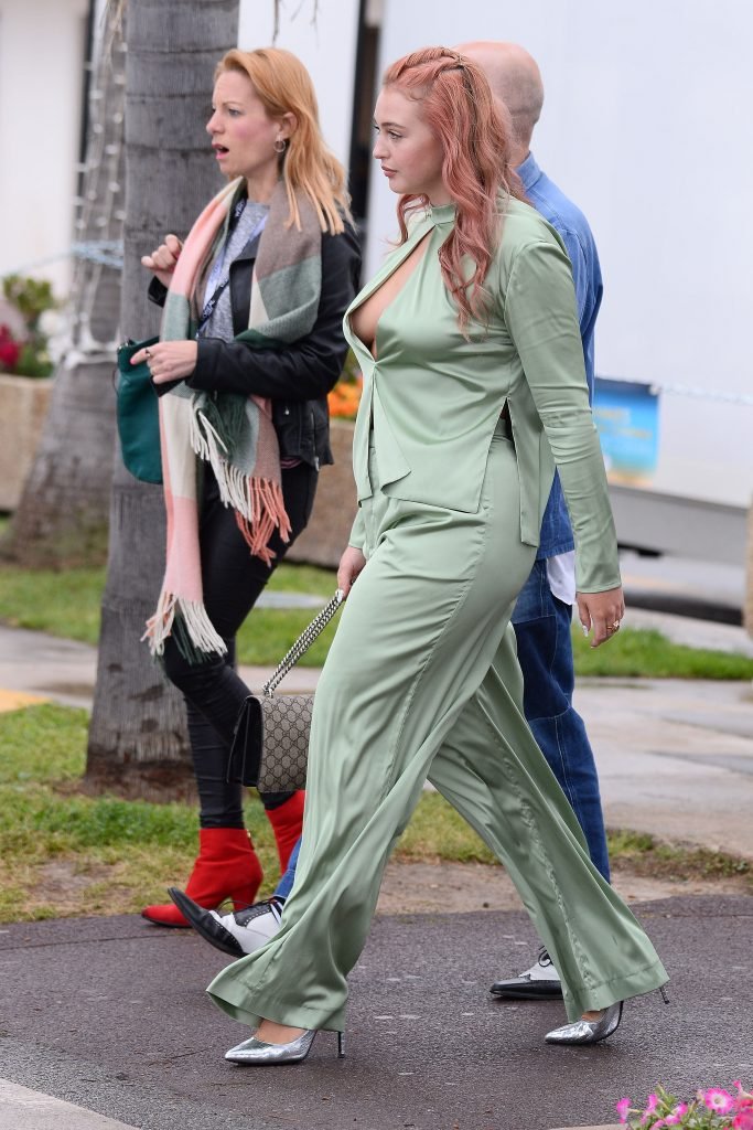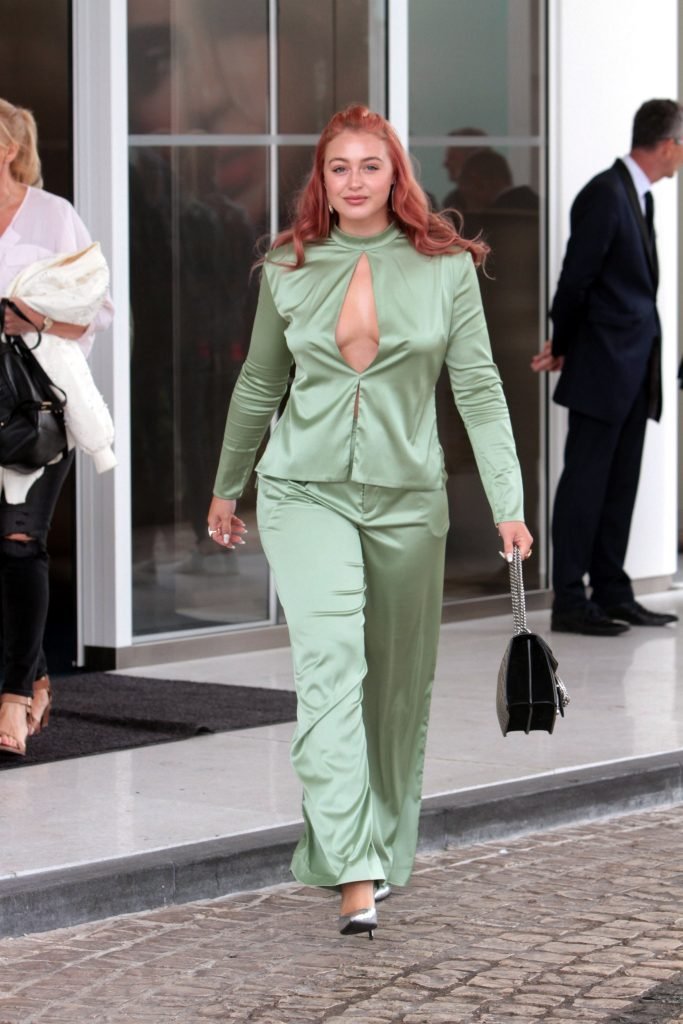 Iskra Lawrence se ve con un traje verde en un día lluvioso en la Croisette en Cannes, Francia, 14/05/2018. La actriz de 27 años mostró ligeramente sus pechos gracias al corte en la chaqueta verde.