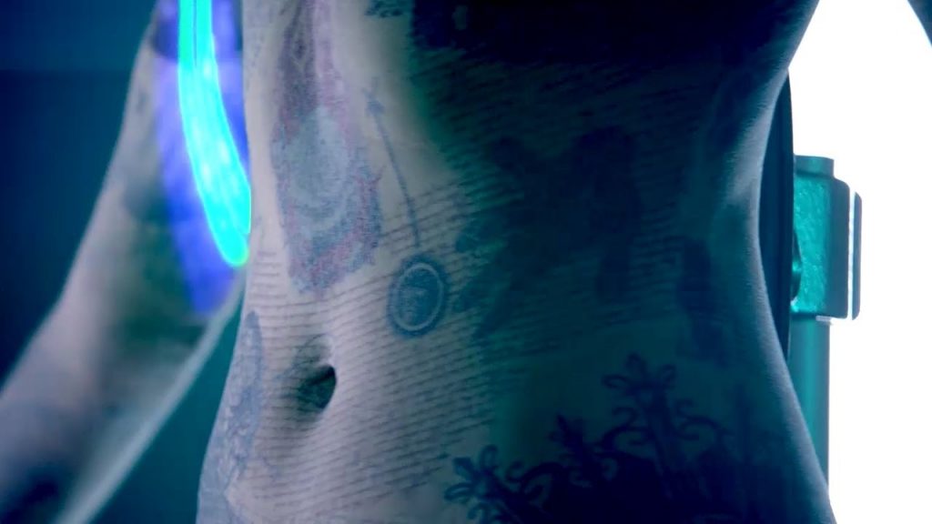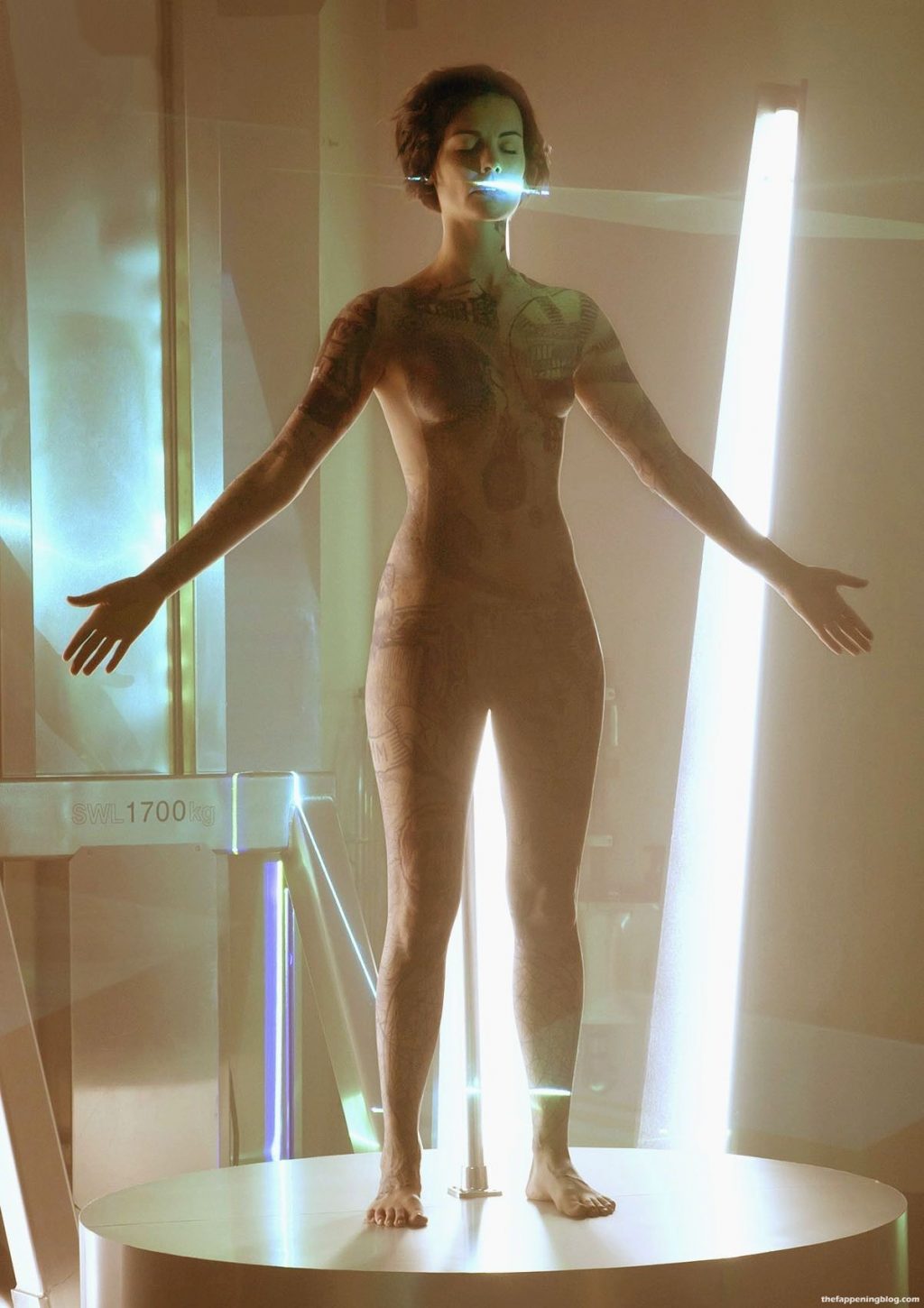 Ella dijo en una entrevista que no le pintaron los tatuajes en su cuerpo. Dijo que es un traje muy ligero que cubre todo su cuerpo. Más o menos como lo que hicieron con Jennifer Lawrence en X-Men.