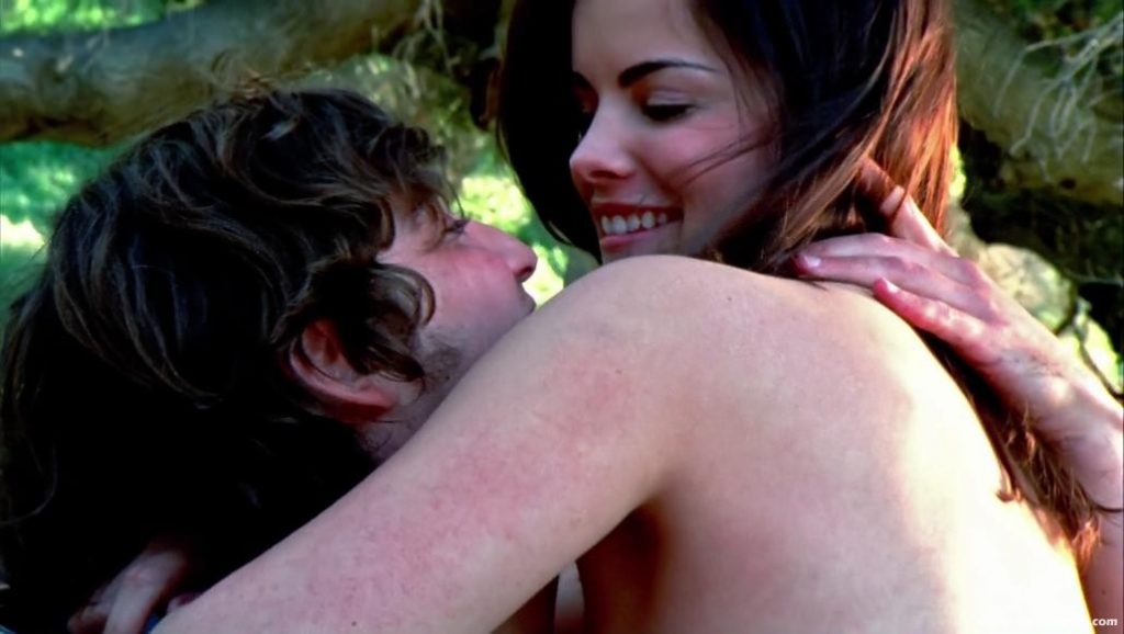 Jaimie Alexander is standing in a black bra as she kisses a guy and laughs while they fool around and then having him start to remove her bra before she’s seen having sex with him on top of her in a bed.