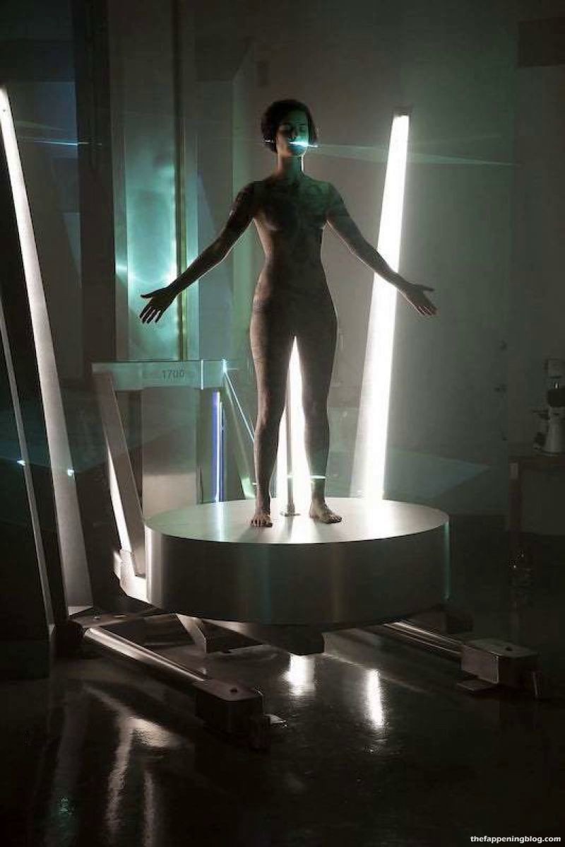 Jaimie is showing her ass, legs and stomach as she stands on a pedestal in the middle of a room spinning around in circles while they laser scan the tattoos on her body all while Ashley Johnson reviews the images on a computer screen in the next room.