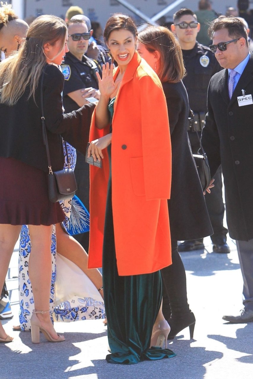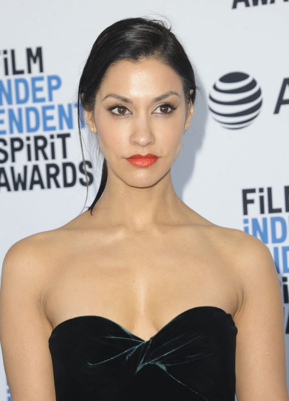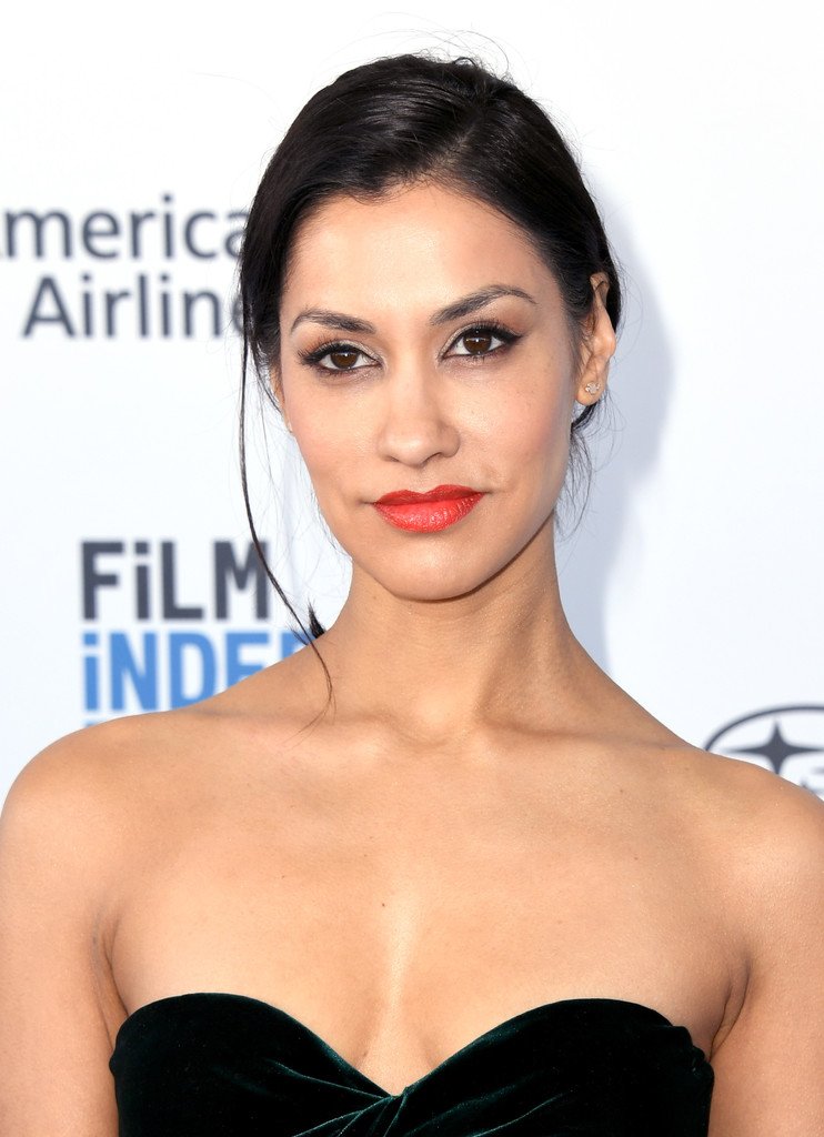 Janina Gavankar está en Santa Mónica asistiendo a los Independent Spirit Awards presentados por Aubrey Plaza, 23/02/2019. La actriz de 38 años lleva un abrigo de neón naranja brillante sobre un vestido de satén verde oscuro. Janina opta por tacones color nude para completar su look.