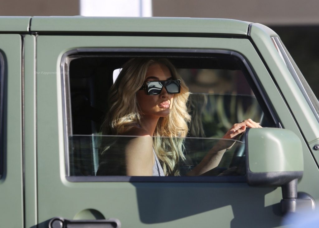 Jasmine Sanders se arregla el cabello en el Salón Zogalis en Bel Air, 23/03/2021. La modelo germano-americana e influencer de moda muestra su abdomen tonificado con un sujetador deportivo y leggings mientras sale del salón en su Jeep verde militar.