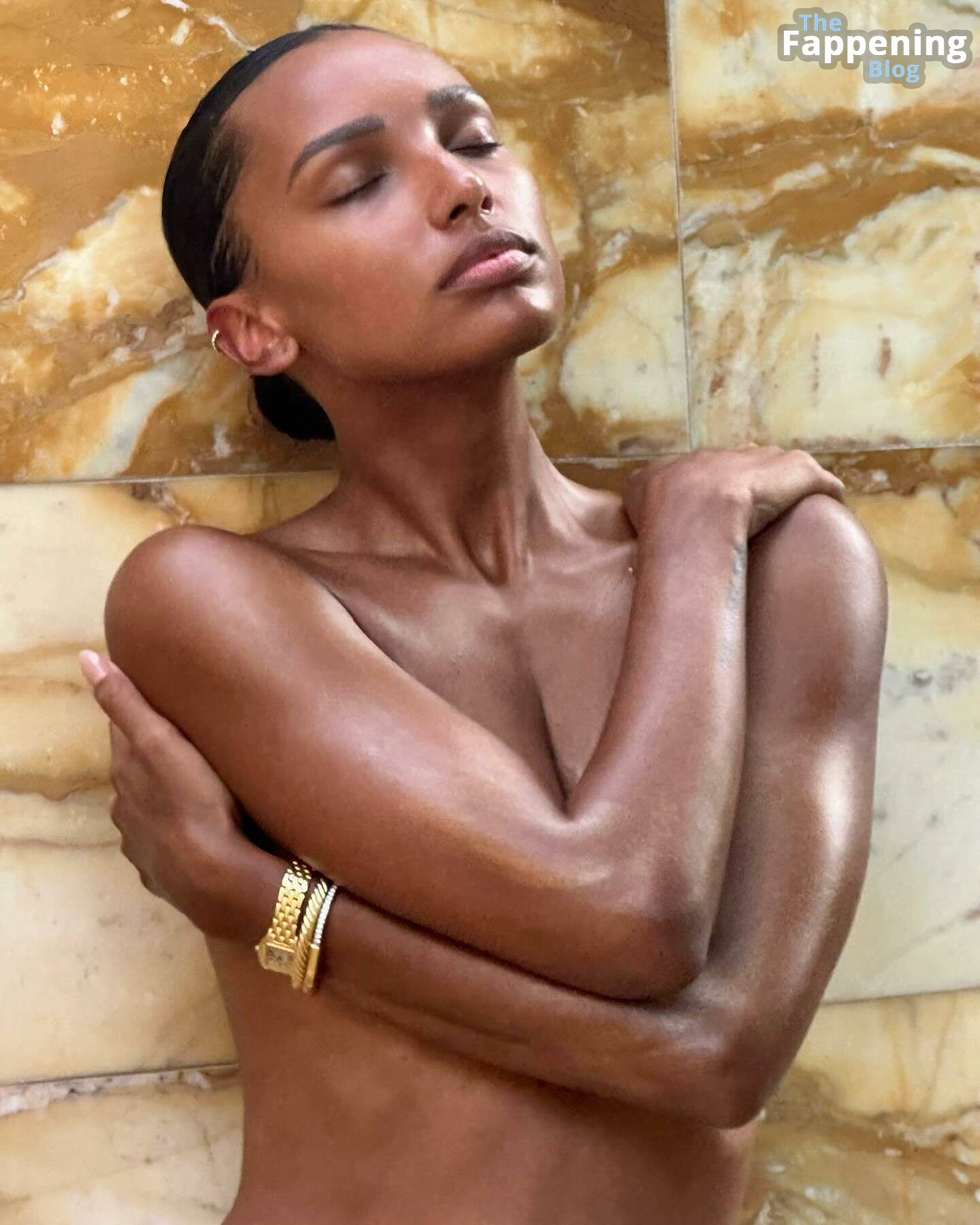 Echa un vistazo a la cautivadora Jasmine Tookes mientras posa topless en una sesión de fotos para redes sociales, mostrando su impresionante belleza.