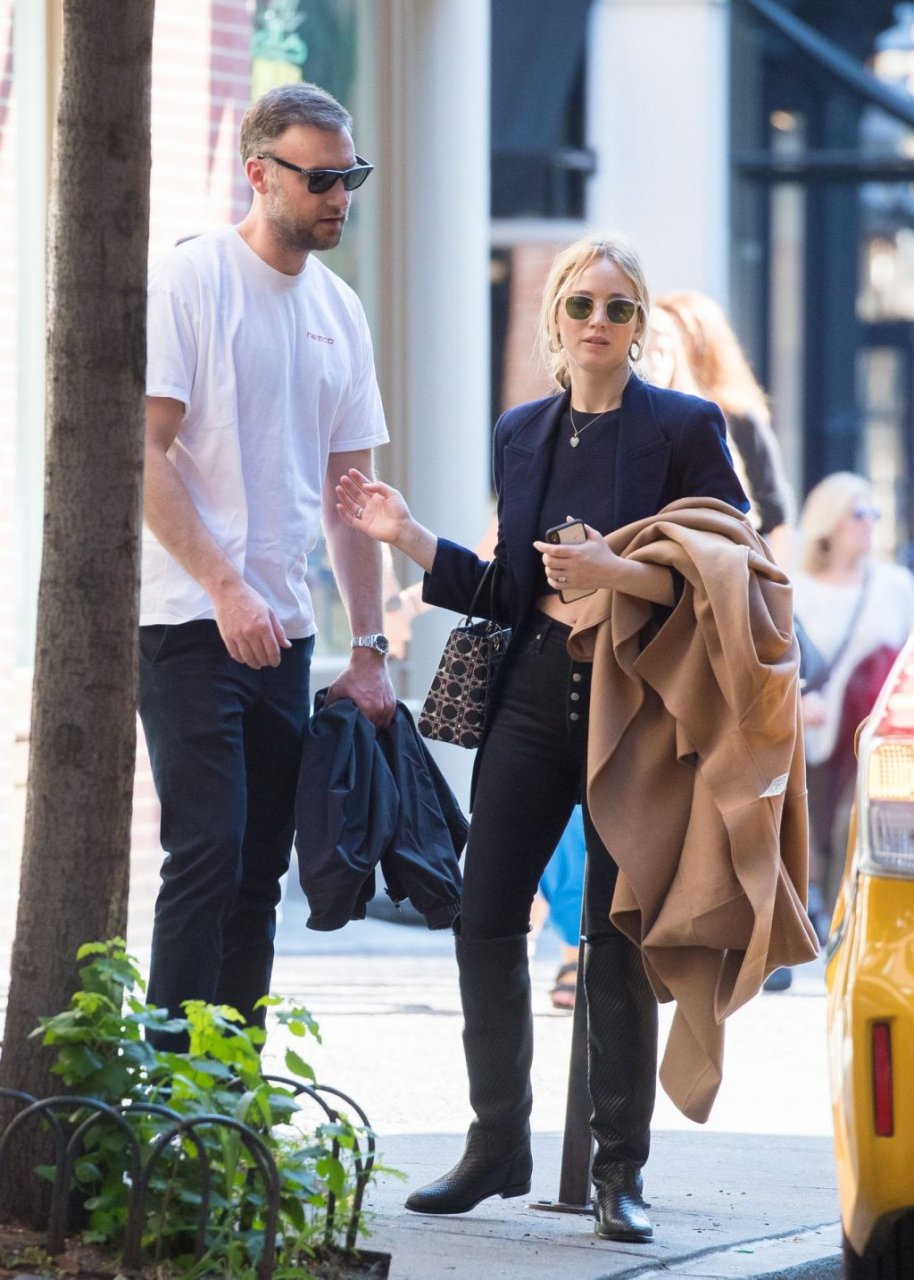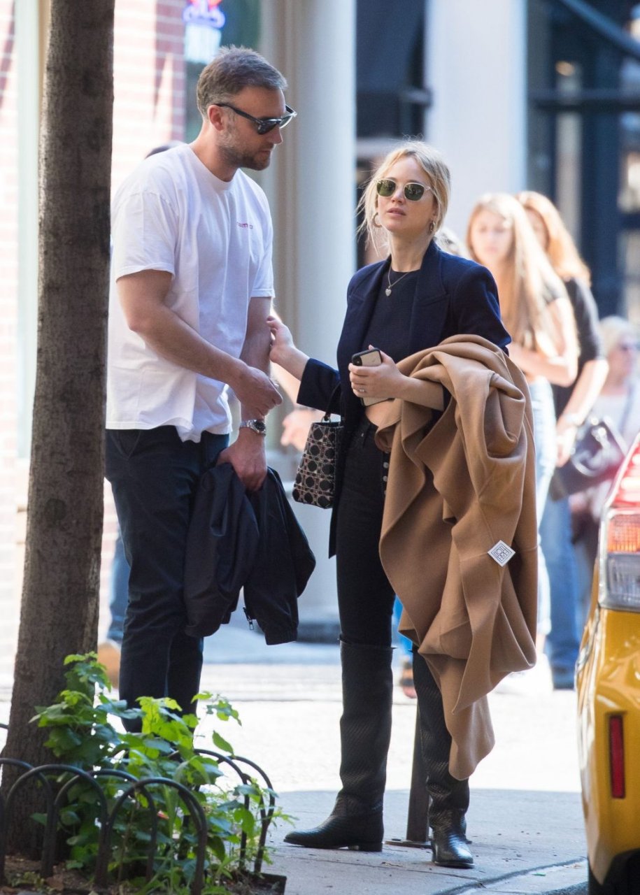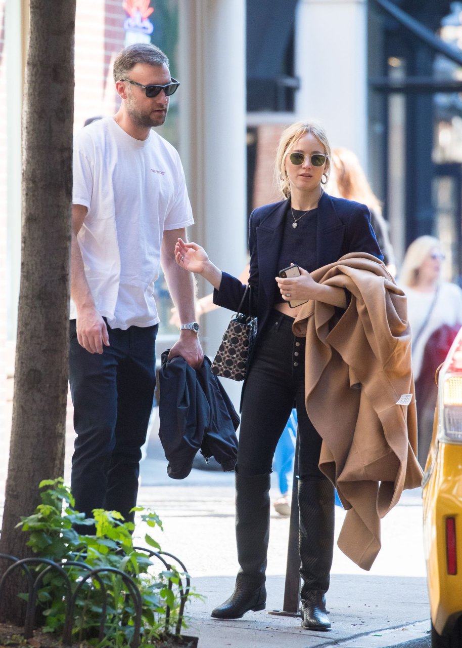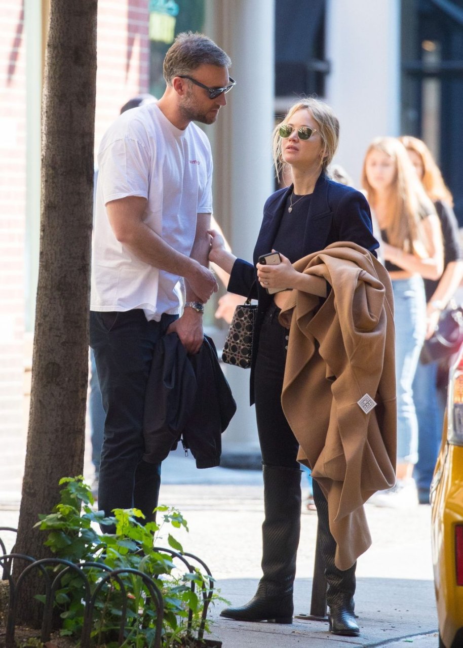 Jennifer Lawrence y Cooke Maroney comparten un largo beso antes de separarse en la ciudad de Nueva York, 14/10/2019. La actriz de 29 años llevaba un bolso Dior, y vestía un blazer negro, crop top, pantalones con cierre de botones y botas hasta la rodilla.