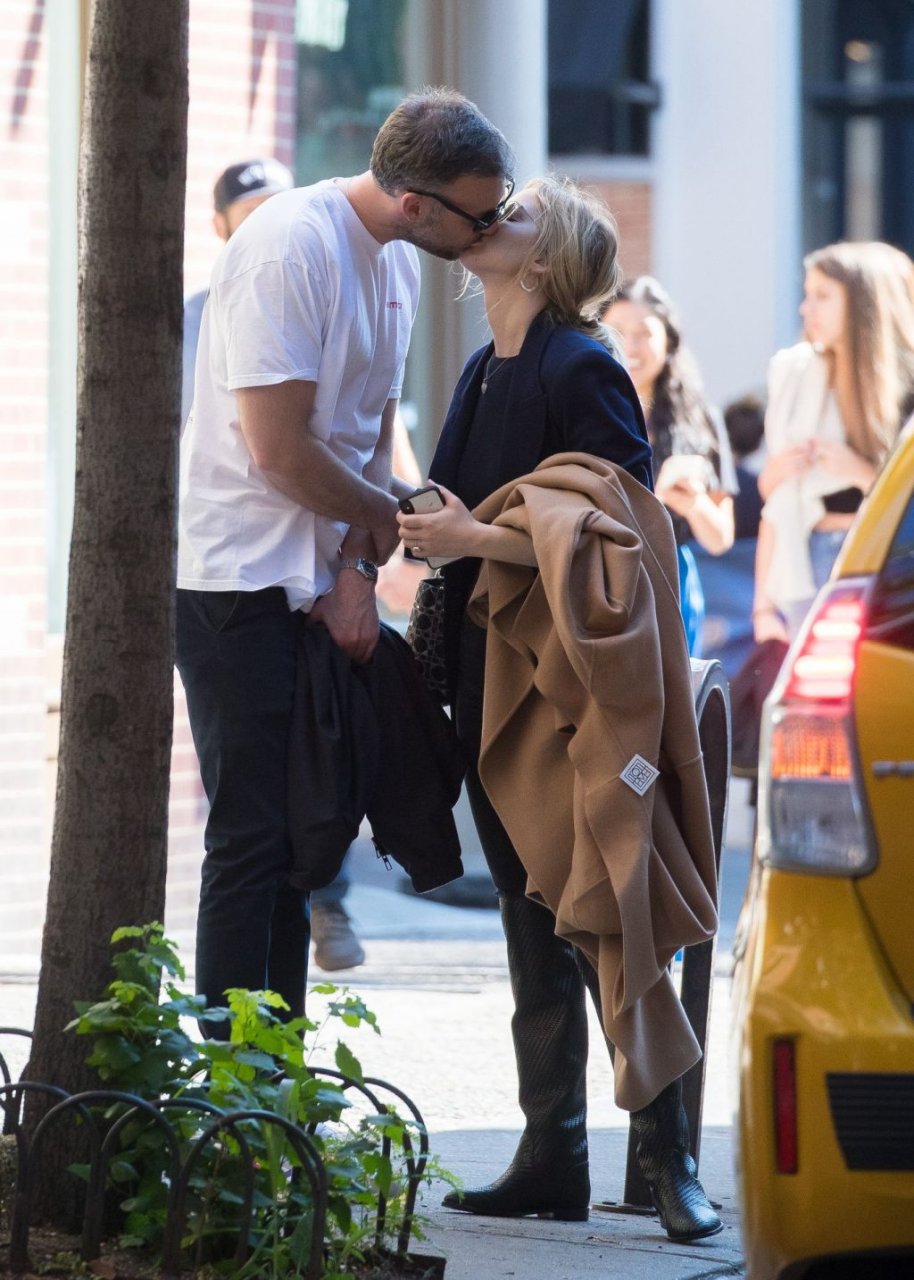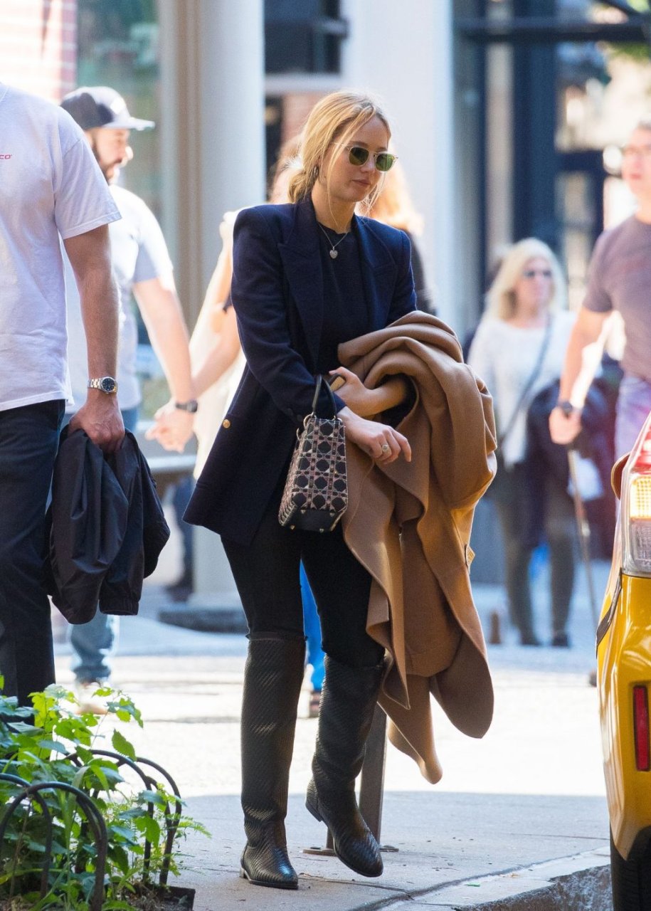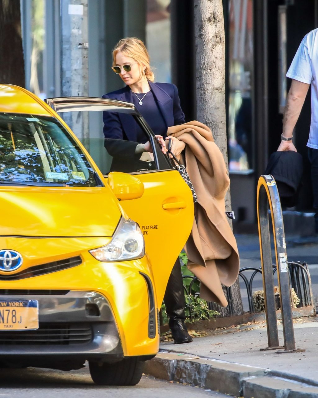 Jennifer Lawrence y Cooke Maroney comparten un largo beso antes de separarse en la ciudad de Nueva York, 14/10/2019. La actriz de 29 años llevaba un bolso Dior, y vestía un blazer negro, crop top, pantalones con cierre de botones y botas hasta la rodilla.