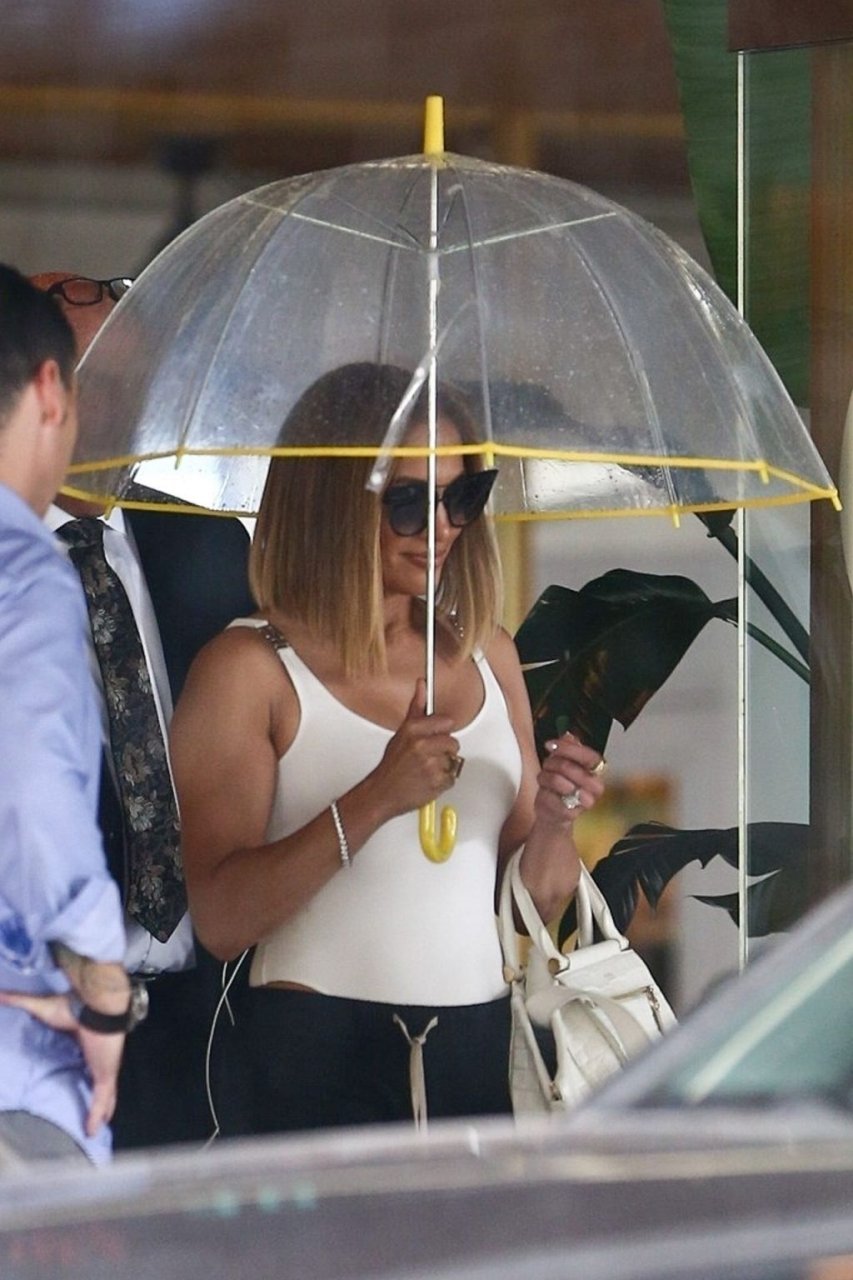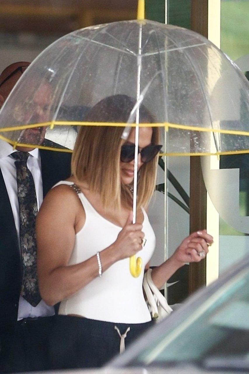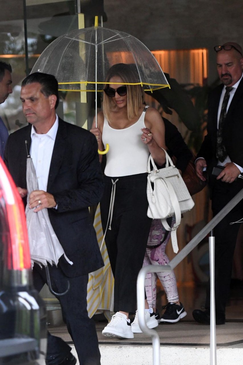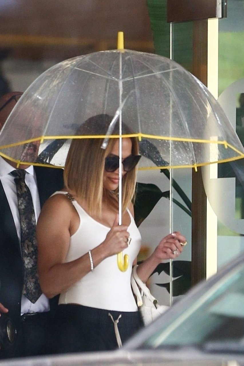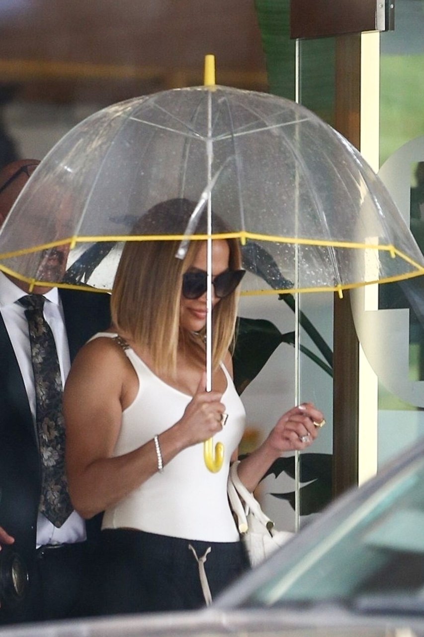Jennifer Lopez desafía la lluvia de Miami bajo un paraguas transparente después de disfrutar del almuerzo en un hotel de Miami Beach, 13/09/2019.