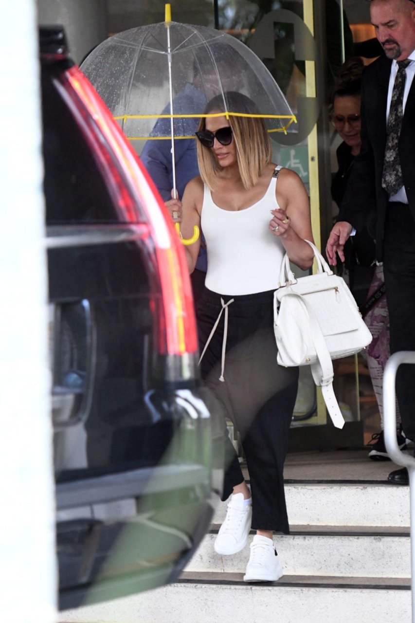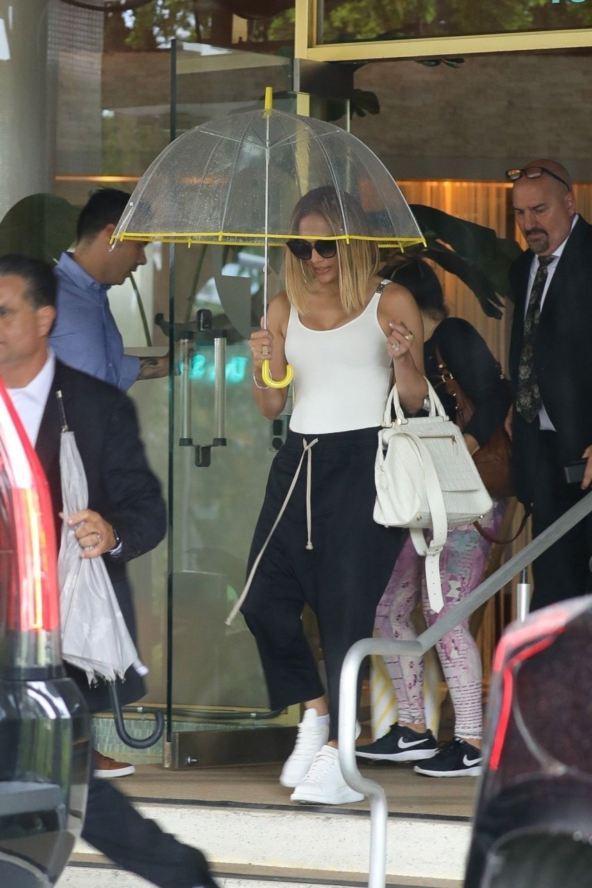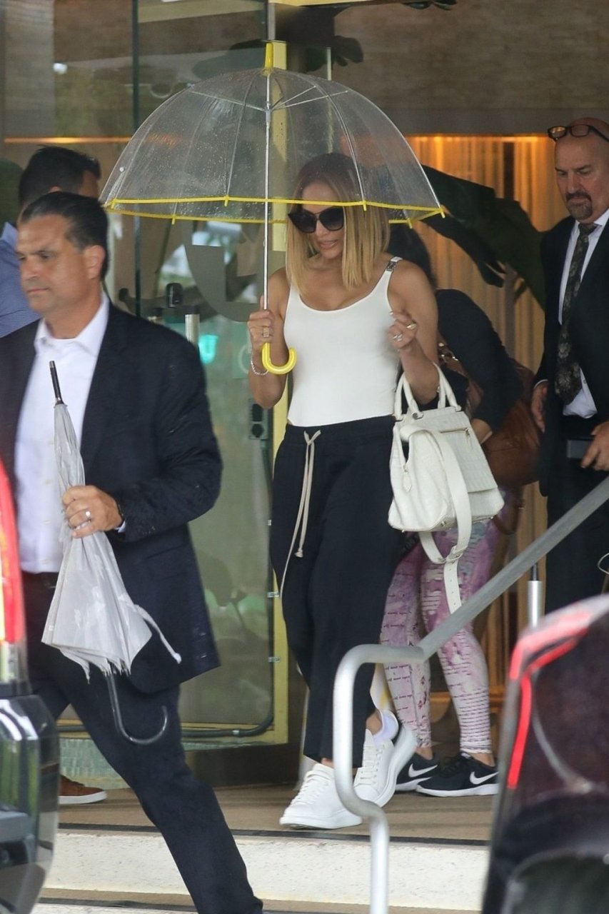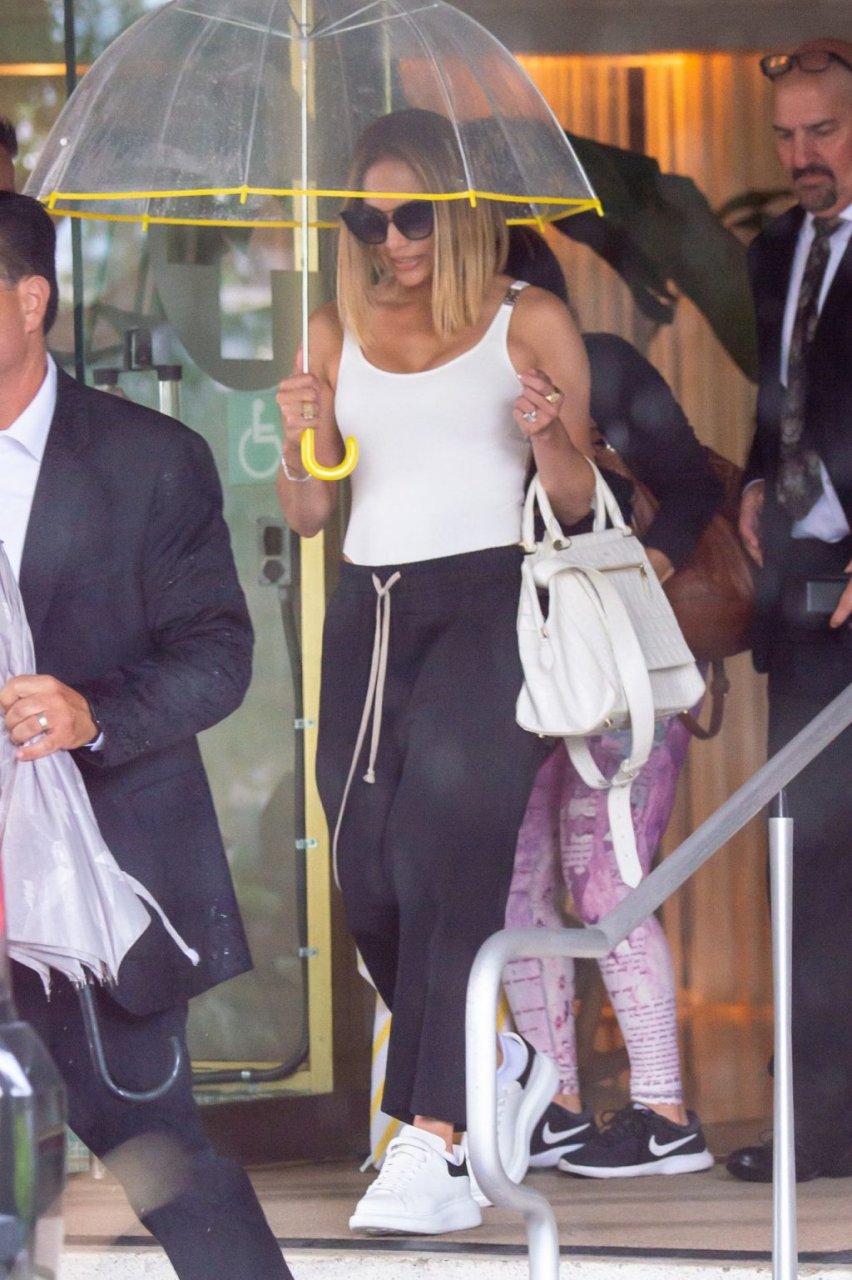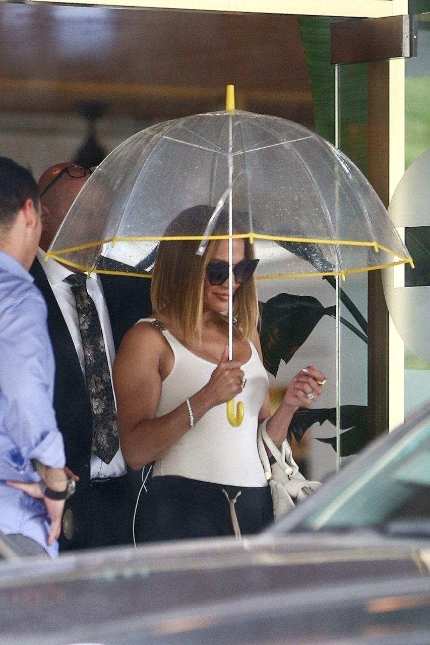 Jennifer Lopez desafía la lluvia de Miami bajo un paraguas transparente después de disfrutar del almuerzo en un hotel de Miami Beach, 13/09/2019.