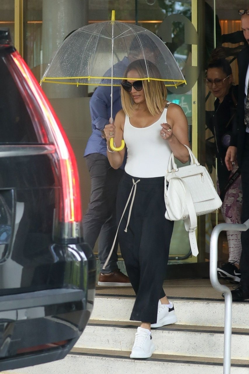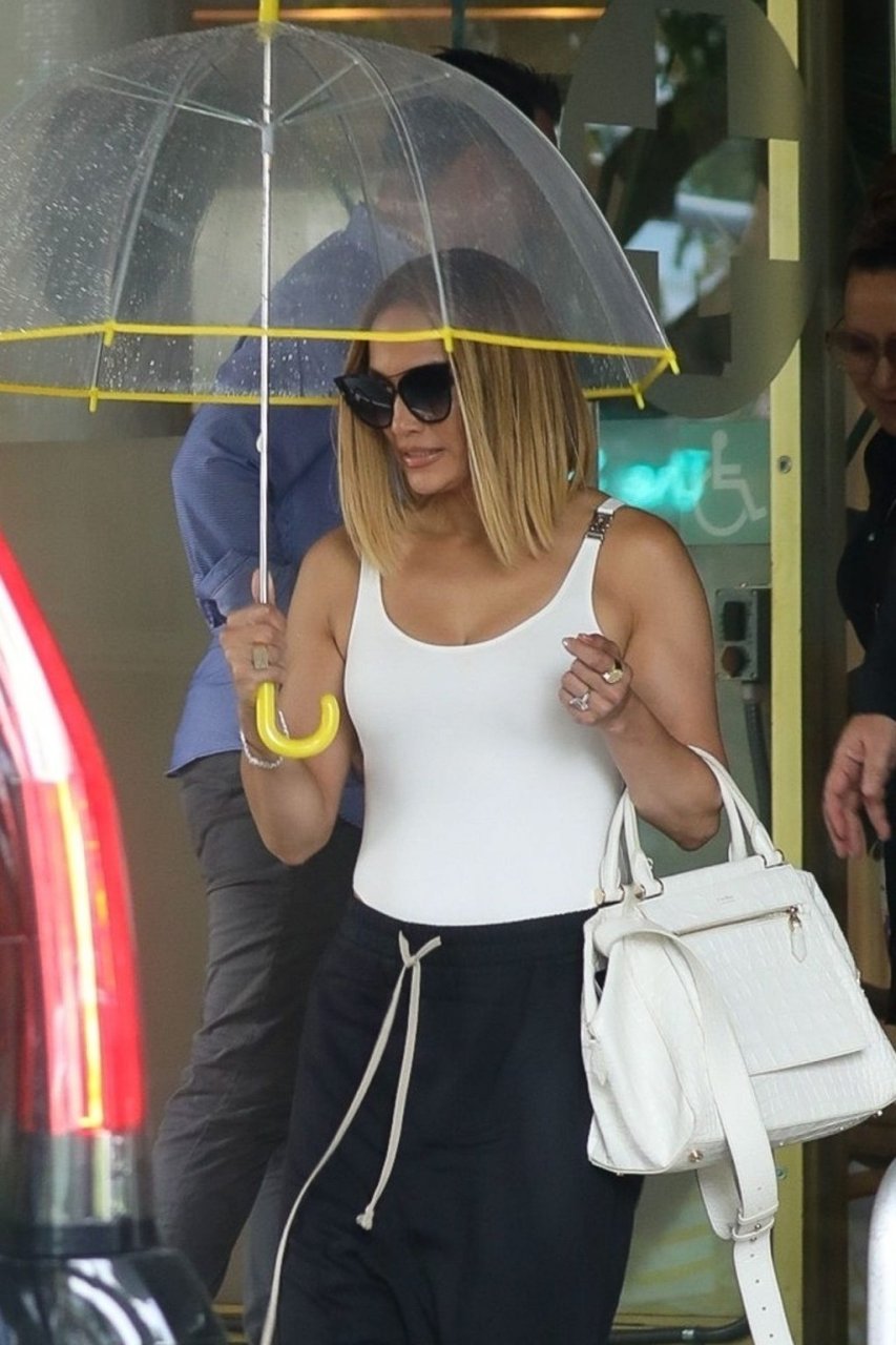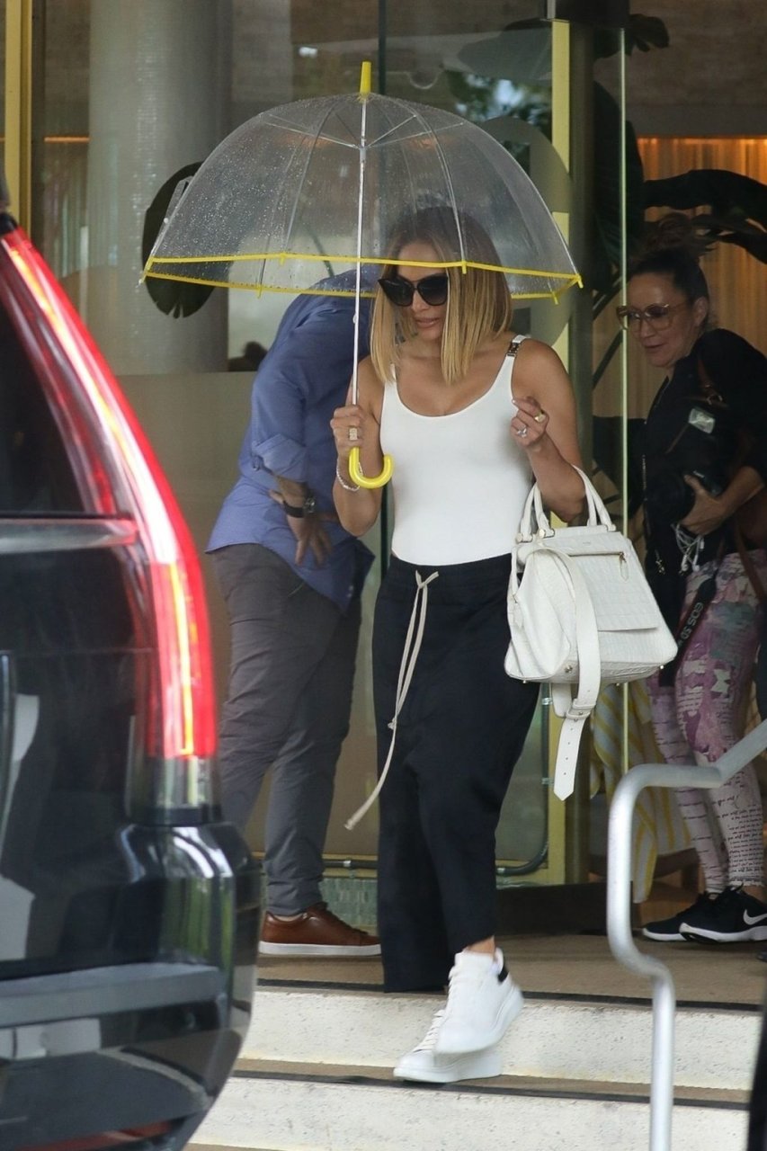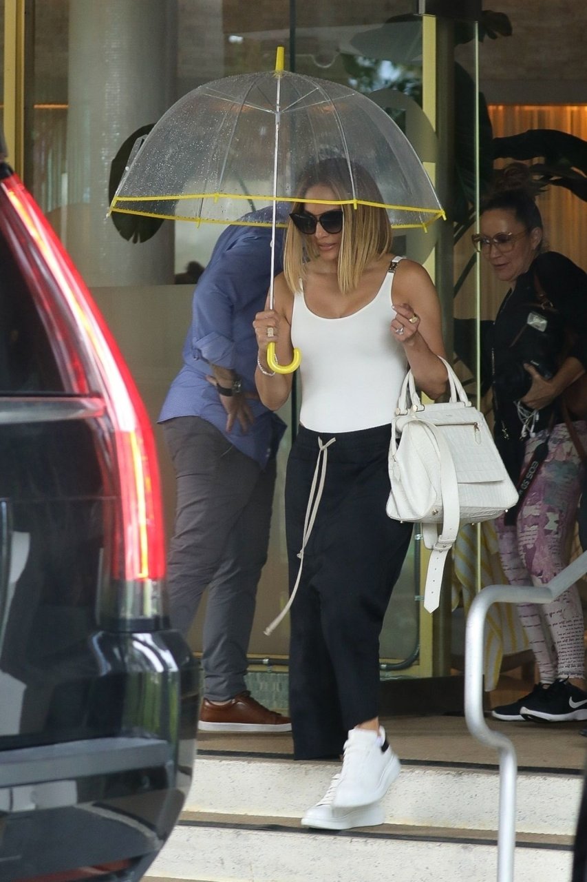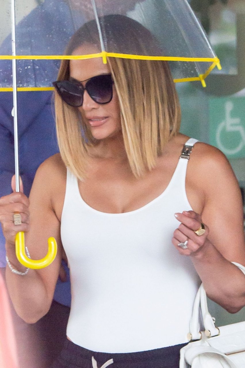 Jennifer Lopez desafía la lluvia de Miami bajo un paraguas transparente después de disfrutar del almuerzo en un hotel de Miami Beach, 13/09/2019.