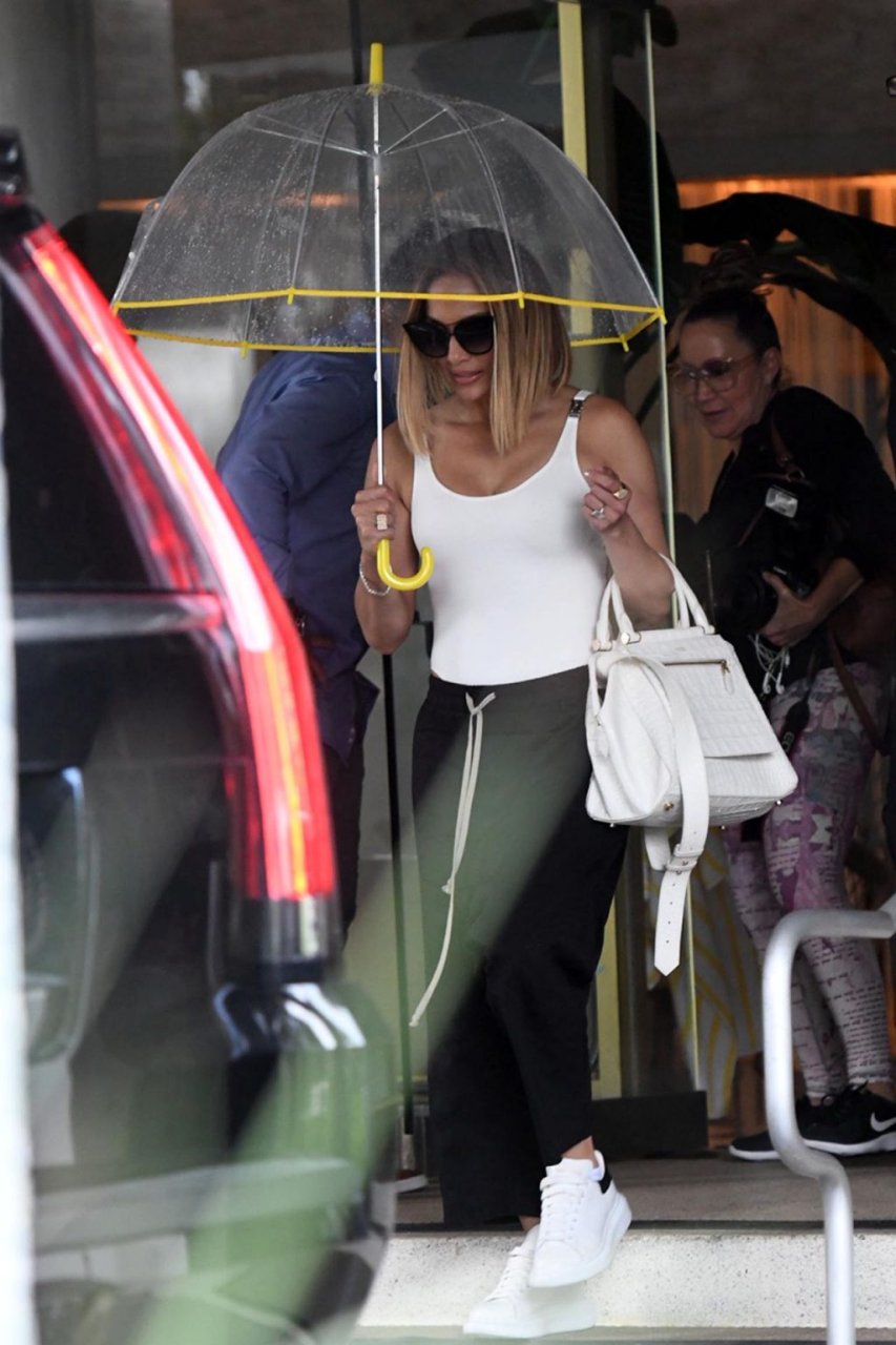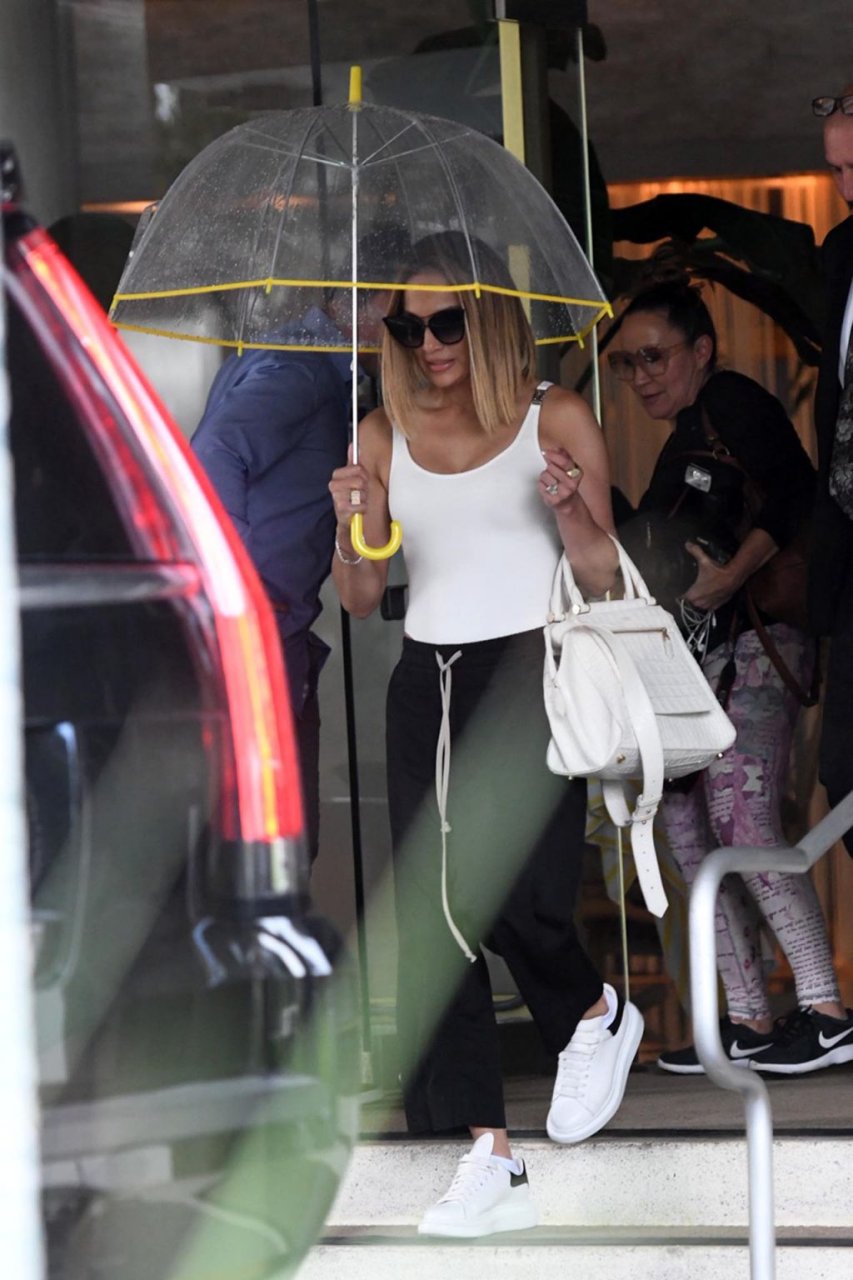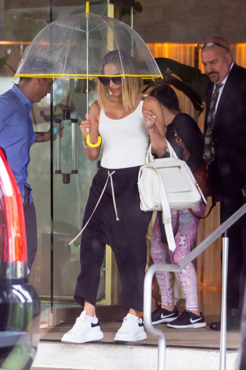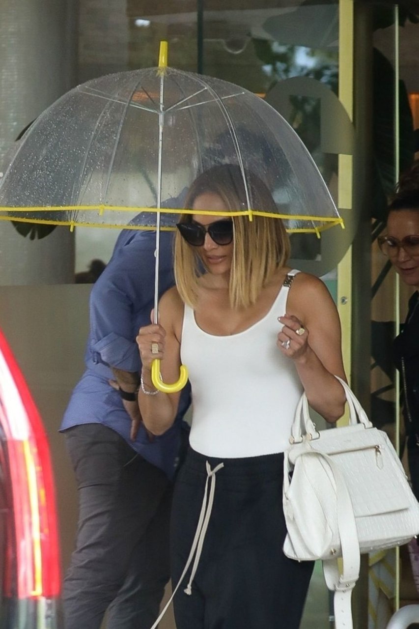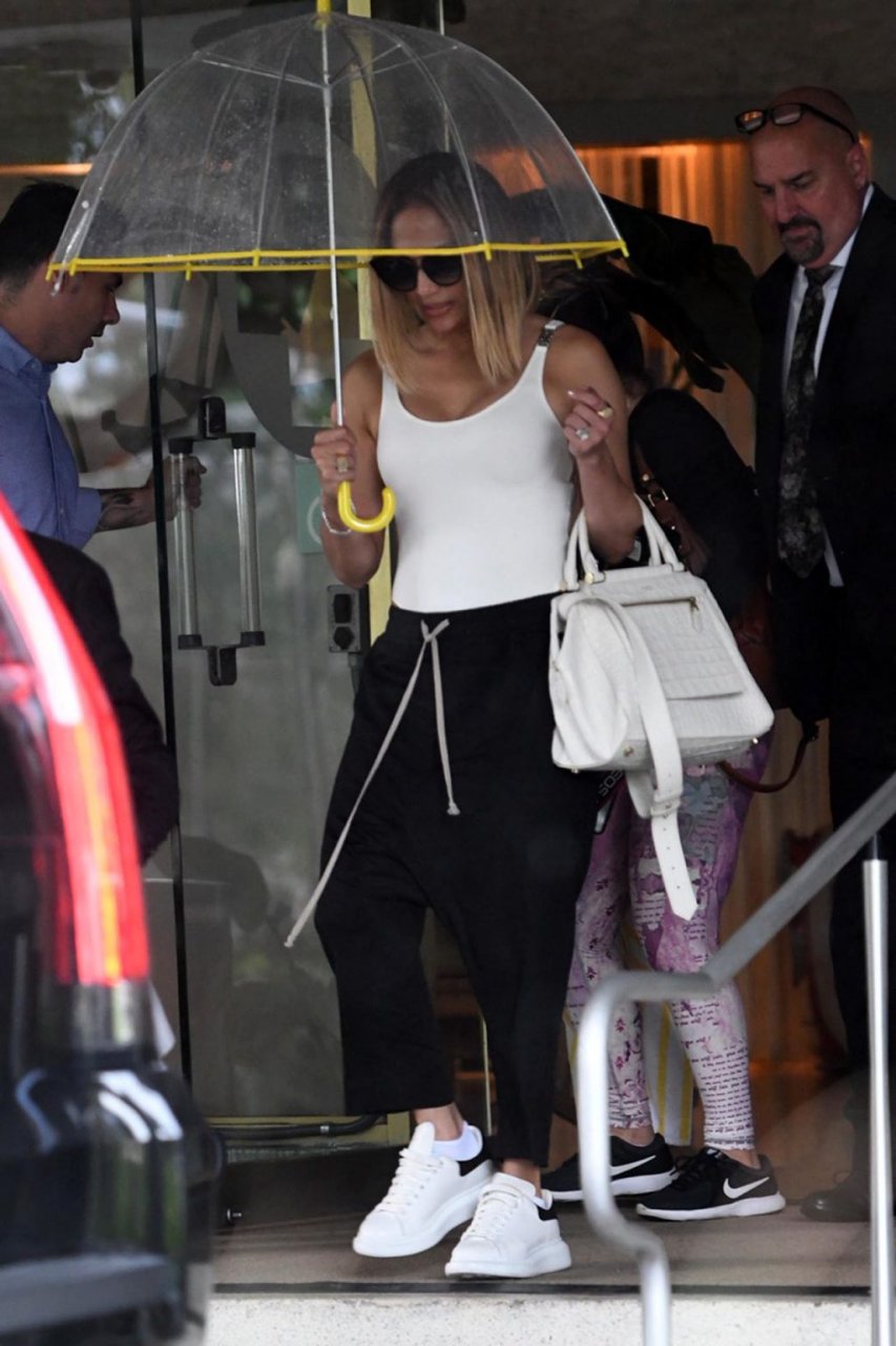 Jennifer Lopez desafía la lluvia de Miami bajo un paraguas transparente después de disfrutar del almuerzo en un hotel de Miami Beach, 13/09/2019.