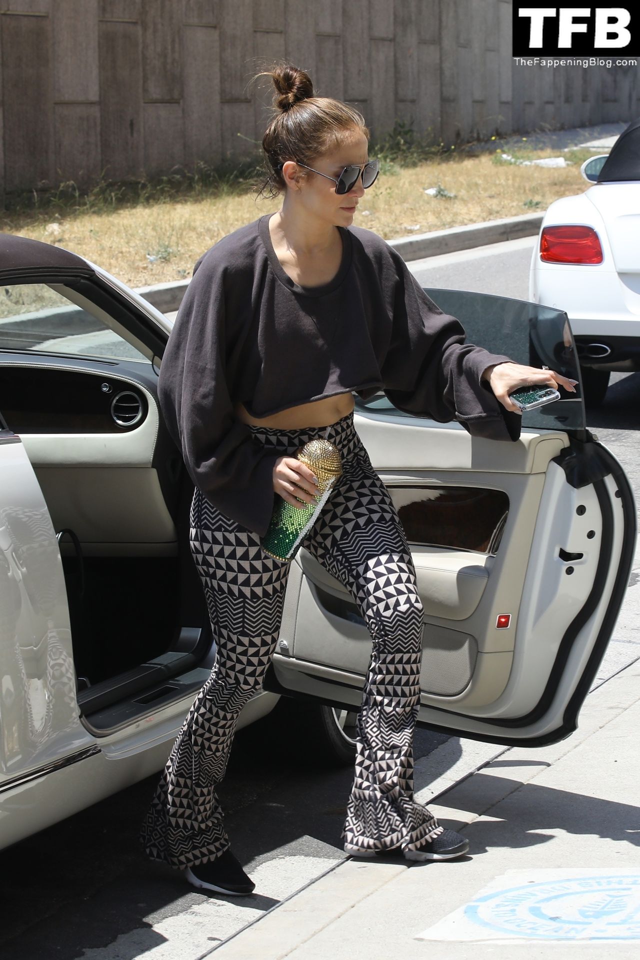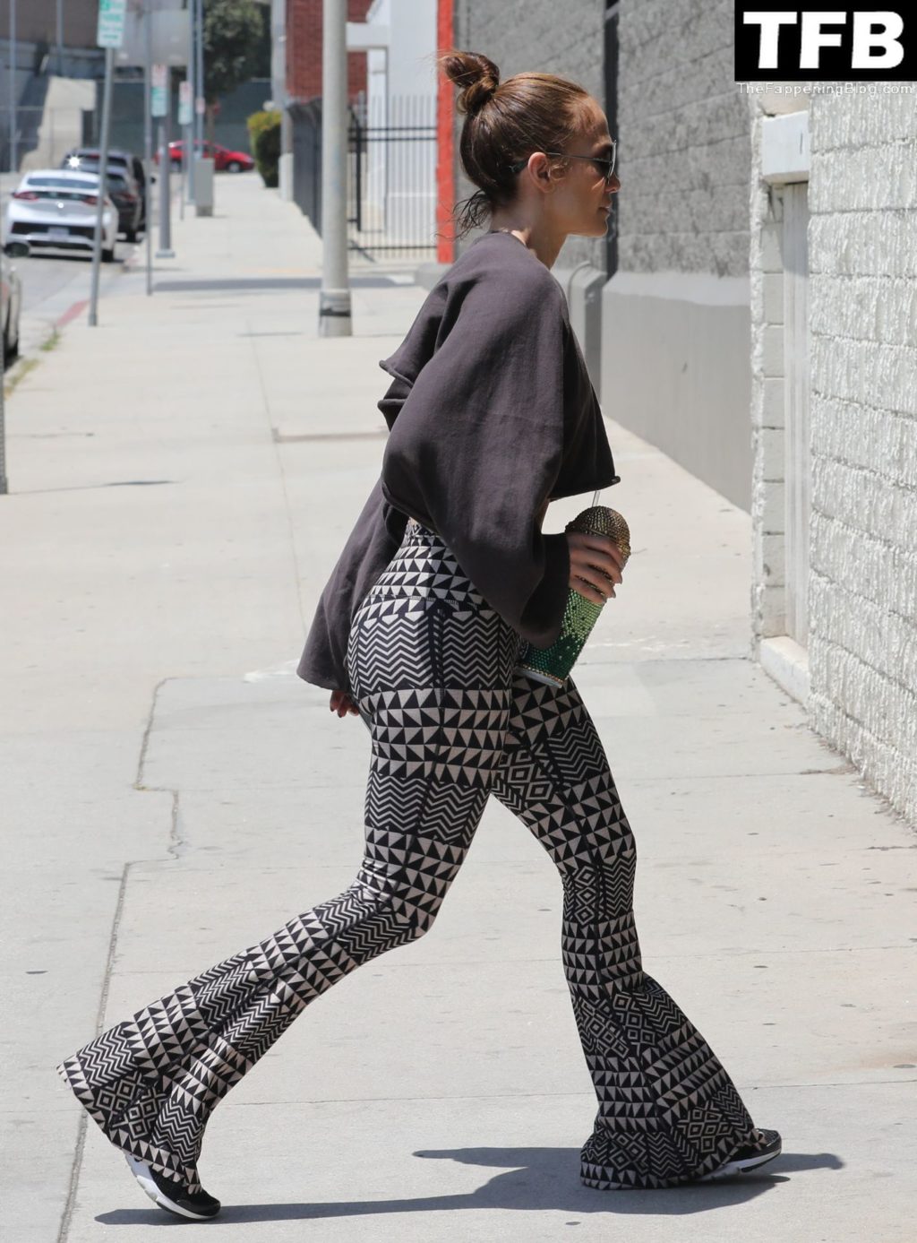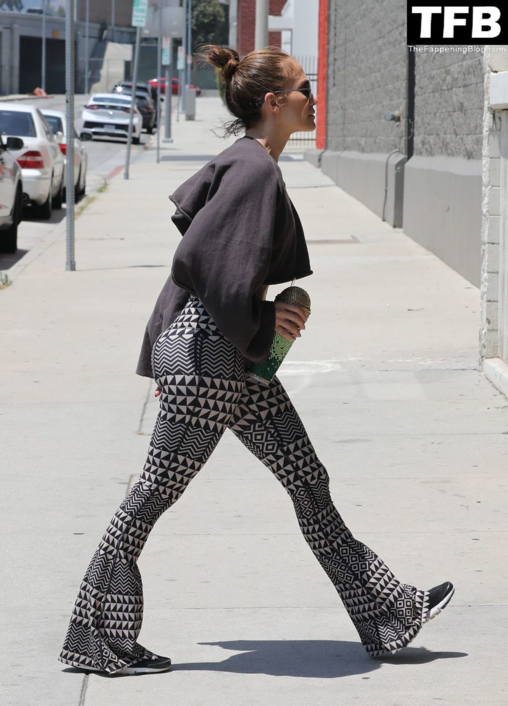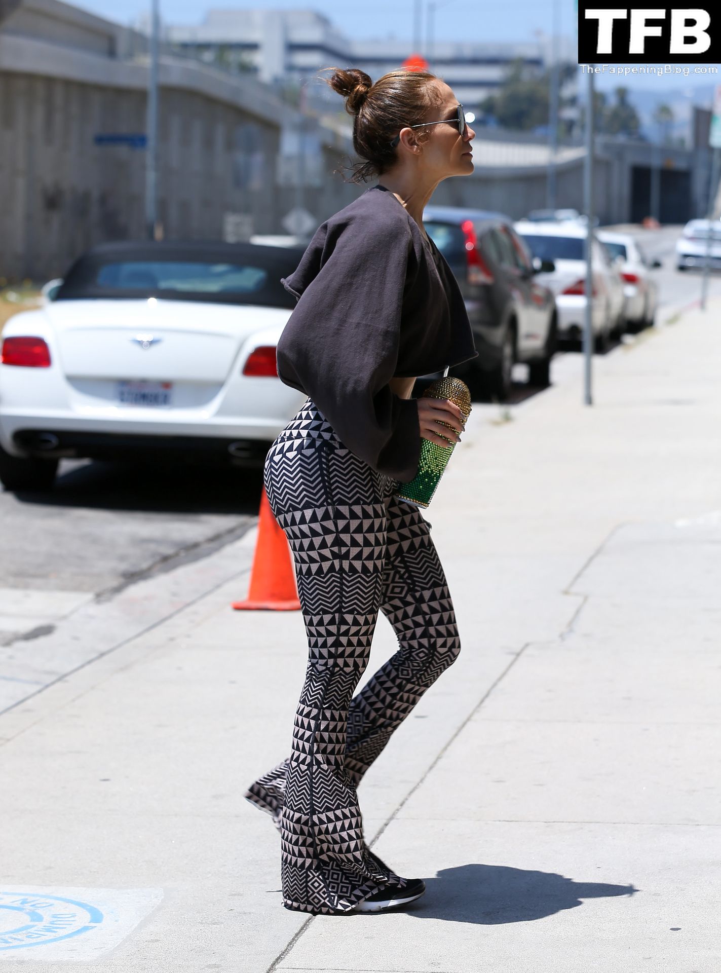 Jennifer Lopez llega al estudio de baile en Los Ángeles con leggings retro y una sudadera corta, 16/07/2022.
