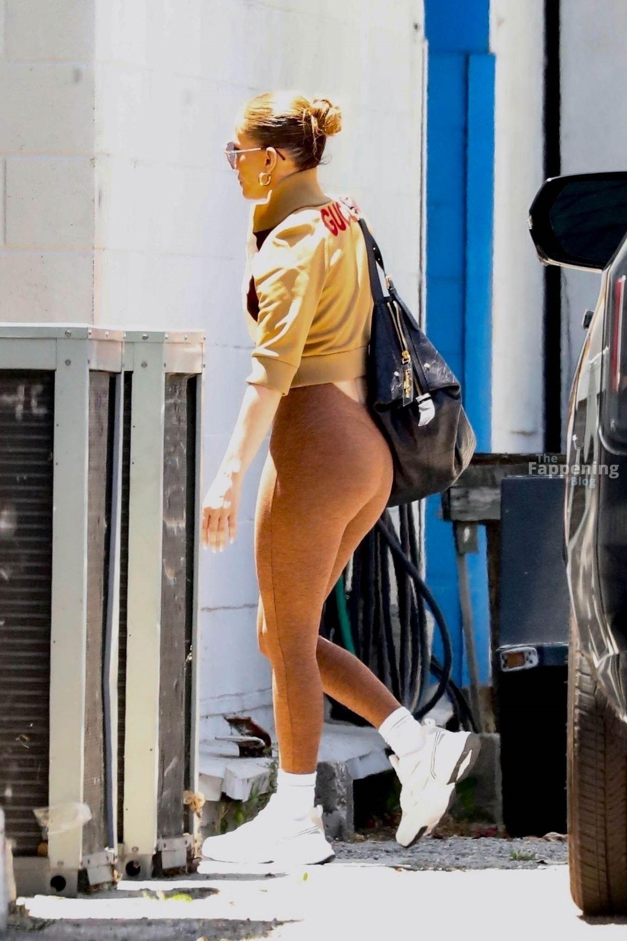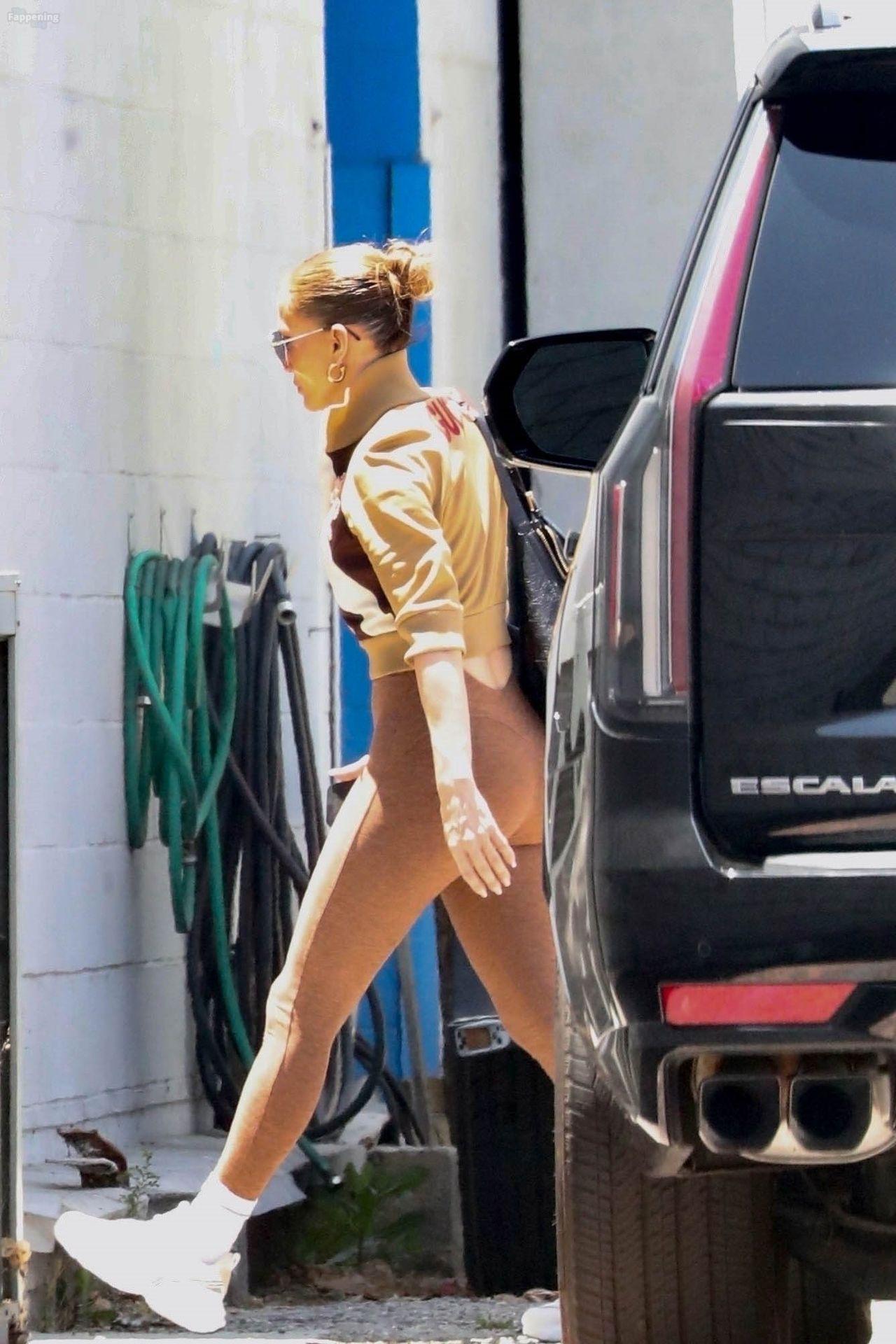 Superestrella cantante y actriz Jennifer Lopez luce una chaqueta deportiva Gucci mientras llega a un estudio en un día caluroso en Los Ángeles.