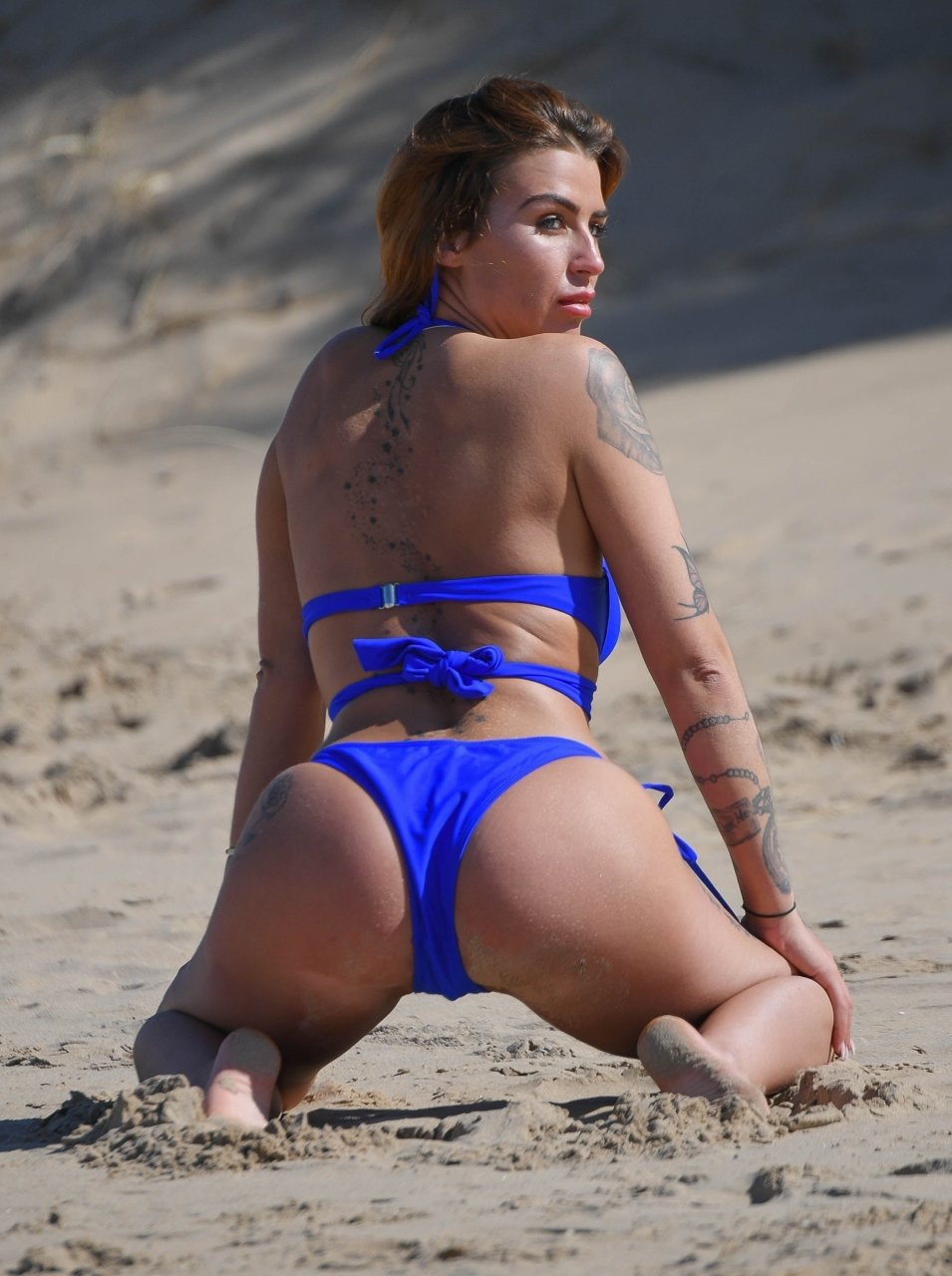 Personalidad de reality, la estrella de Ex On The Beach Jenny Thompson está tomando un poco de sol con un bikini azul en la playa de la Costa del Sol en España, 30/05/2018.