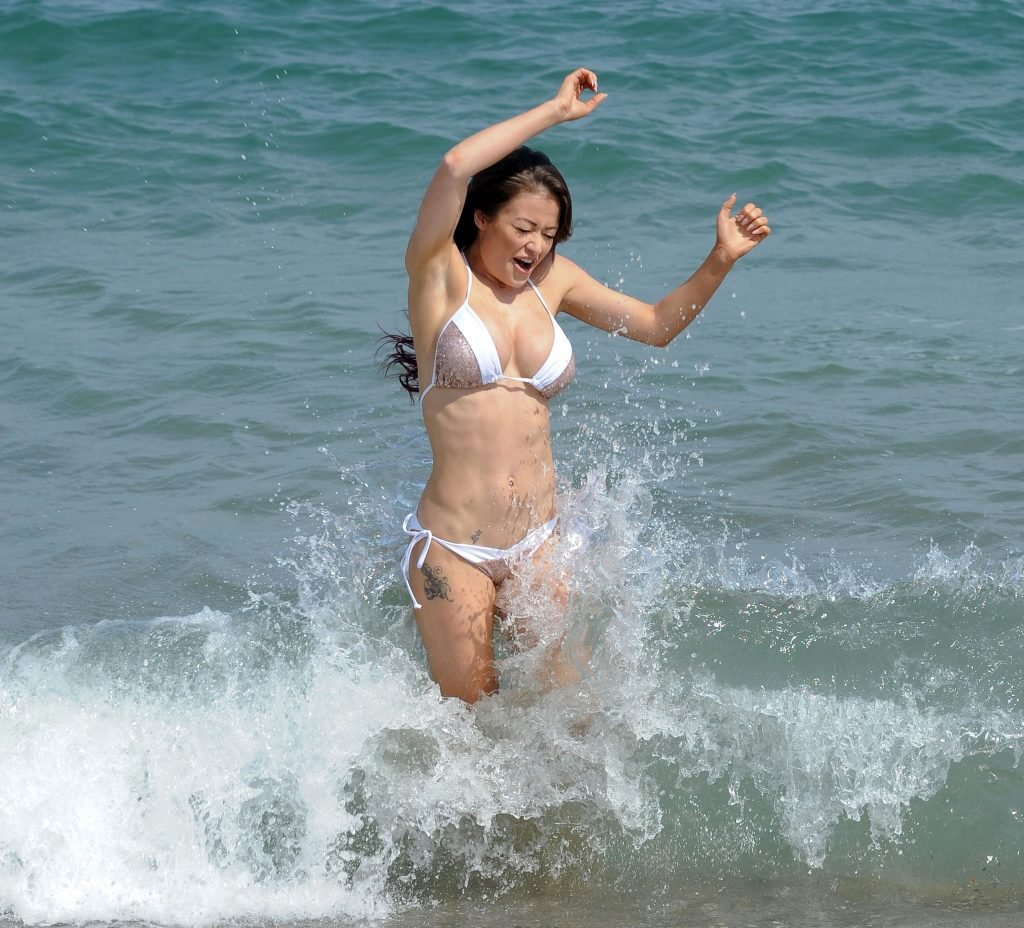 Modelo británica de glamour y estrella de ‘Celebrity Big Brother’ Jess Impiazzi disfruta refrescándose en la playa en España. La belleza morena terminó en cuarto lugar en la última serie de Celebrity Big Brother y ahora está disfrutando de un descanso mientras exhibe su cuerpo perfecto con un bikini blanco de dos piezas, 19/02/2018.