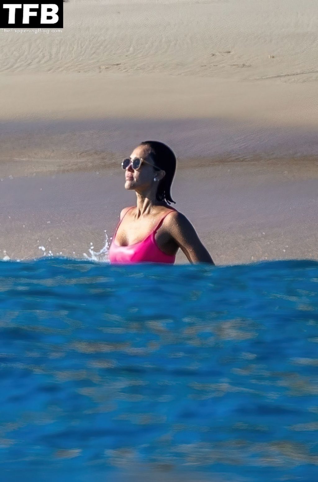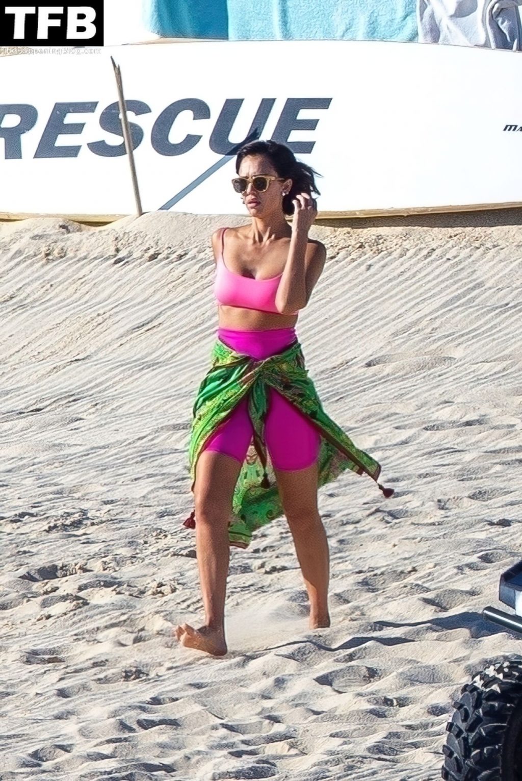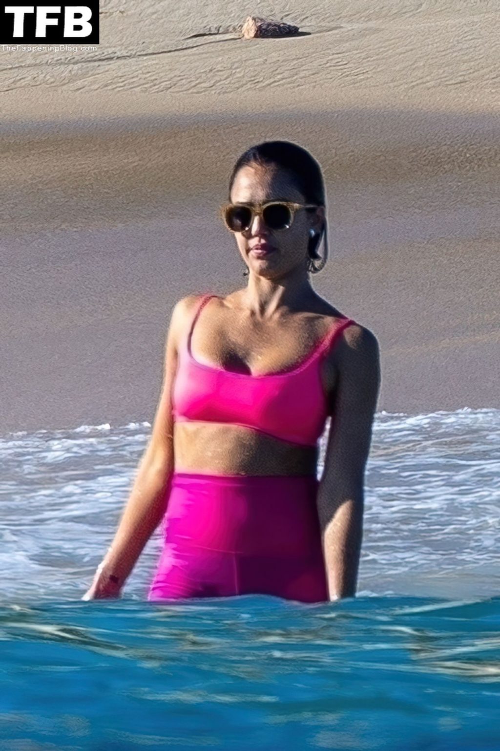La fundadora de The Honest Company lució un top de bikini rosa fuerte con pantalones cortos estilo ciclista a juego mientras se la veía disfrutando de un baño. La mamá de tres hijos de 40 años también fue vista enfundando su figura en forma con un bikini de hilo con estampado floral.