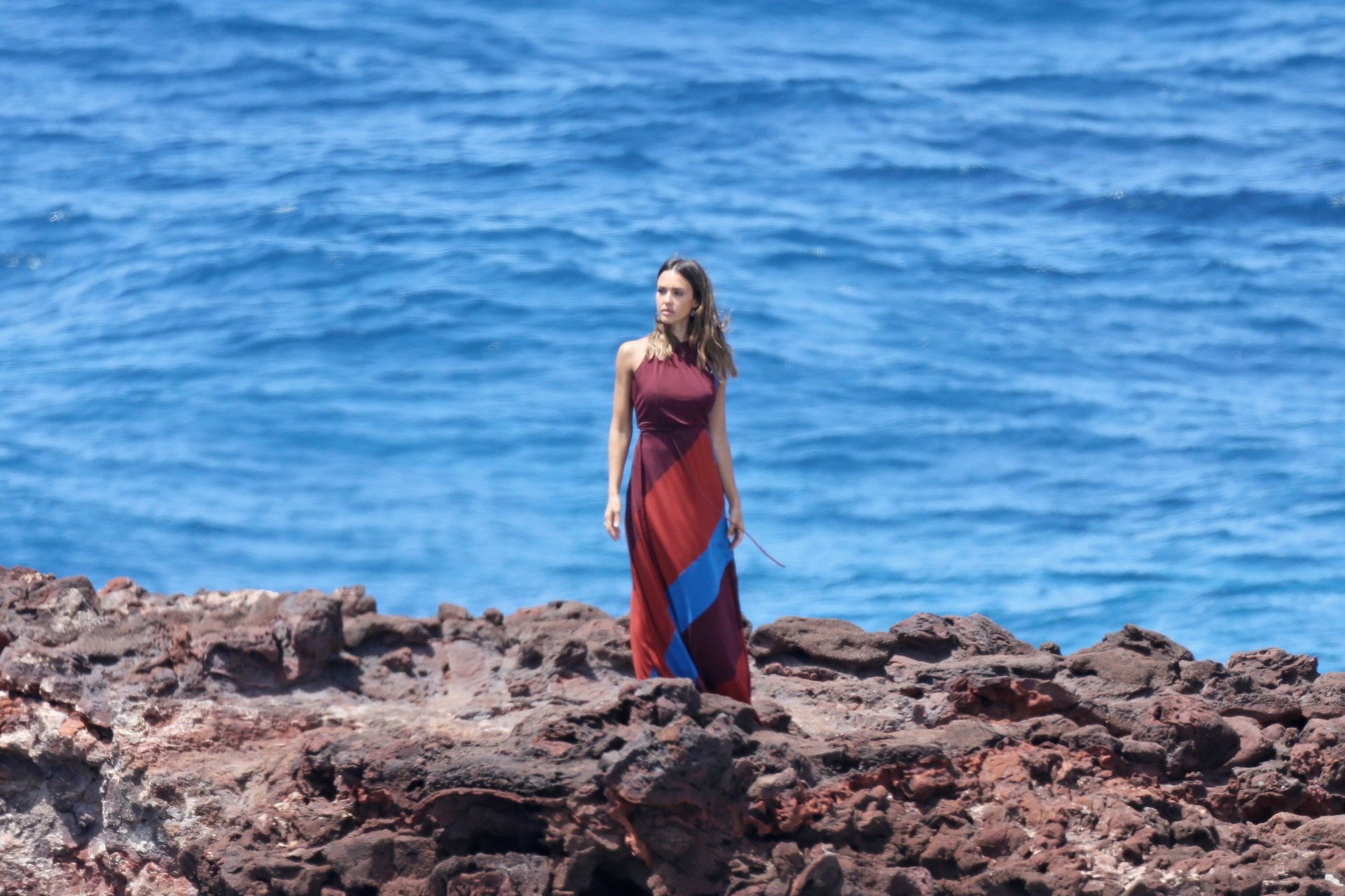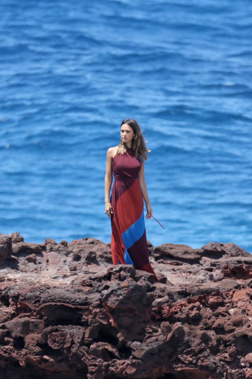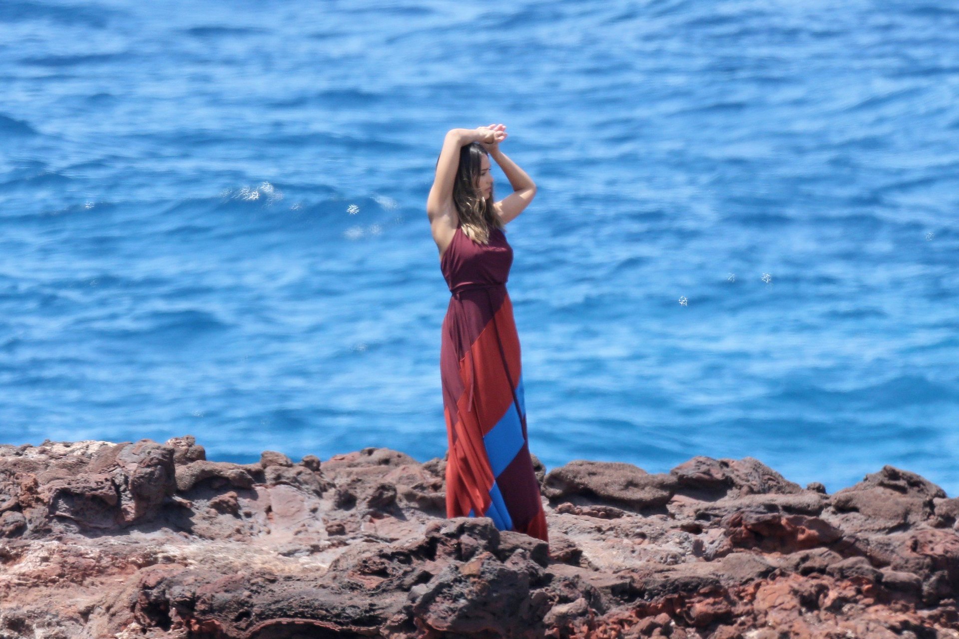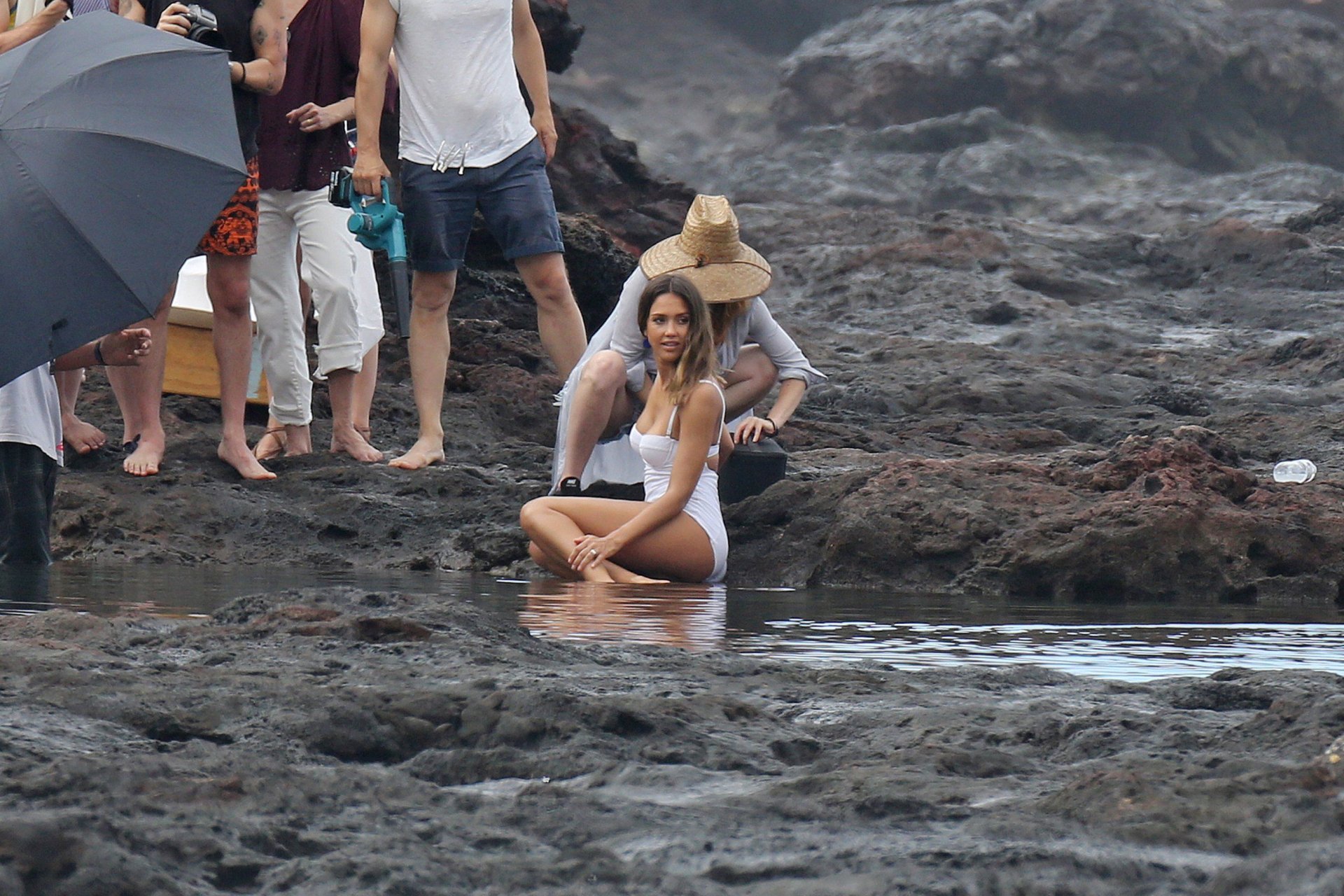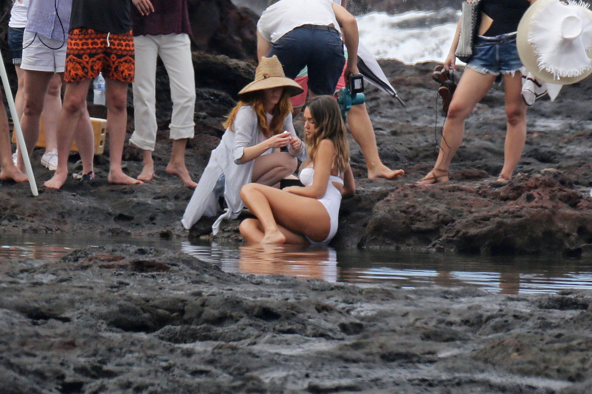 Paparazzi capturaron a Jessica Alba con un traje de baño blanco y un vestido púrpura durante una sesión de fotos en Hawái, 24/04/2016. Jessica Alba es una actriz y modelo estadounidense, conocida por “Sin City”, “Awake” y “The Sleeping Dictionary”. Edad 34 (28 de abril de 1981).