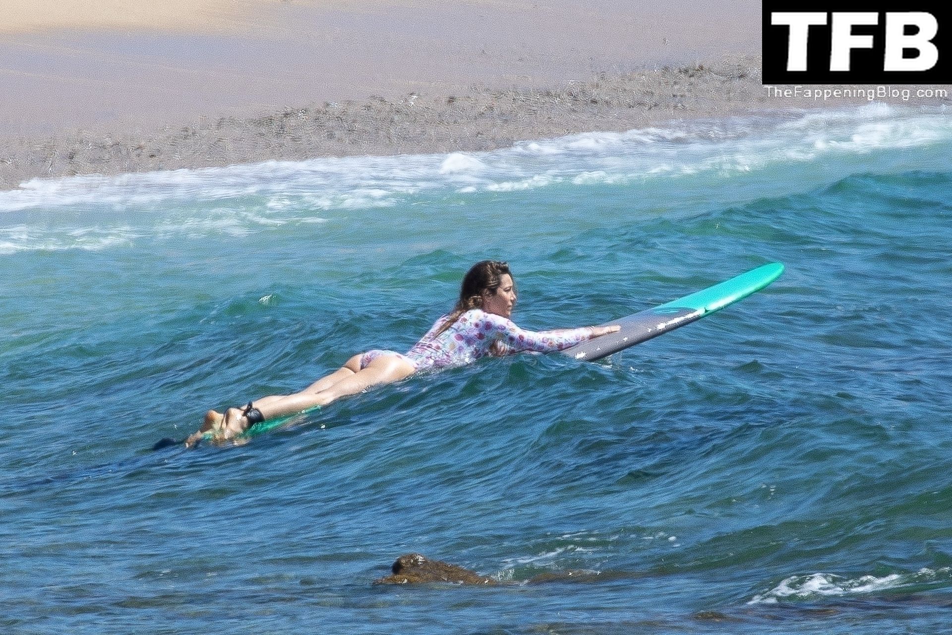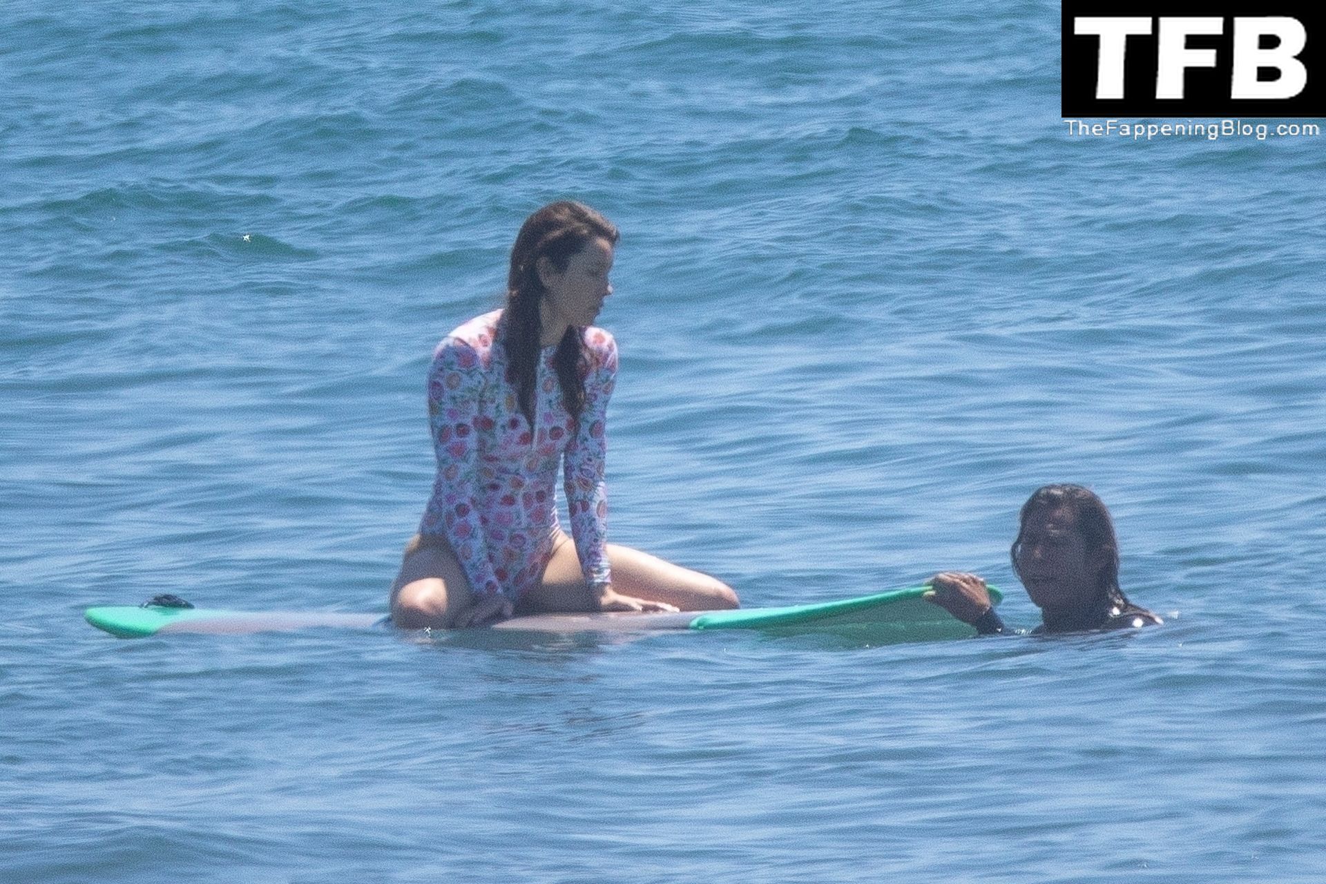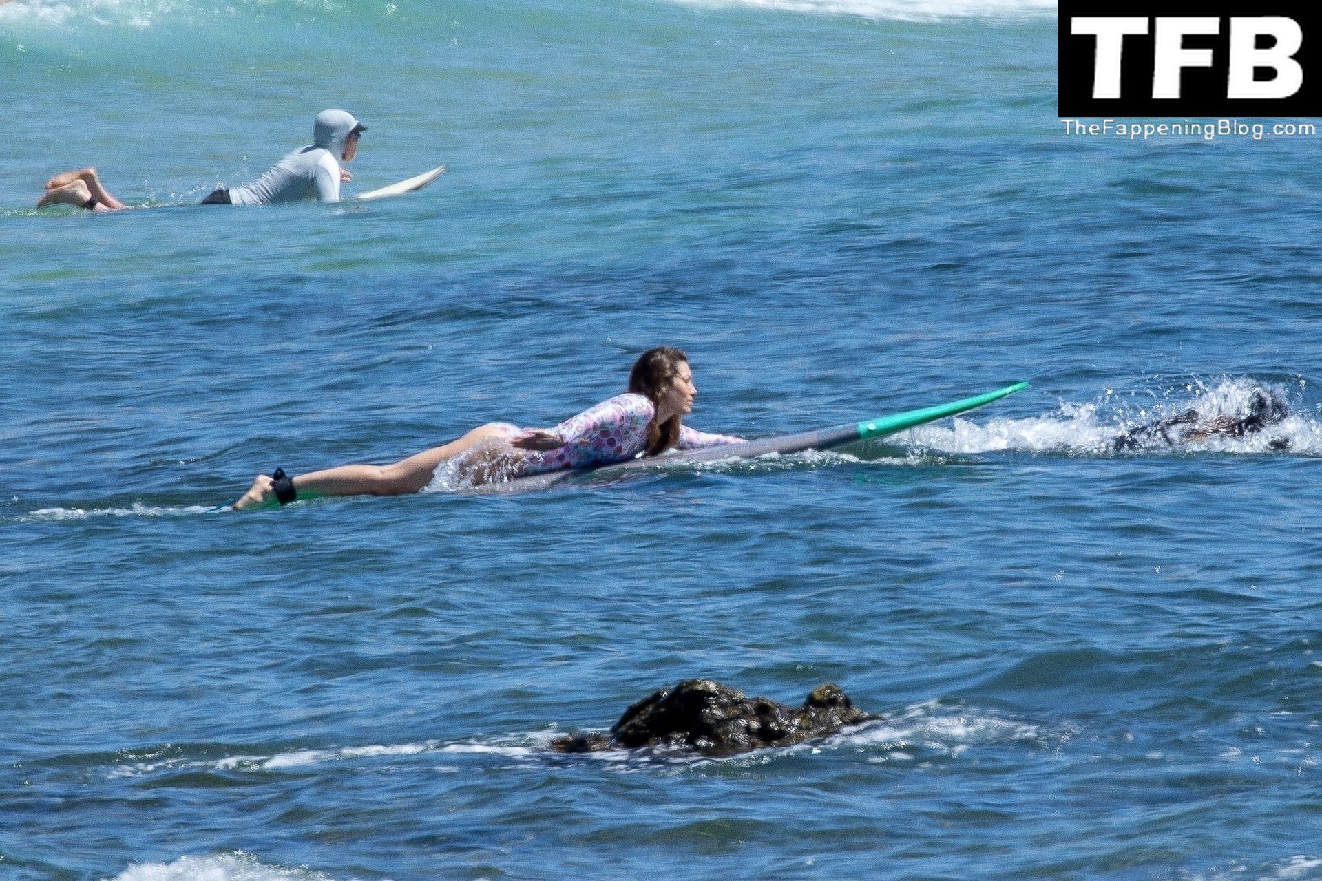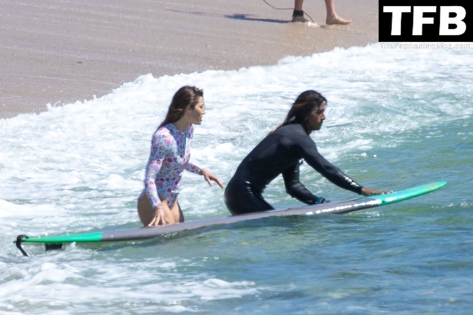 Jessica lució su figura atlética con un traje de baño de una pieza con estampado floral y fue vista saliendo a surfear mientras Justin se relajaba en su resort.
