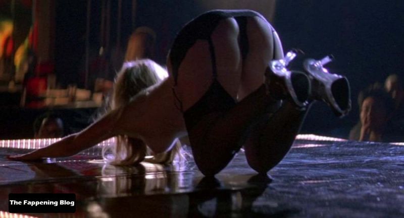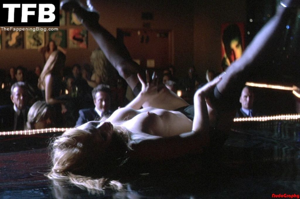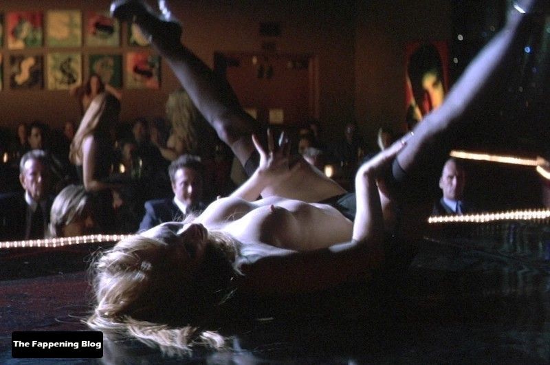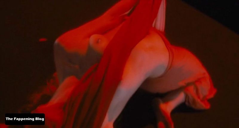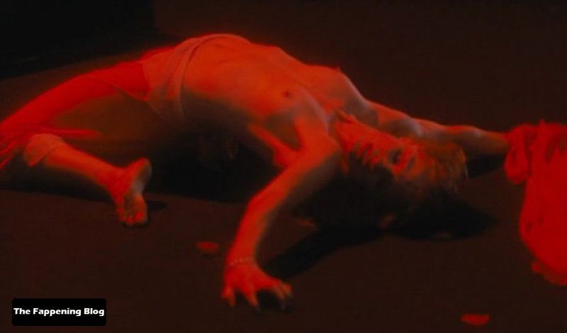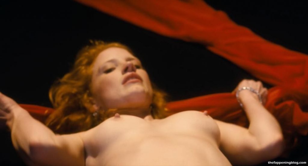 Jessica Chastain of Interstellar fame is performing a belly dance on a stage shaking her breasts wildly under her red top until they start to pop out causing her to rip off her top and bra and toss them to the side and then roll around on the ground topless continuing to shake and jiggle her breasts while arching her back until finally she collapses onto her back in exhaustion giving us a much better look at her breasts as she breathes heavily all while a group of people on a stage watch her and talk.