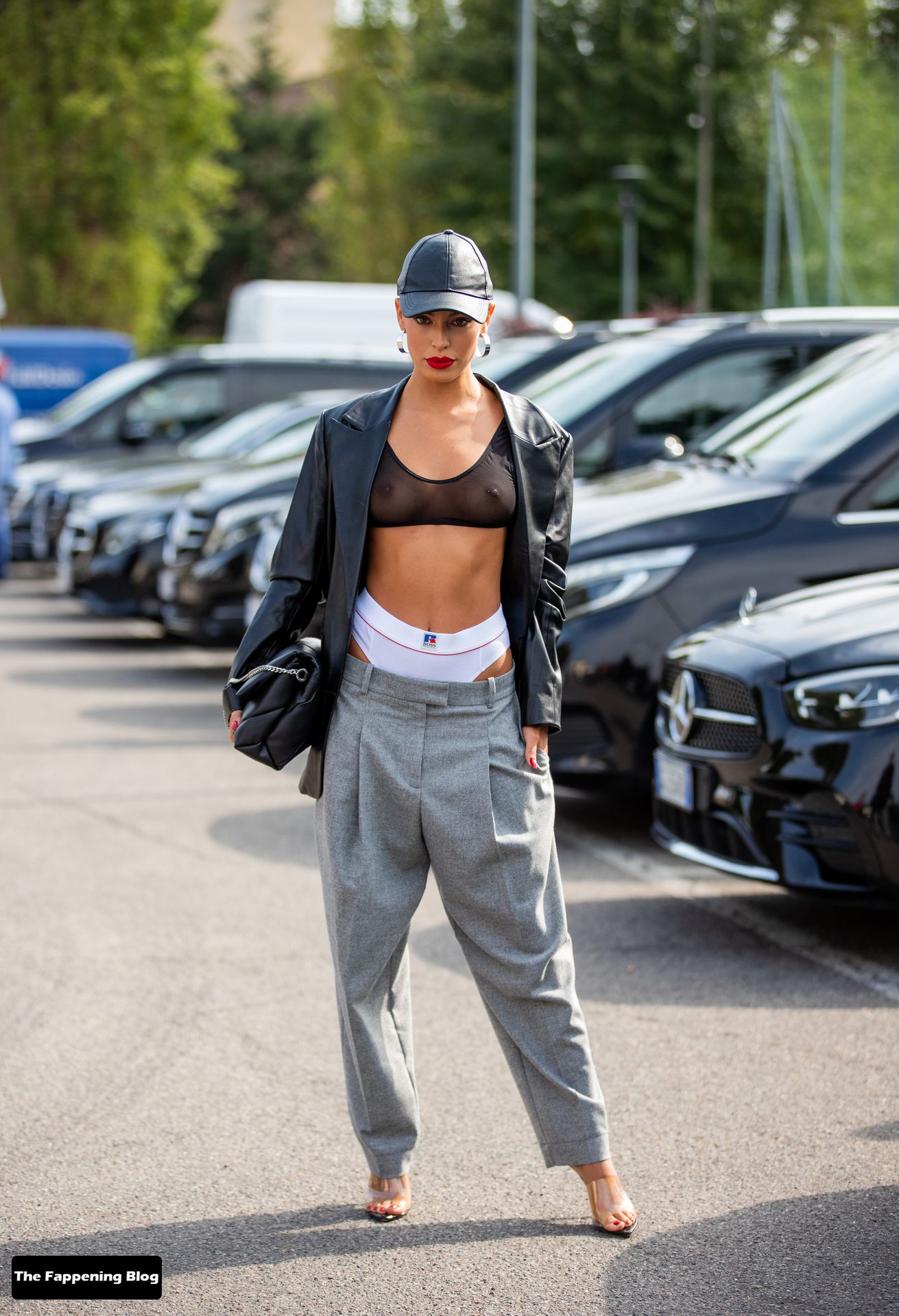 Jessica Goicoechea se ve con una blusa transparente, ropa interior, gorra, chaqueta negra, pantalones grises fuera de Boss durante la Semana de la Moda de Milán – Primavera/Verano 2022 en Milán, 23/09/2021.