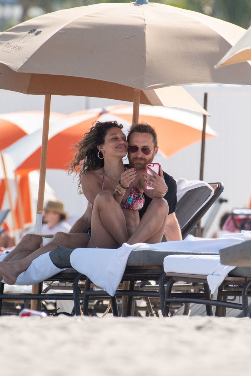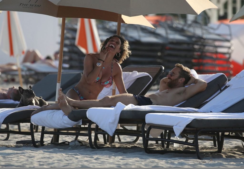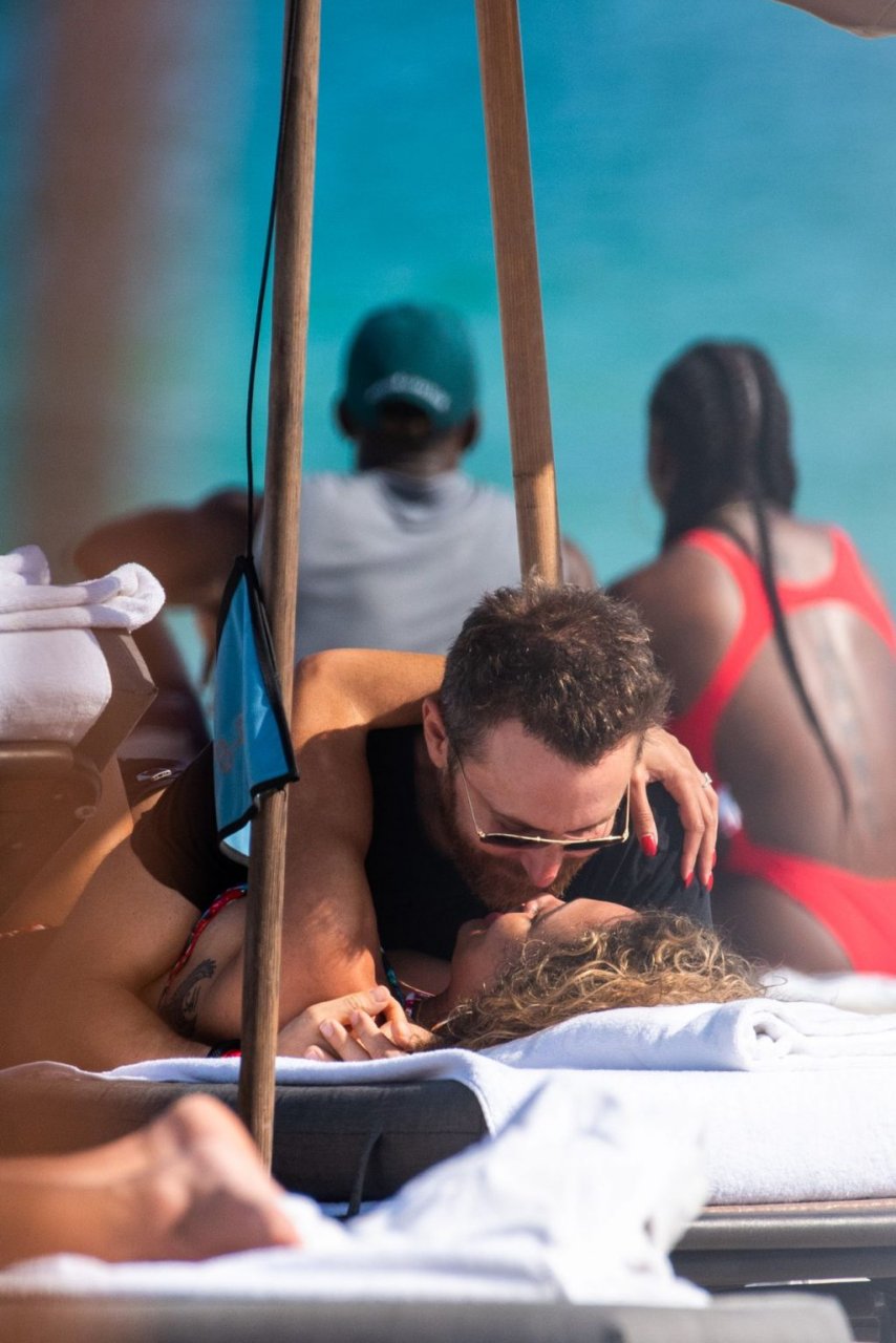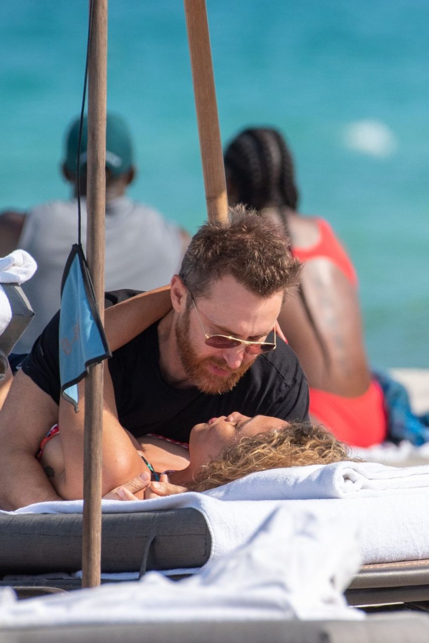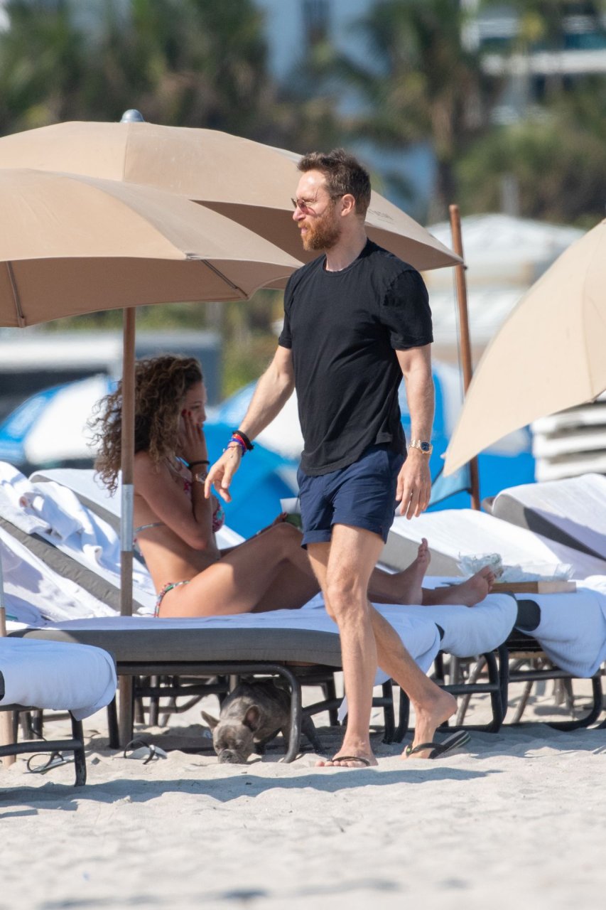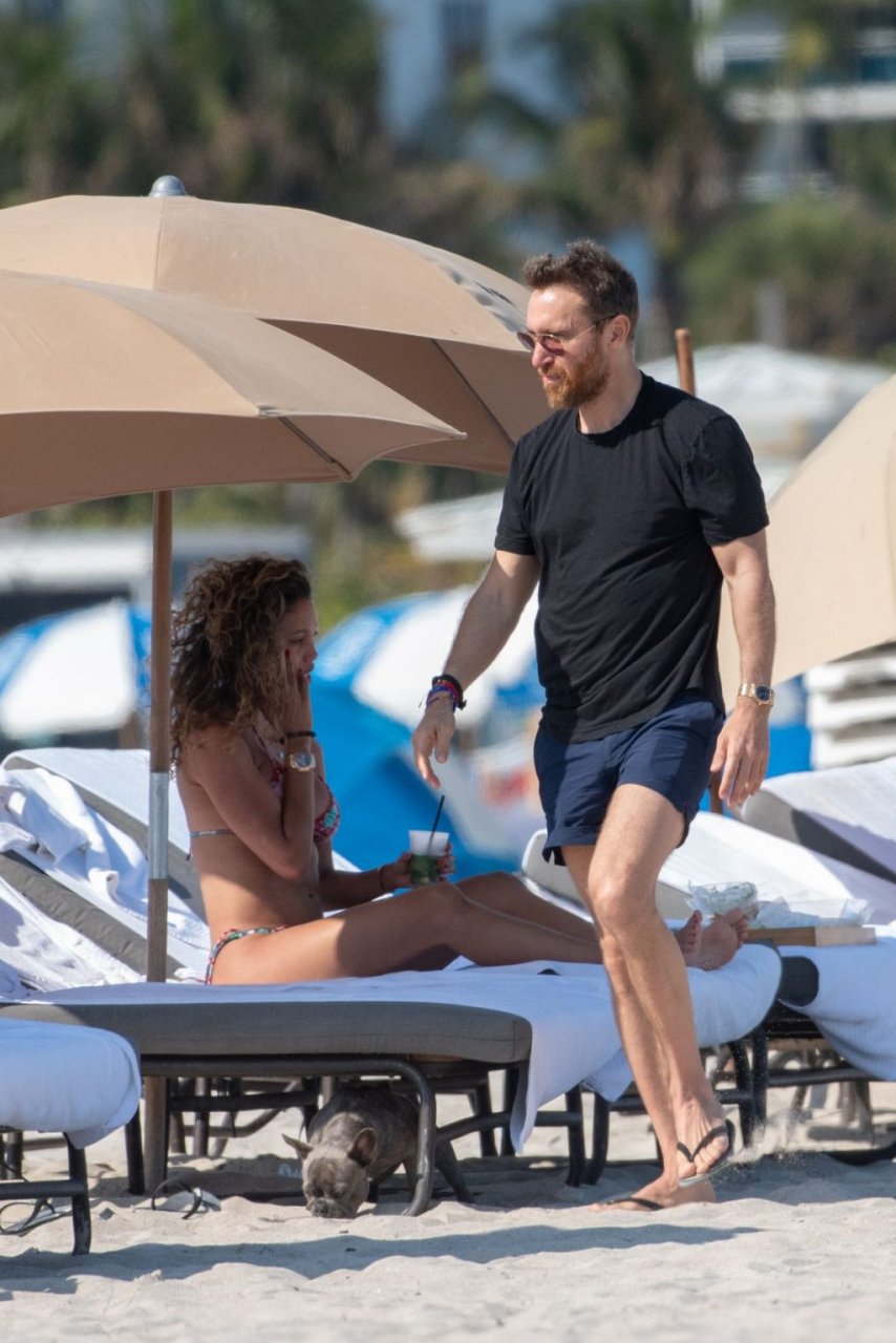Dj David Guetta y su novia Jessica Ledon tienen besos apasionados en la playa de Miami Beach, 12/03/2019. Jess mostró sus curvas mientras jugaba con el perro.