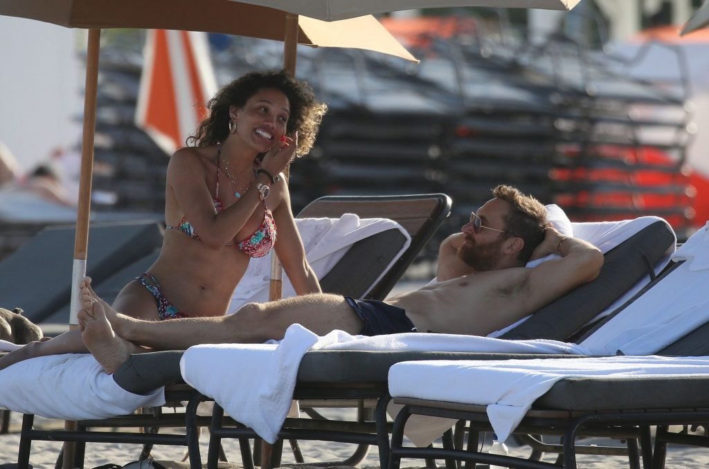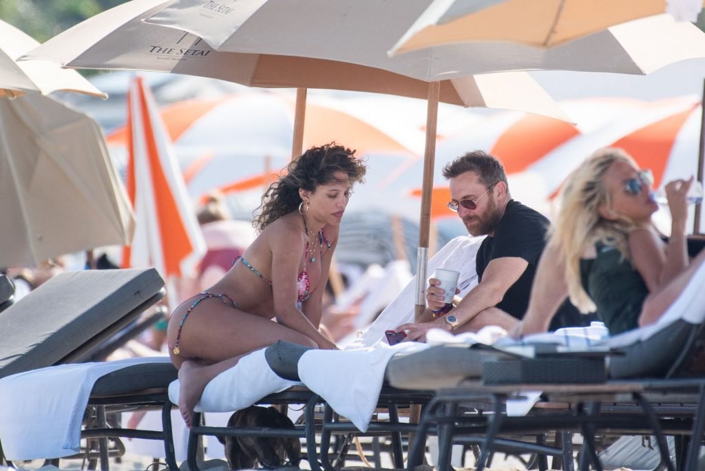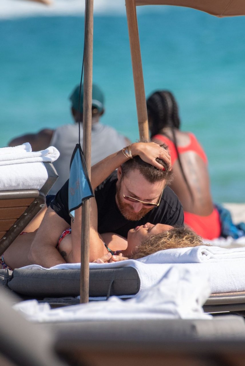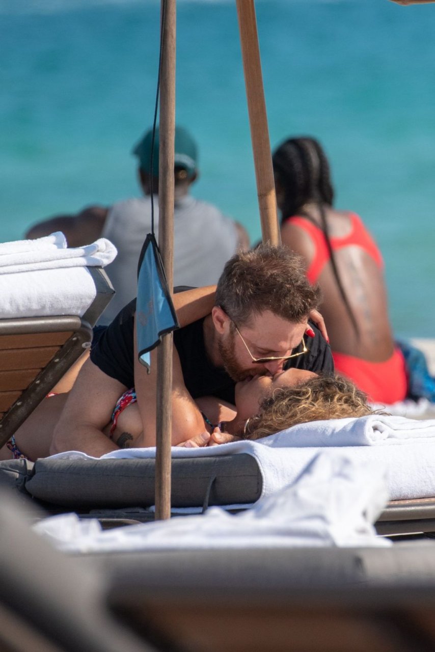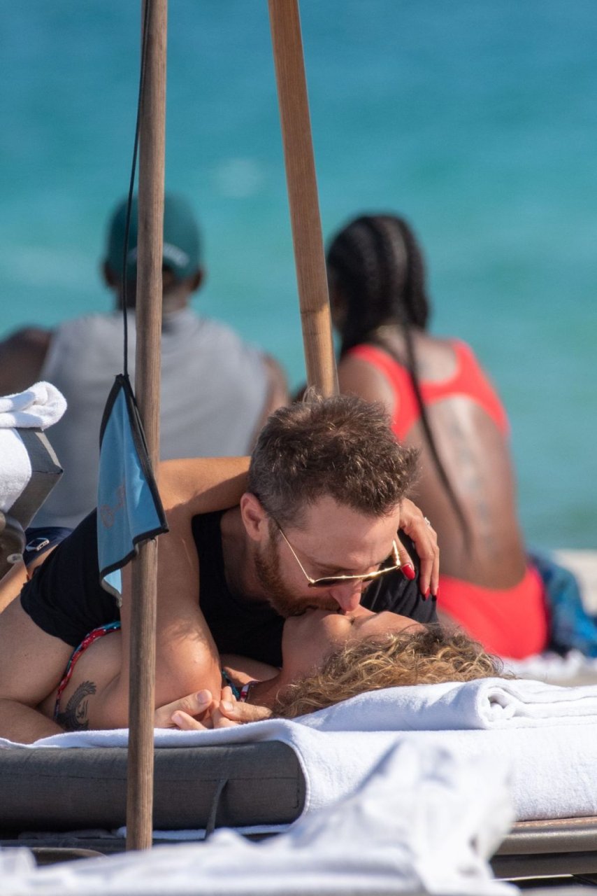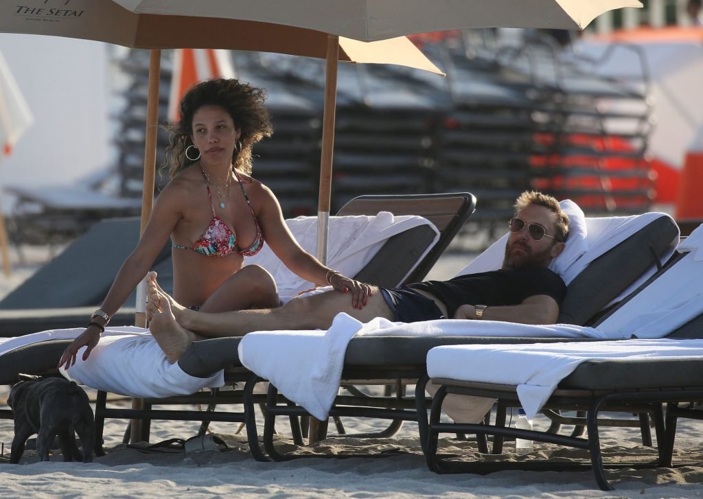 Dj David Guetta y su novia Jessica Ledon tienen besos apasionados en la playa de Miami Beach, 12/03/2019. Jess mostró sus curvas mientras jugaba con el perro.