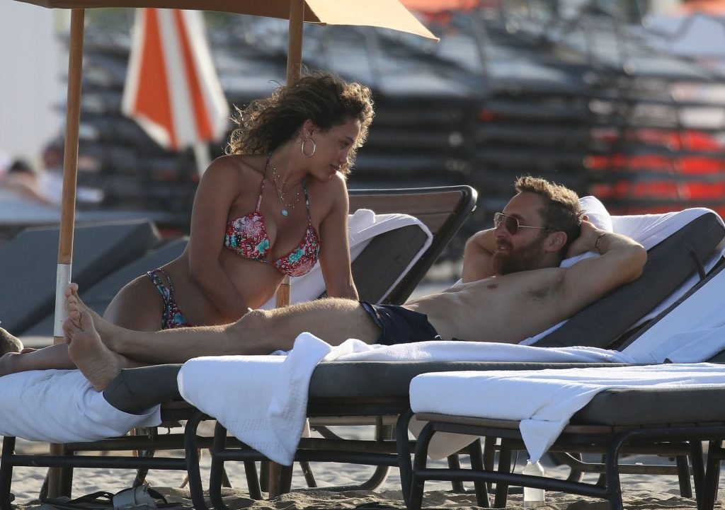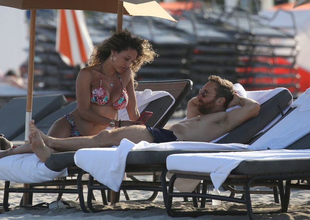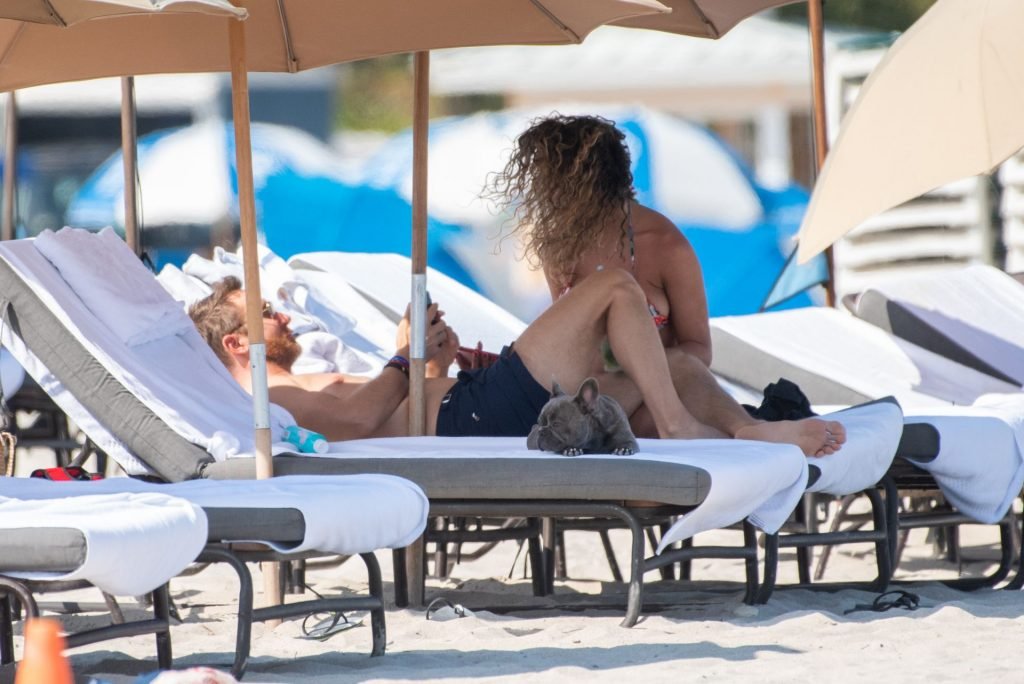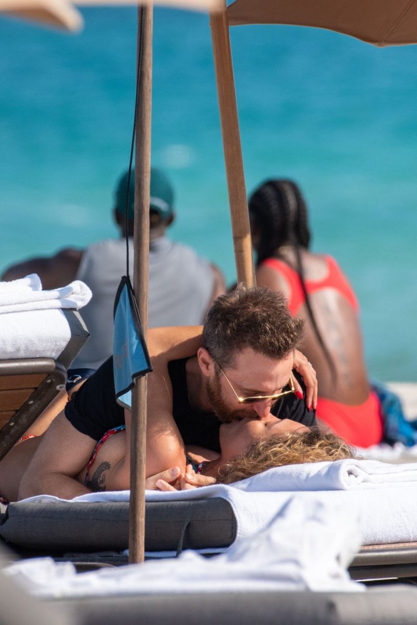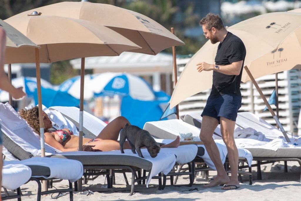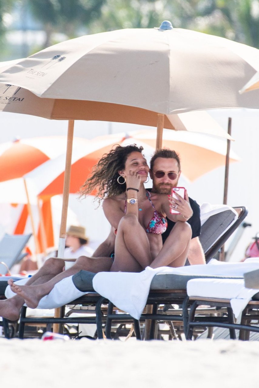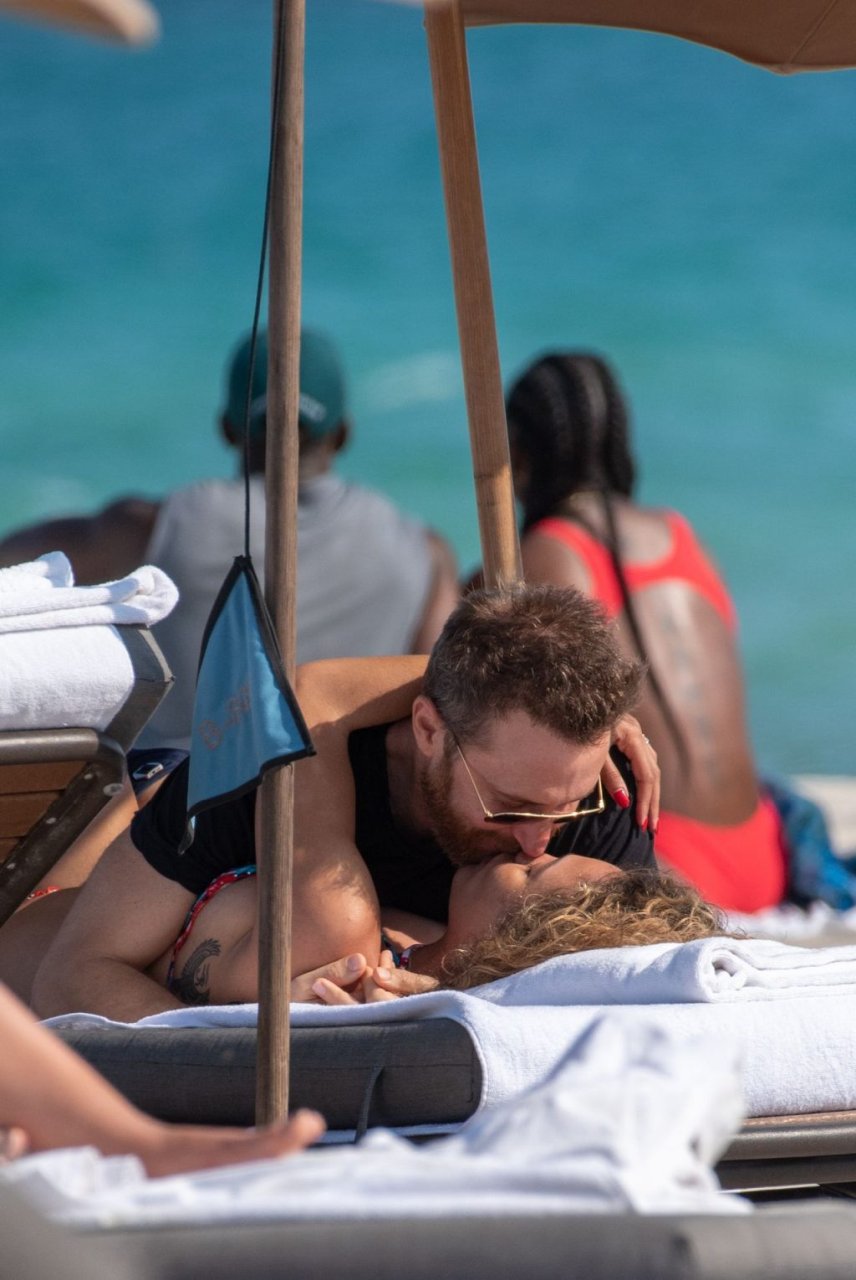 Dj David Guetta y su novia Jessica Ledon tienen besos apasionados en la playa de Miami Beach, 12/03/2019. Jess mostró sus curvas mientras jugaba con el perro.