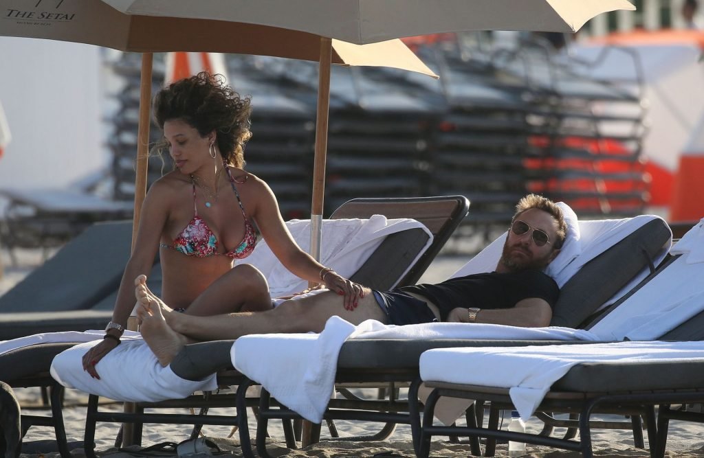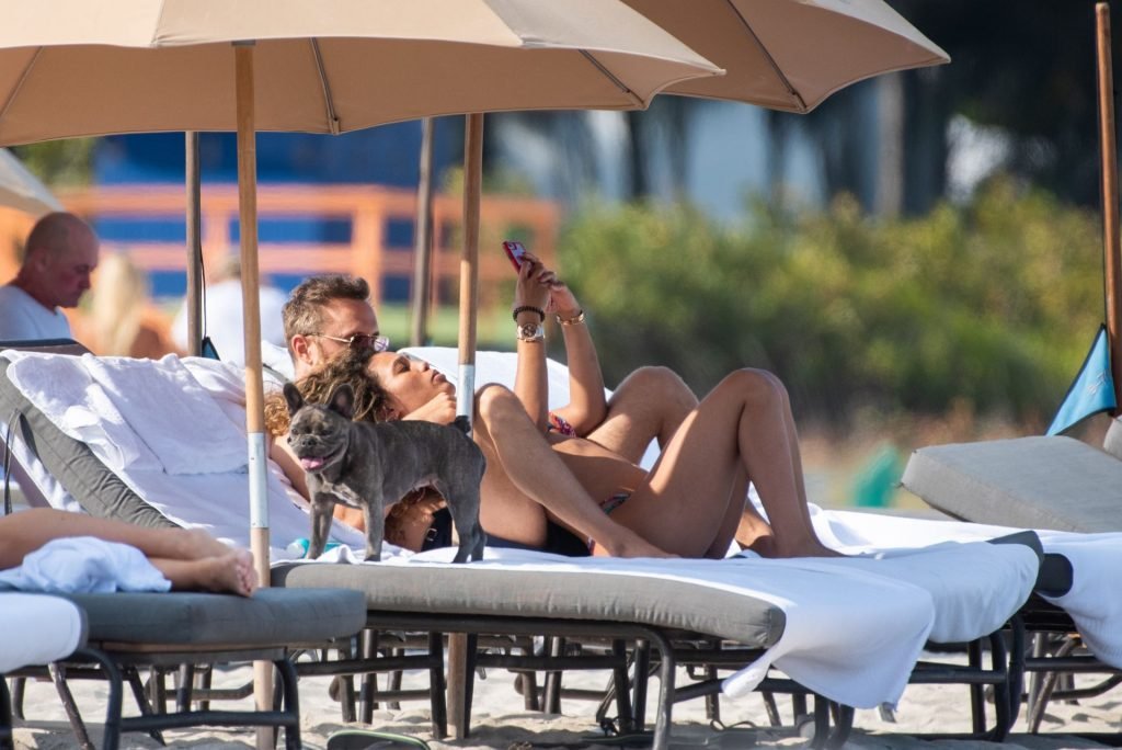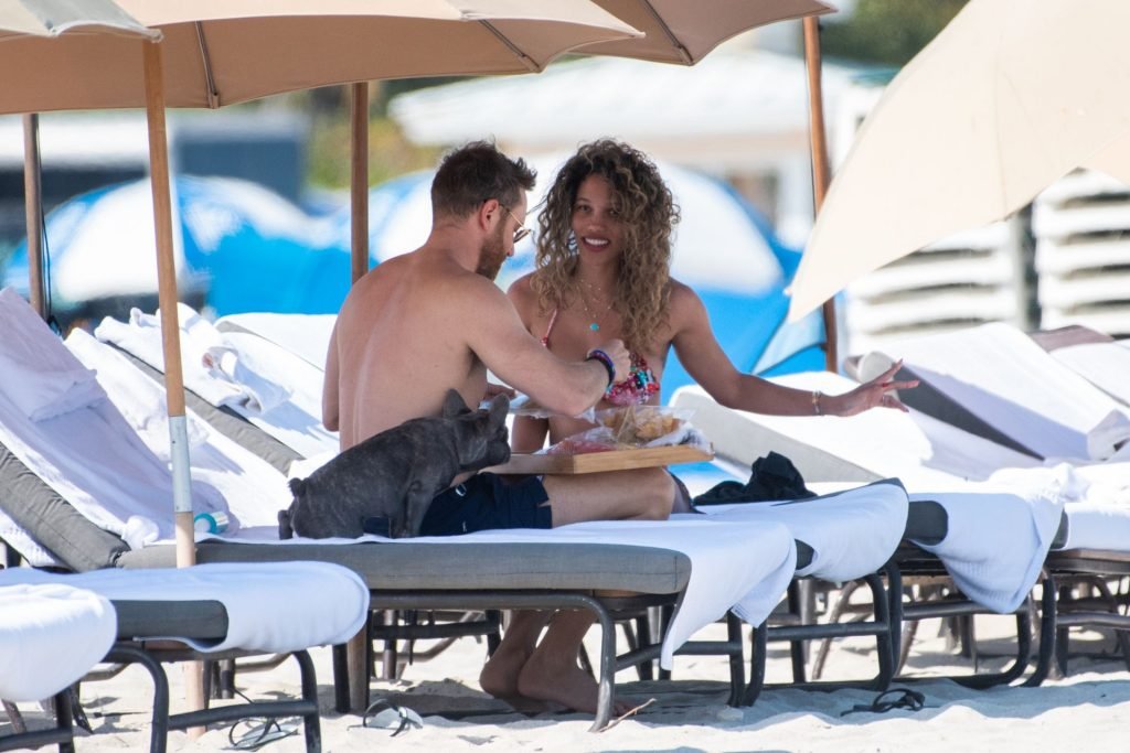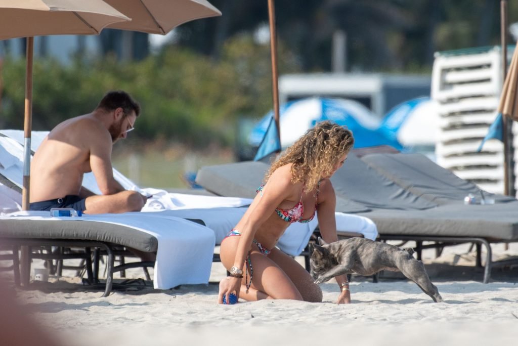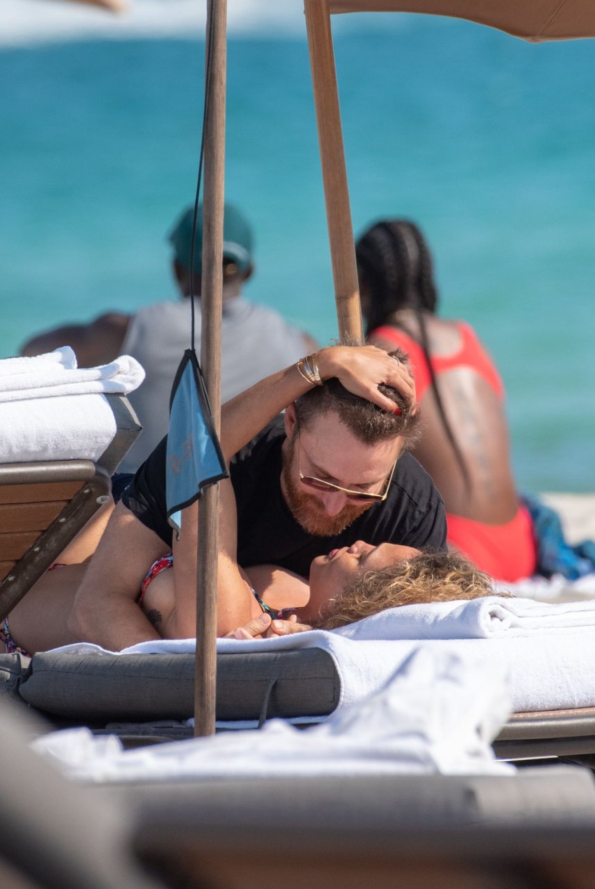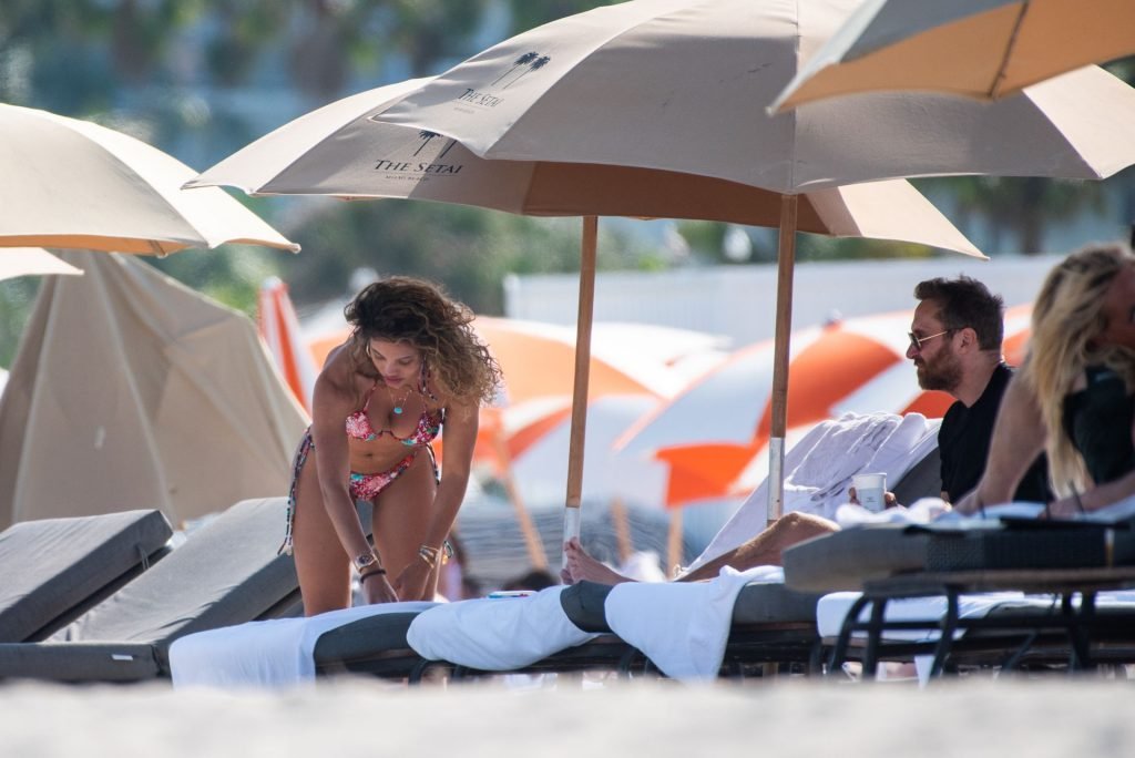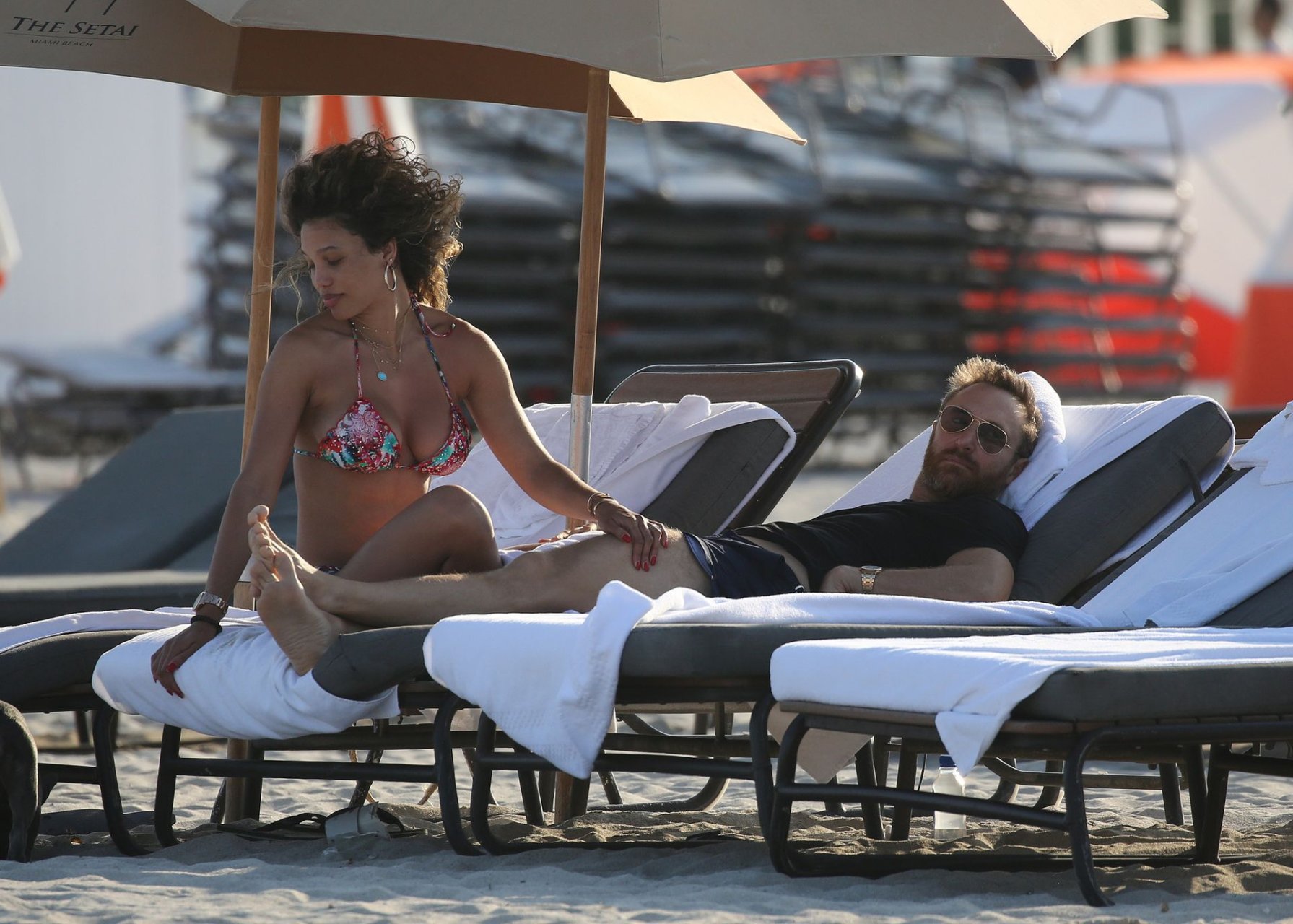 Dj David Guetta y su novia Jessica Ledon tienen besos apasionados en la playa de Miami Beach, 12/03/2019. Jess mostró sus curvas mientras jugaba con el perro.