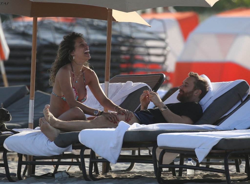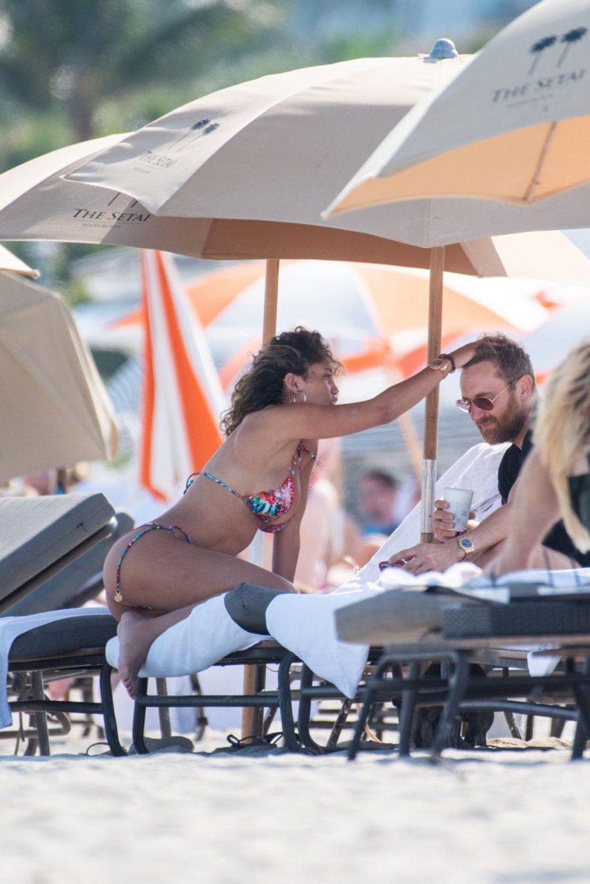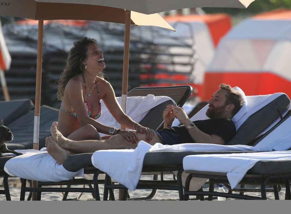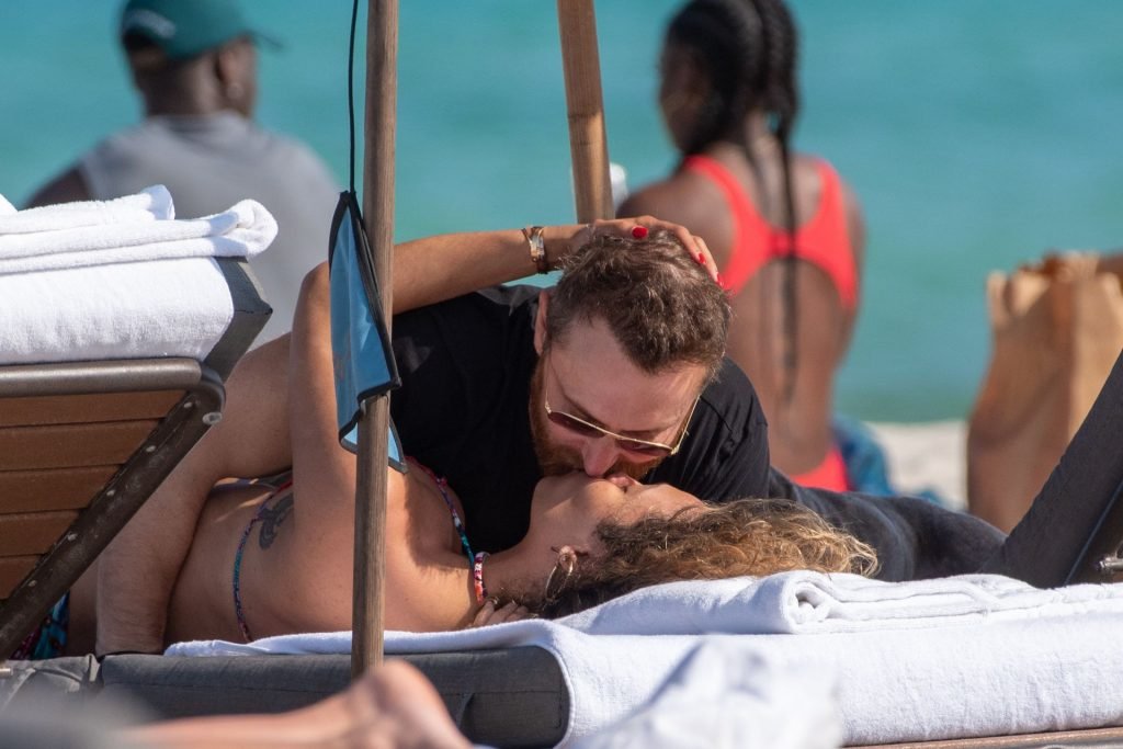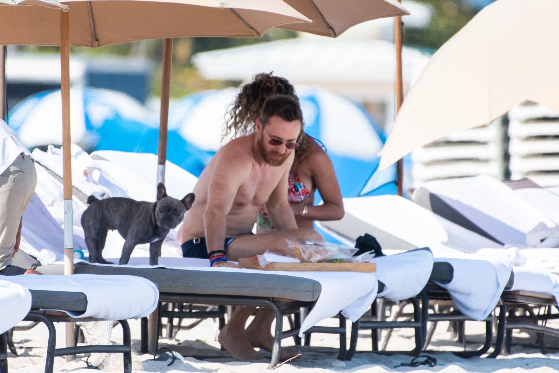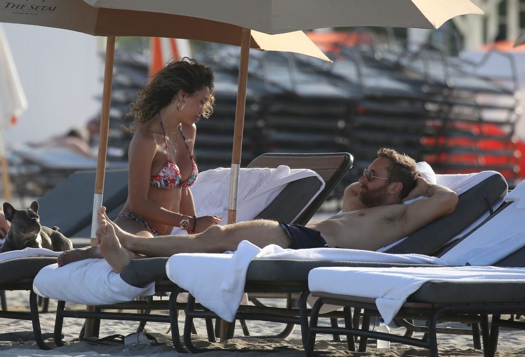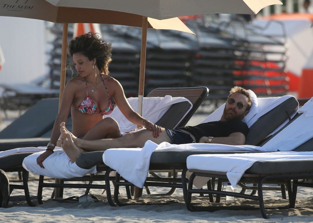 Dj David Guetta y su novia Jessica Ledon tienen besos apasionados en la playa de Miami Beach, 12/03/2019. Jess mostró sus curvas mientras jugaba con el perro.