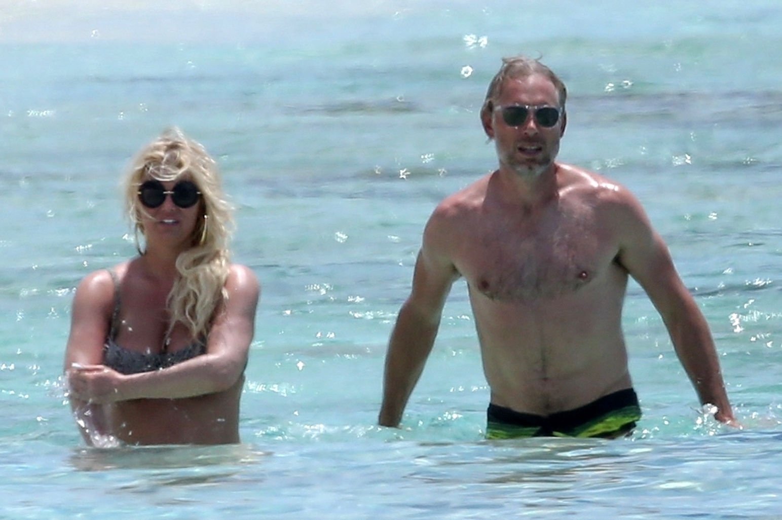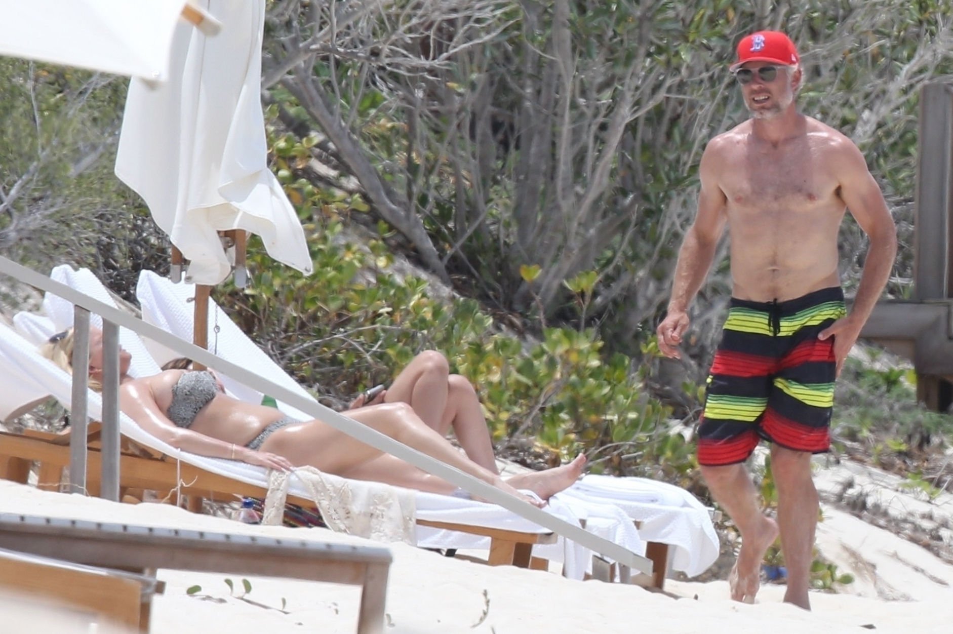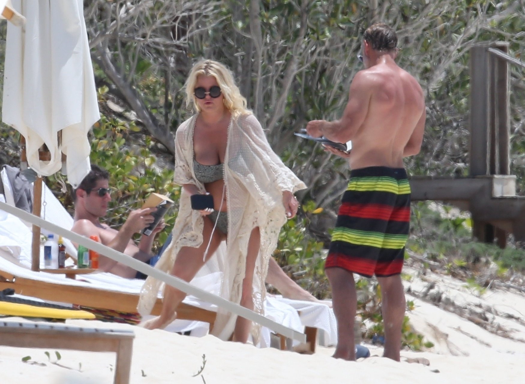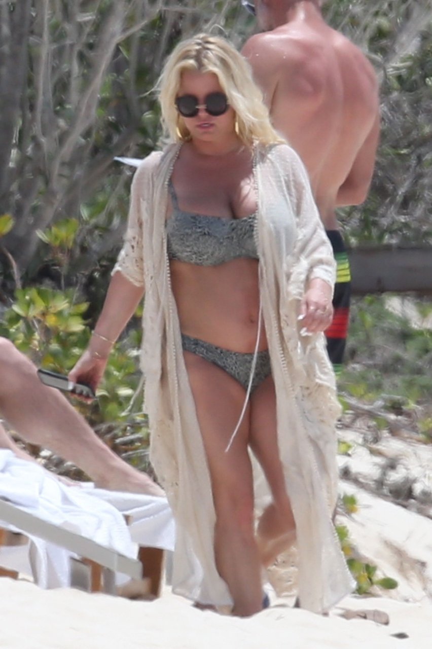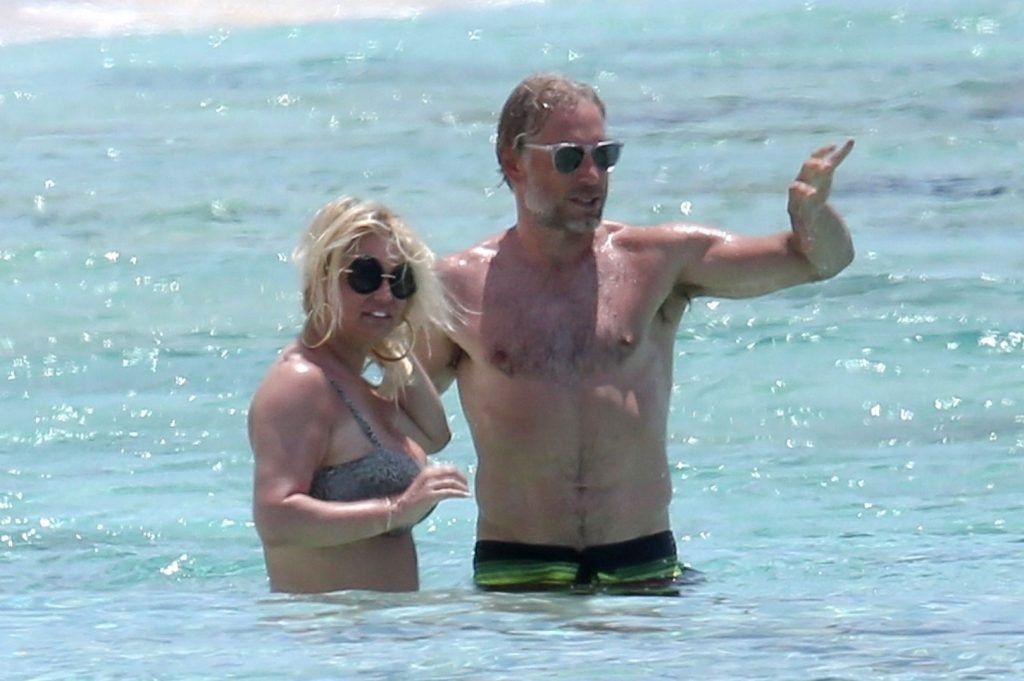 Jessica Ann Simpson y su esposo Eric Johnson disfrutan del día en la playa en las Bahamas con su amigo, 27/04/2018. La Jessica de 37 años se ve tomando el sol con un conjunto de dos piezas de estampado de leopardo mientras Eric muestra su físico tonificado mientras practica paddleboarding.