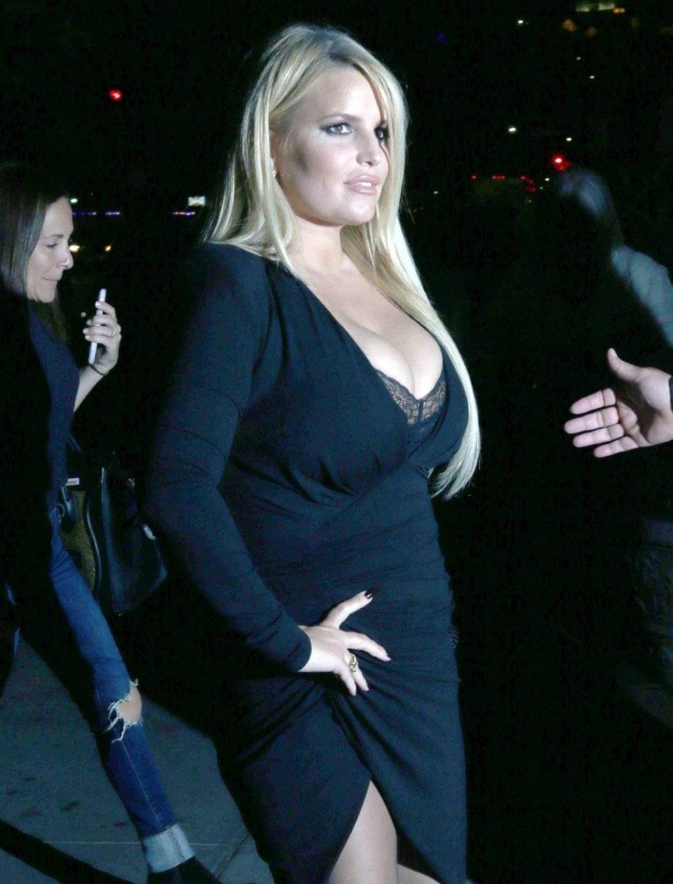 La actriz/cantante/presentadora de televisión estadounidense Jessica Simpson luce un escote pronunciado mientras la estrella muestra su reciente pérdida de peso en la ciudad de Nueva York, 25/09/2019. Sufre un pequeño fallo de vestuario en la parte inferior de su revelador vestido mientras regresa a su hotel tras la cena