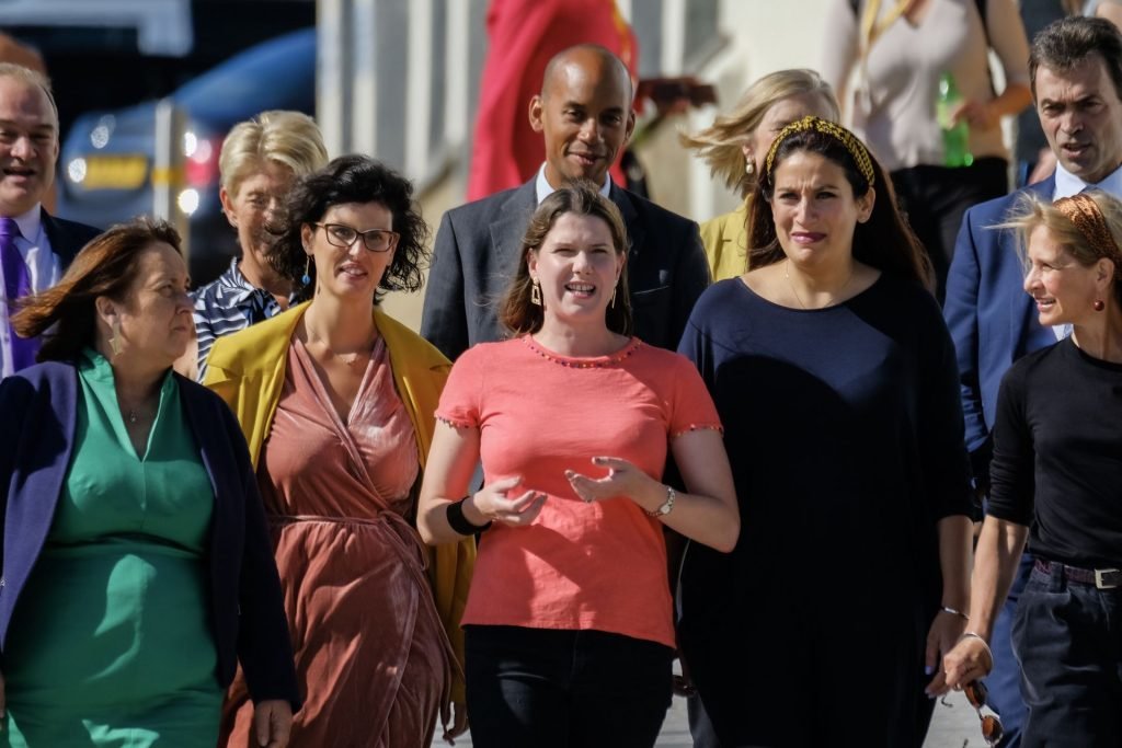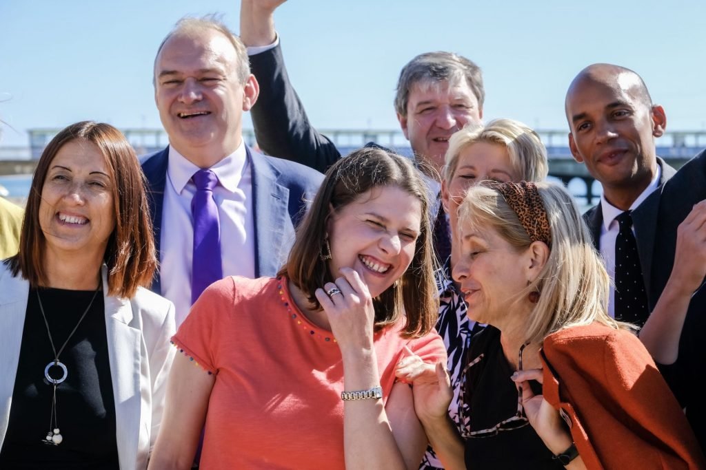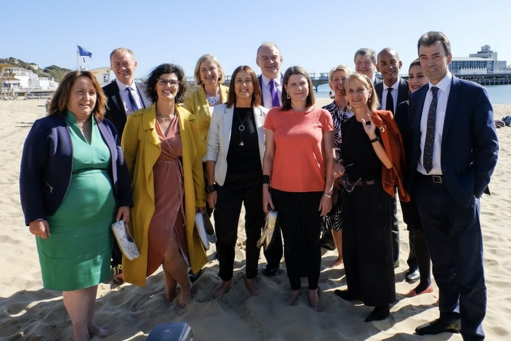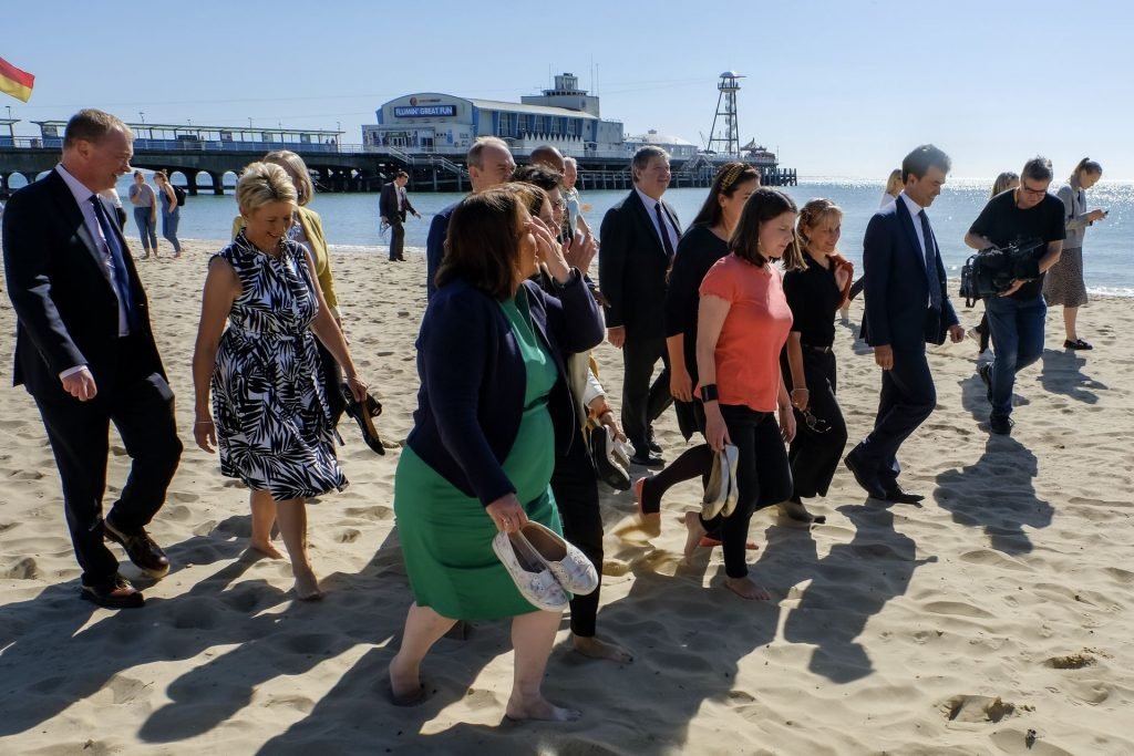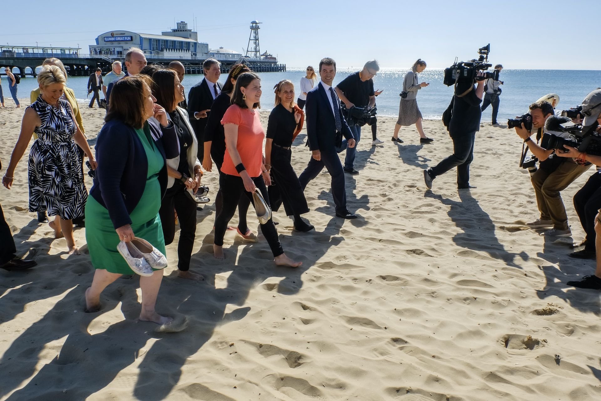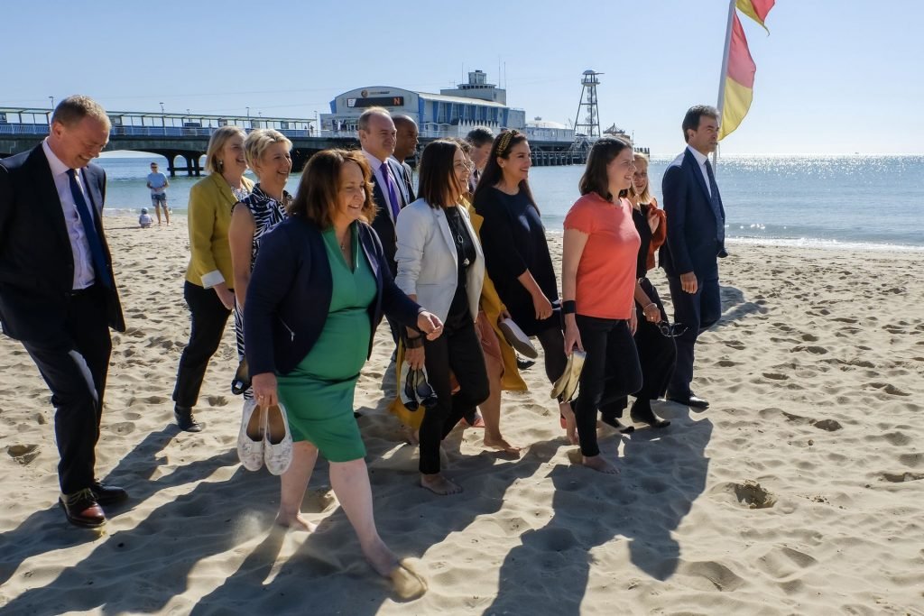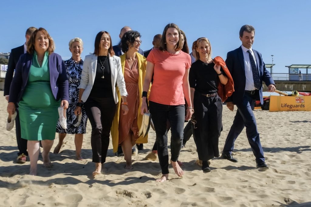 Jo Swinson, líder de los Liberal Demócratas, con un busto prominente, camina por la playa de Bournemouth junto a sus compañeros diputados y miembros del gabinete en el último día de la Conferencia de Otoño de los Liberal Demócratas 2019, 17/09/2019. La conferencia se celebra en el Centro Internacional de Bournemouth, con el discurso principal de Jo cerrando la reunión ese día.