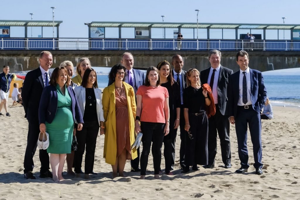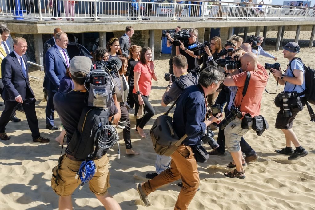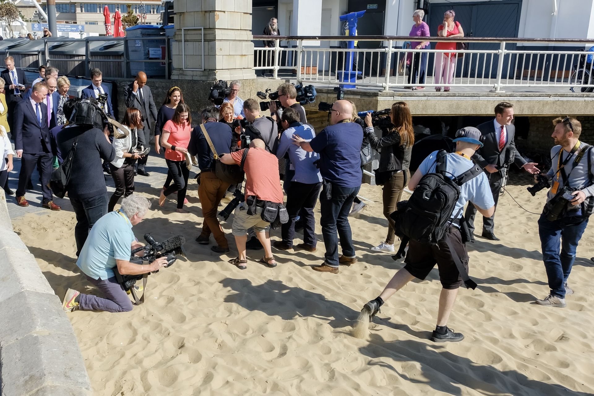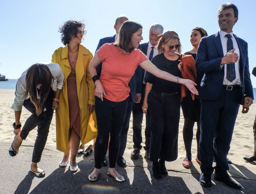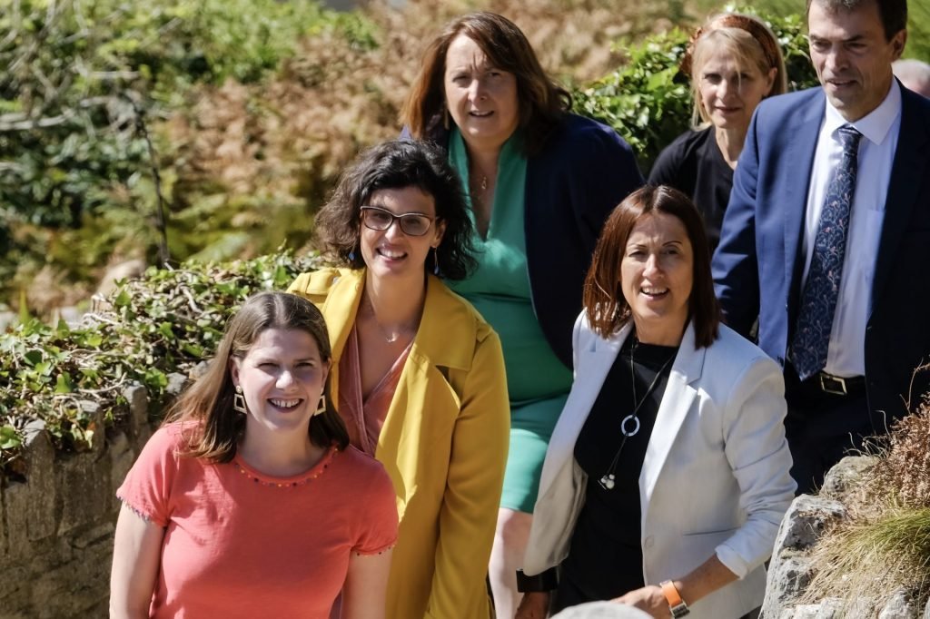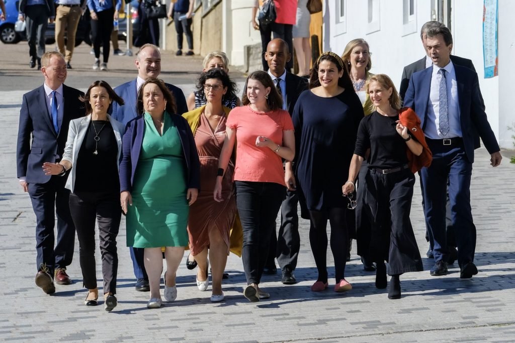 Jo Swinson, líder de los Liberal Demócratas, con un busto prominente, camina por la playa de Bournemouth junto a sus compañeros diputados y miembros del gabinete en el último día de la Conferencia de Otoño de los Liberal Demócratas 2019, 17/09/2019. La conferencia se celebra en el Centro Internacional de Bournemouth, con el discurso principal de Jo cerrando la reunión ese día.